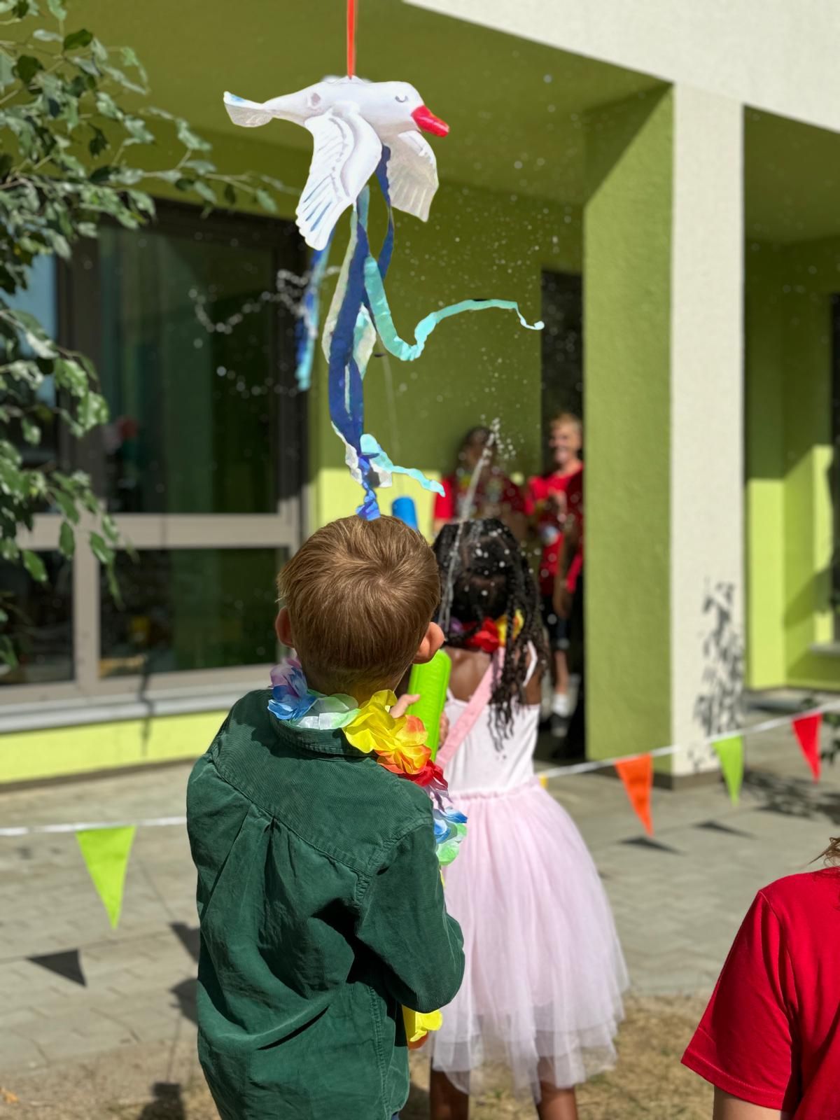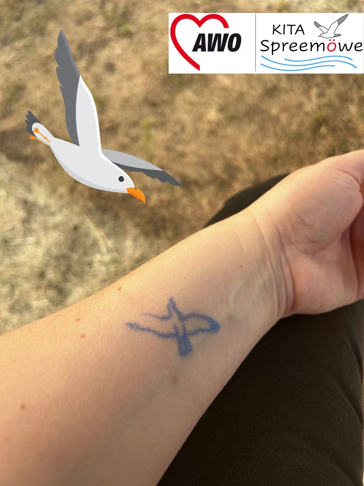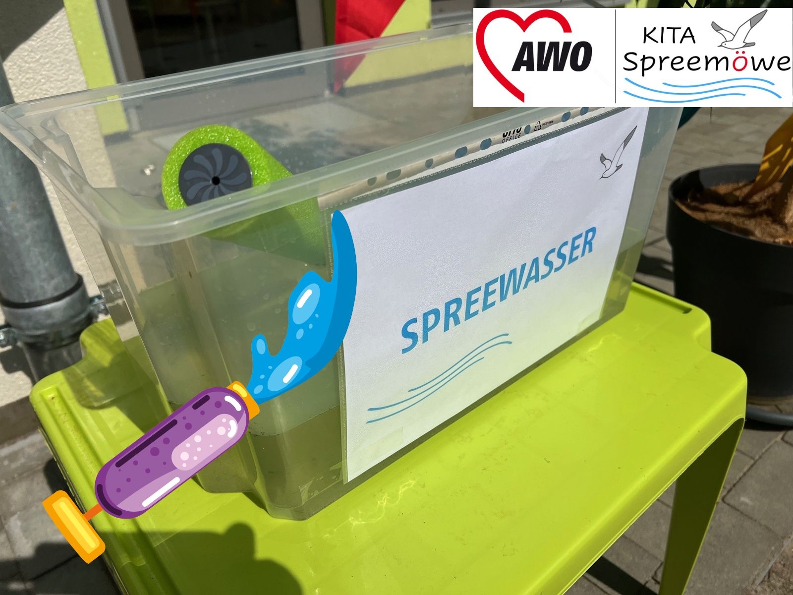 Höhepunkt des Nachmittags war jedoch die Namenstaufe. Die bisher „namenlose“ AWO Kita in Alt-Stralau erhielt einen Namen, der zuvor gemeinsam im Team und mit den Kindern bestimmt worden war. Eine Möwe von der nahen Spree ist nun Namenspatron der Kita. Zünftig mit Spreewasser, das die Kinder am Tag zuvor mit ihren Eimerchen von der Spree geholt hatten, wurde die Kita getauft.