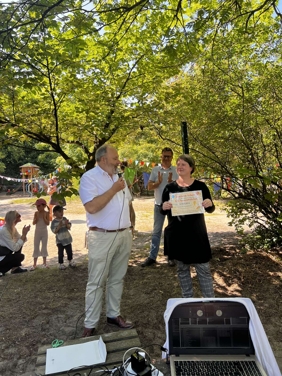 Im Anschluss ergriff der Kreisvorsitzende der AWO Spree-Wuhle, Christian Meyerdierks, das Wort, um für den nunmehr bereits seit 20 Jahren Träger der Kita ebenfalls Danke zu sagen. Er erinnerte an die großen Veränderungen in und für die Kita in diesen Jahren, an die erreichte Kontinuität und Stabilität in der Einrichtung, die auch die baulichen Belastungen, wie bauliche Sanierung und Brandschutzsanierung, zu meistern halfen. Er hob besonders die personelle Kontinuität hervor, viele Kolleg*innen sind der Kita zum Teil bis zu 30 Jahre treu, was sicher nicht alltäglich ist und deshalb für den guten Spirit in der Kita spricht. Zu einem Geburtstag gibt es Geschenke, deshalb bedankte sich der Träger mit einem Gutschein über 4.000€, der sicher gute Verwendung finden wird.