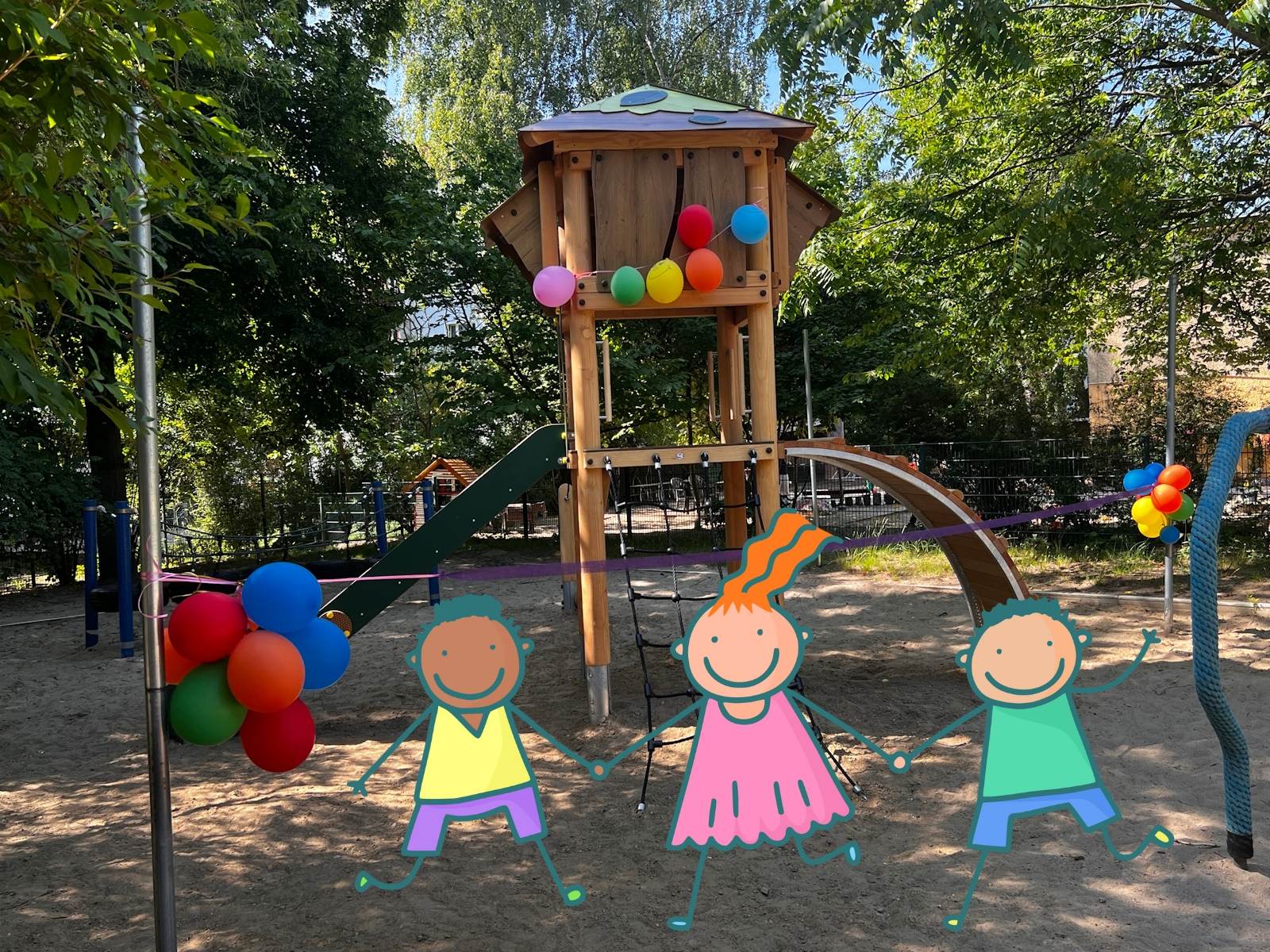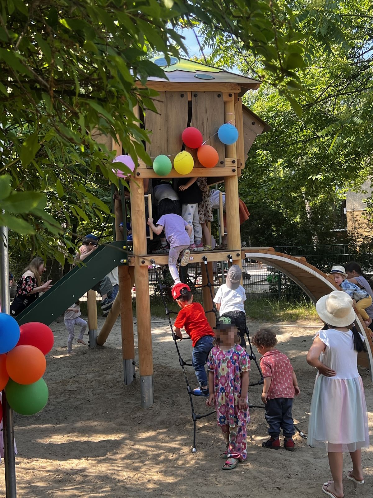 Danach sollte es die Einweihung des neuen Kletterturms im Garten geben, doch bevor es offiziell und nach Plan so weit war, hatten die Kinder die Macht ergriffen und kurzerhand ohne Band durchschneiden schon den Kletterturm erobert.