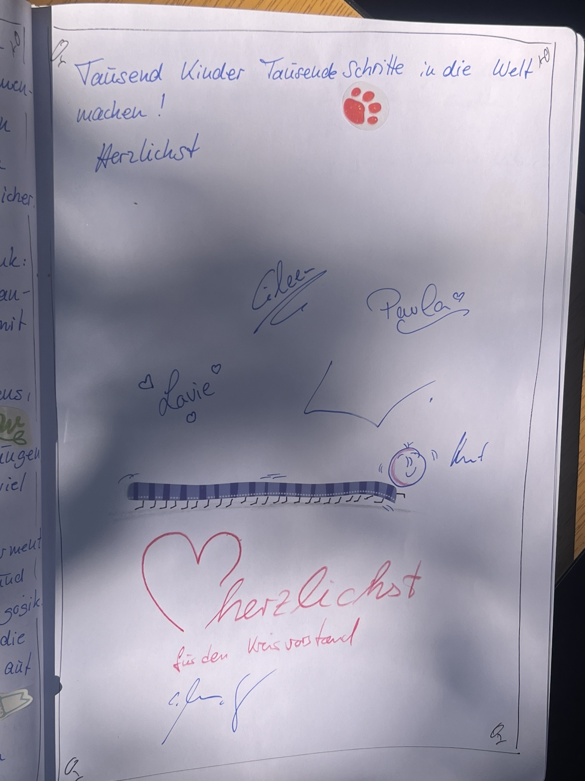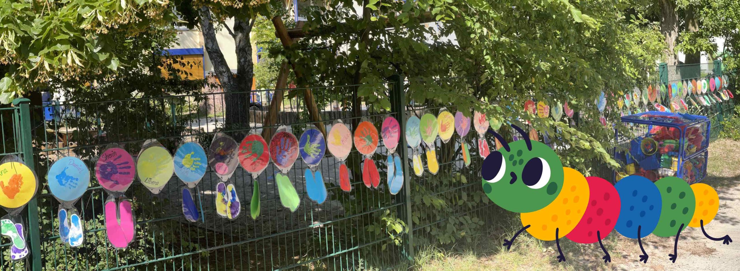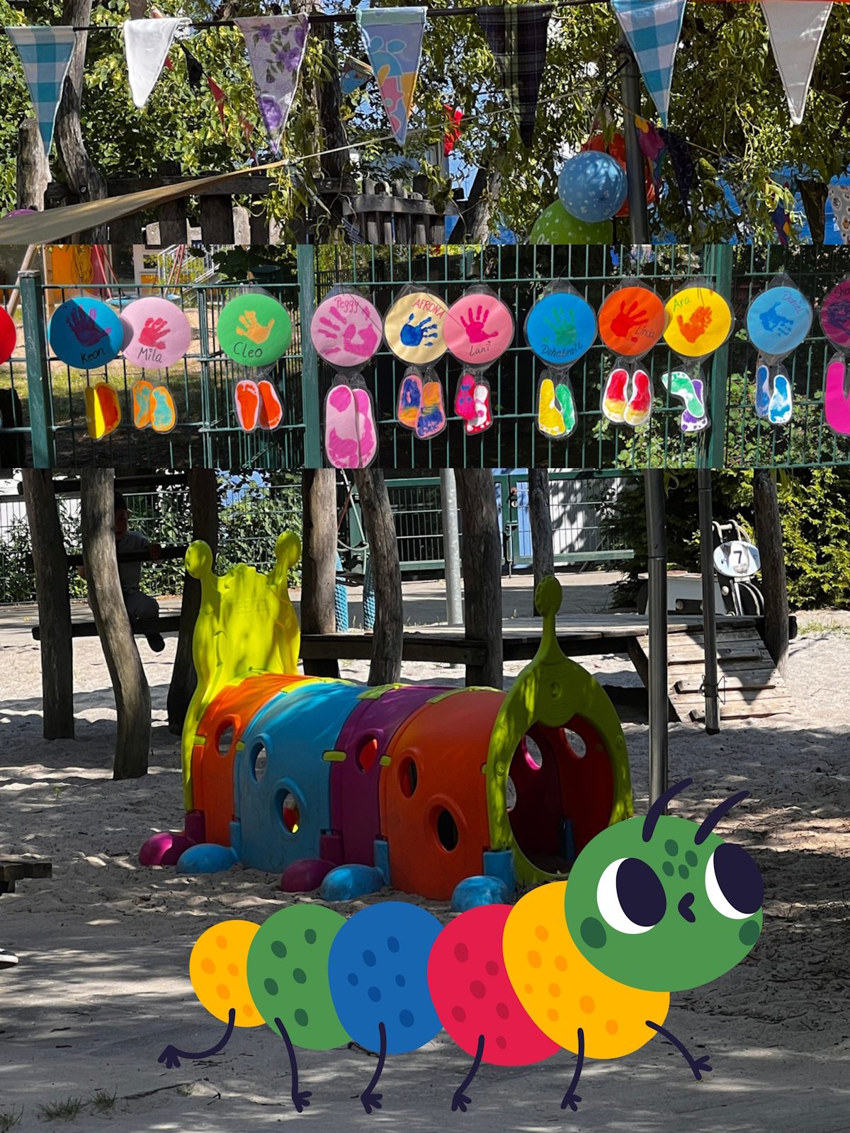 Das tat der guten Laune keinen Abbruch, alle hatten viel Spaß und gute Laune in einem prächtig und festlich geschmückten Garten. Unübersehbar war entlang des Zaunes das TAUSENDFÜßCHEN gestaltet aus Hand- und Fußabdrücken der Kita-Kinder.