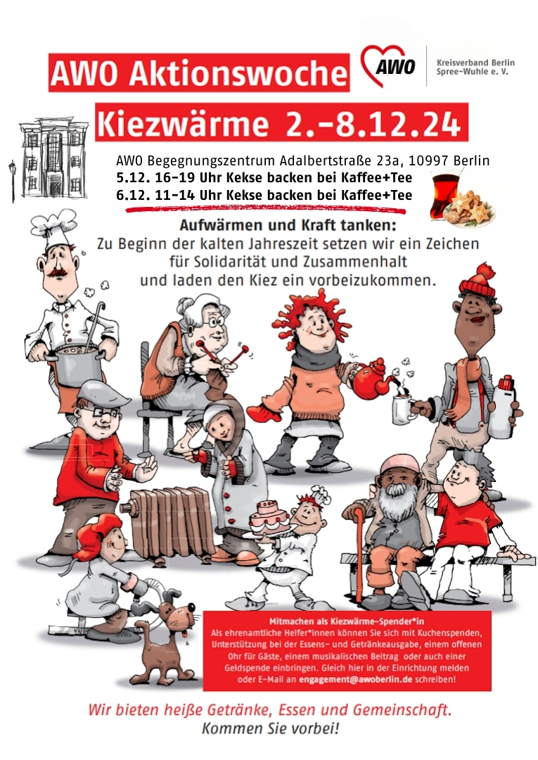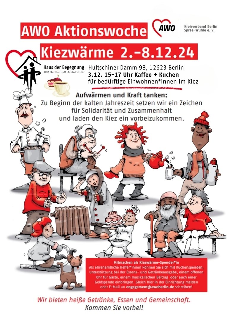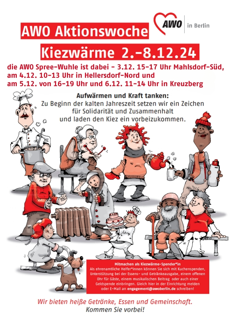 Vom 2. – 8. Dezember setzt die AWO Berlin mit der Aktionswoche Kiezwärme zu Beginn der kalten Jahreszeit ein Zeichen für Solidarität und Zusammenhalt und lädt Menschen aus dem Kiez ein, vorbeizukommen und bei heißen Getränken und Essen in Gemeinschaft sich aufzuwärmen und Kraft zu tanken. Die AWO Berlin Spree-Wuhle ist natürlich dabei.