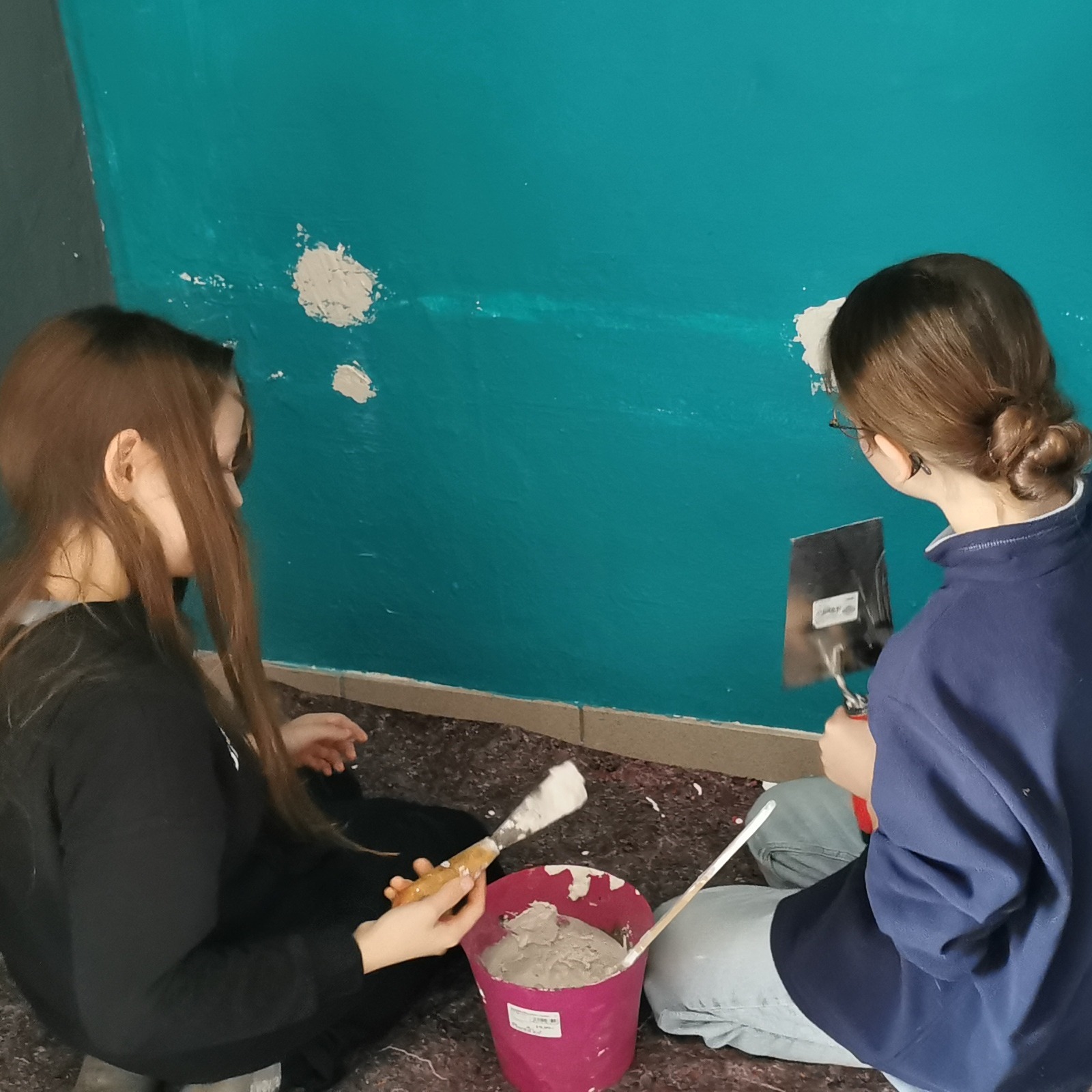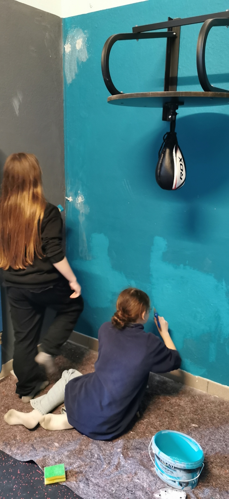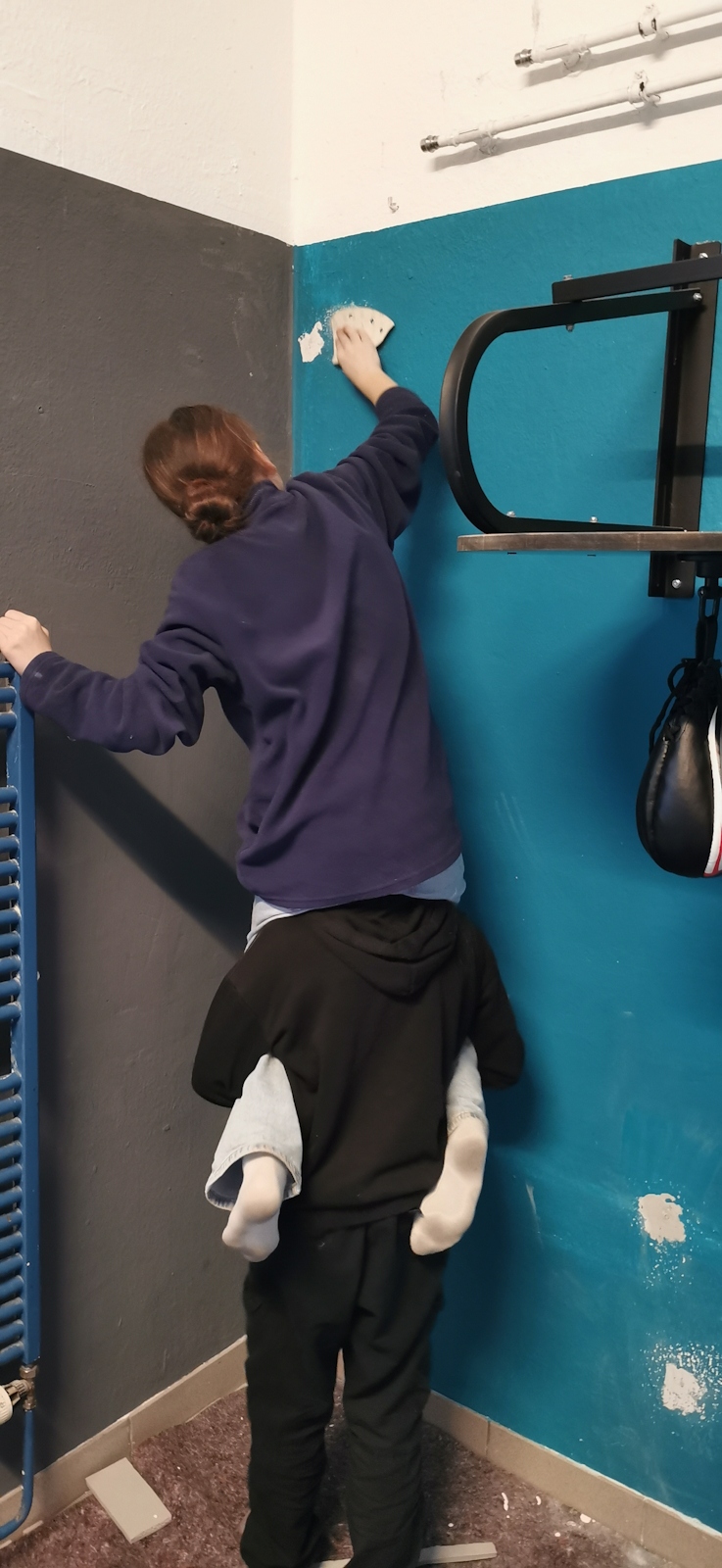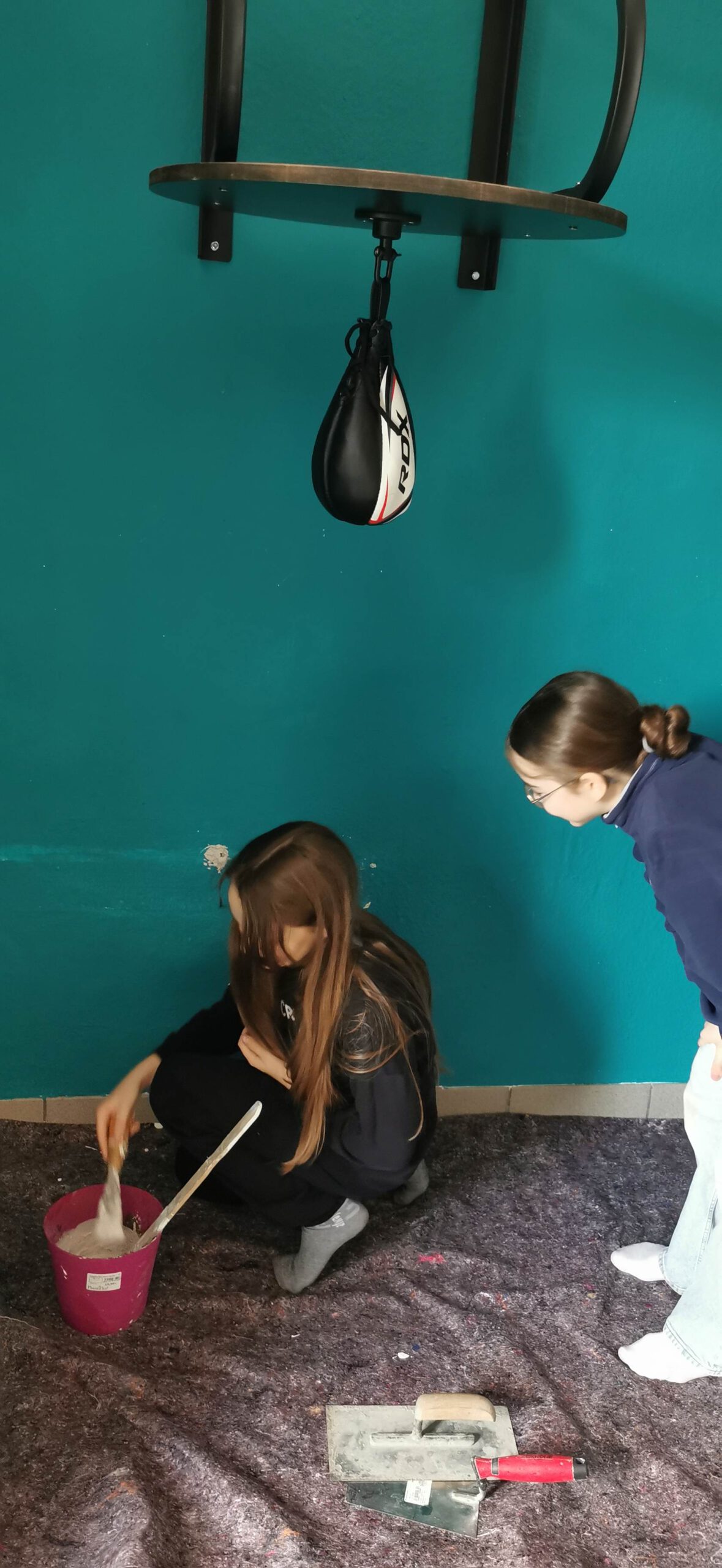 Im vergangenen Sommer wurde der Sportraum für die Boxen AG renoviert. Die alten Wasserleitungen blieben dran, wurden erst jetzt zurückgebaut. Das sah nicht schön aus. Also haben sich haben sich zwei Mädchen bereiterklärt die Löcher zuzuspachteln und zu malern. Eine gute Gelegenheit, mal etwas Neues auszuprobieren und sich zu beweisen.