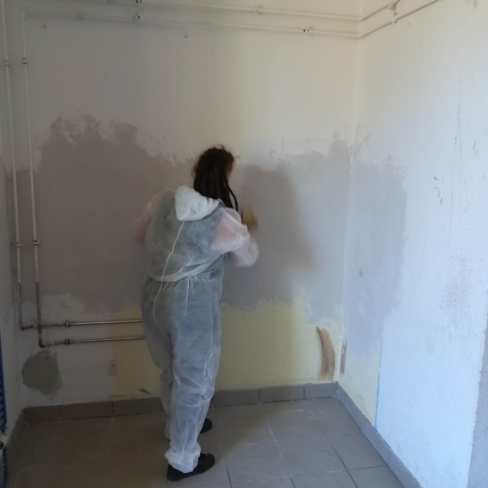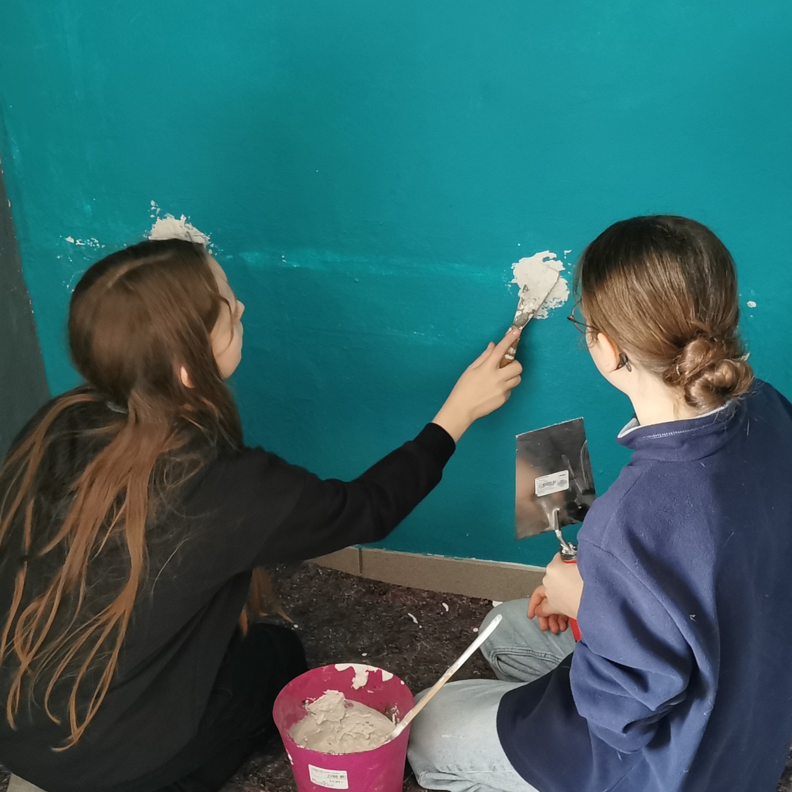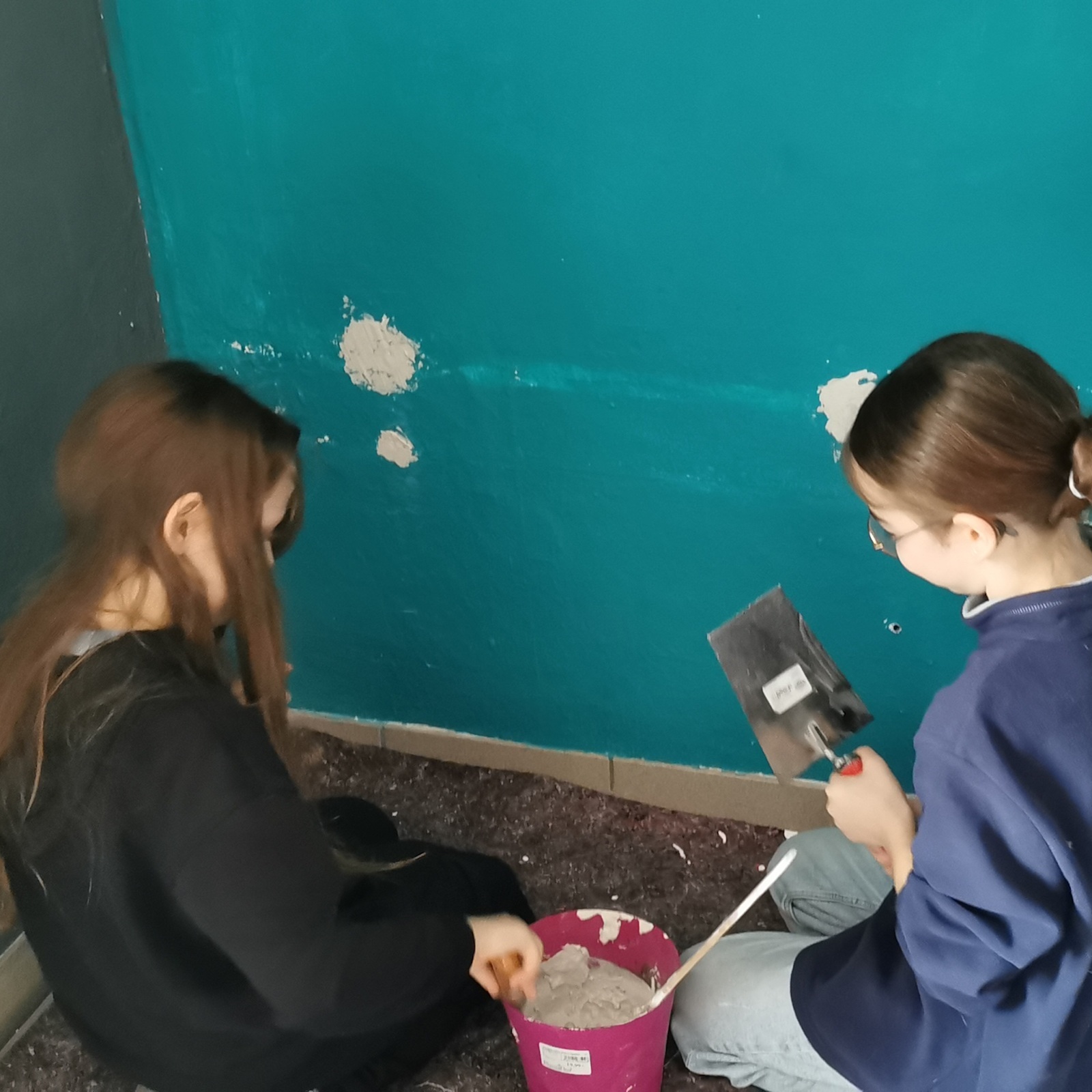 Im vergangenen Sommer wurde der Sportraum für die Boxen AG renoviert. Die alten Wasserleitungen blieben dran, wurden erst jetzt zurückgebaut. Das sah nicht schön aus. Also haben sich haben sich zwei Mädchen bereiterklärt die Löcher zuzuspachteln und zu malern. Eine gute Gelegenheit, mal etwas Neues auszuprobieren und sich zu beweisen.