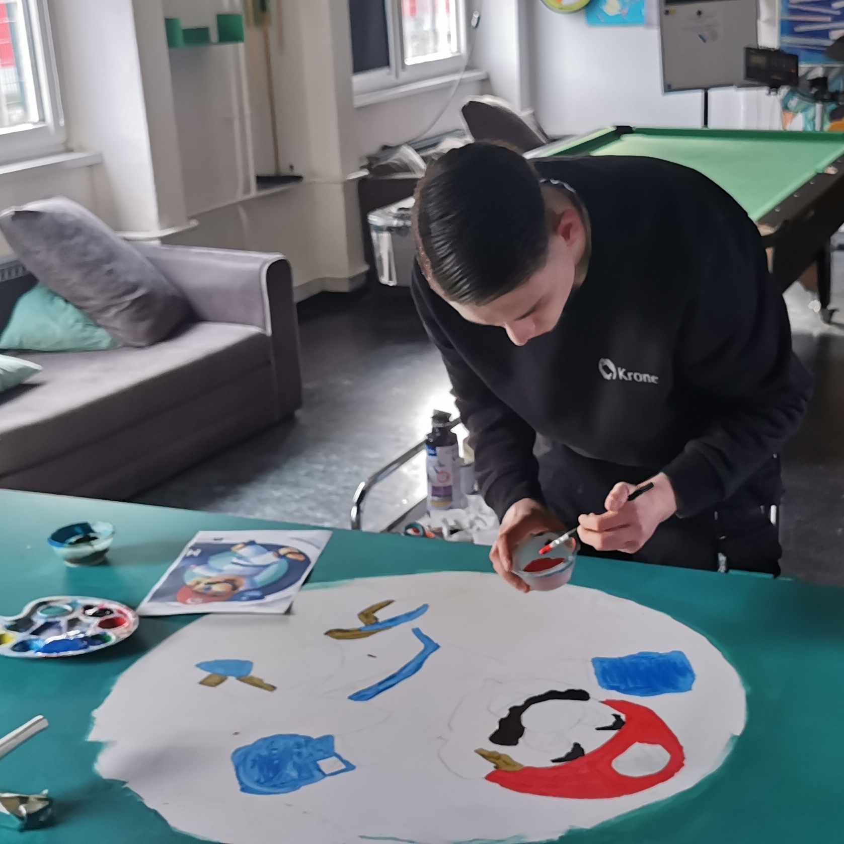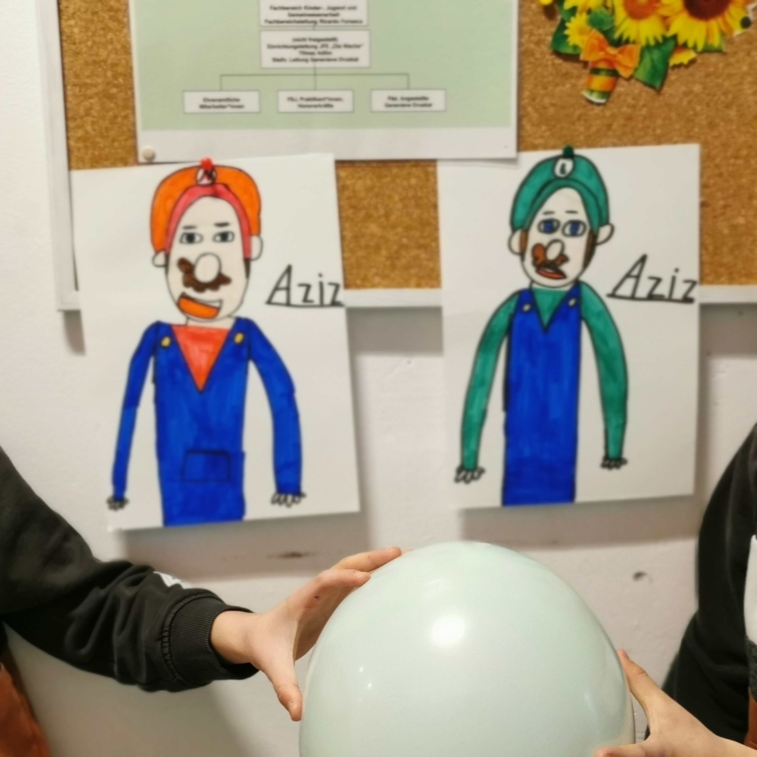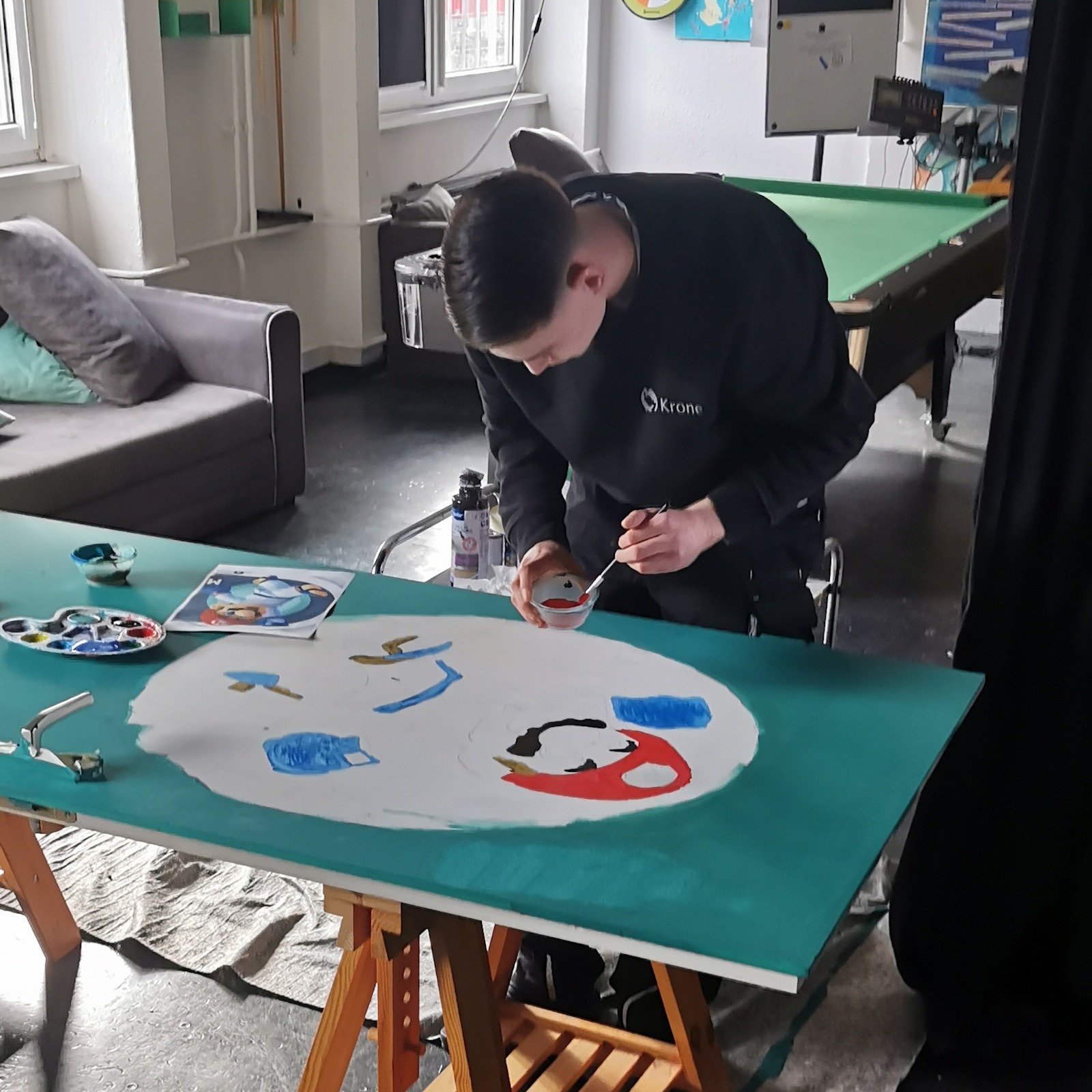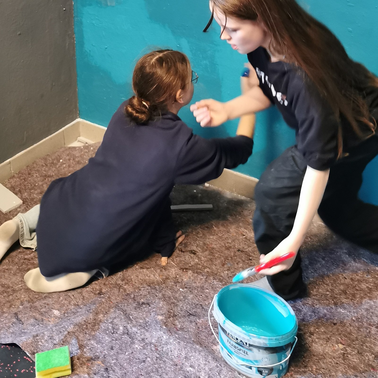 Im vergangenen Sommer wurde der Sportraum für die Boxen AG renoviert. Die alten Wasserleitungen blieben dran, wurden erst jetzt zurückgebaut. Das sah nicht schön aus. Also haben sich haben sich zwei Mädchen bereiterklärt die Löcher zuzuspachteln und zu malern. Eine gute Gelegenheit, mal etwas Neues auszuprobieren und sich zu beweisen.