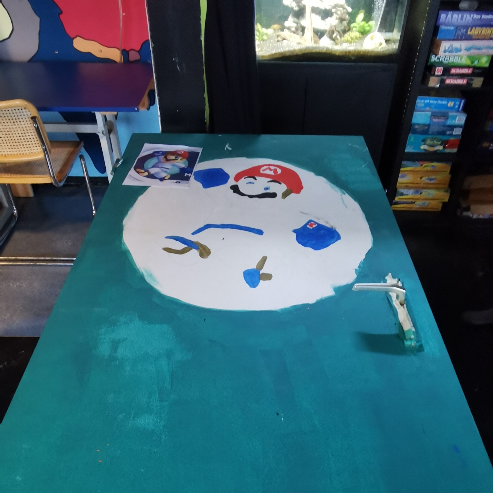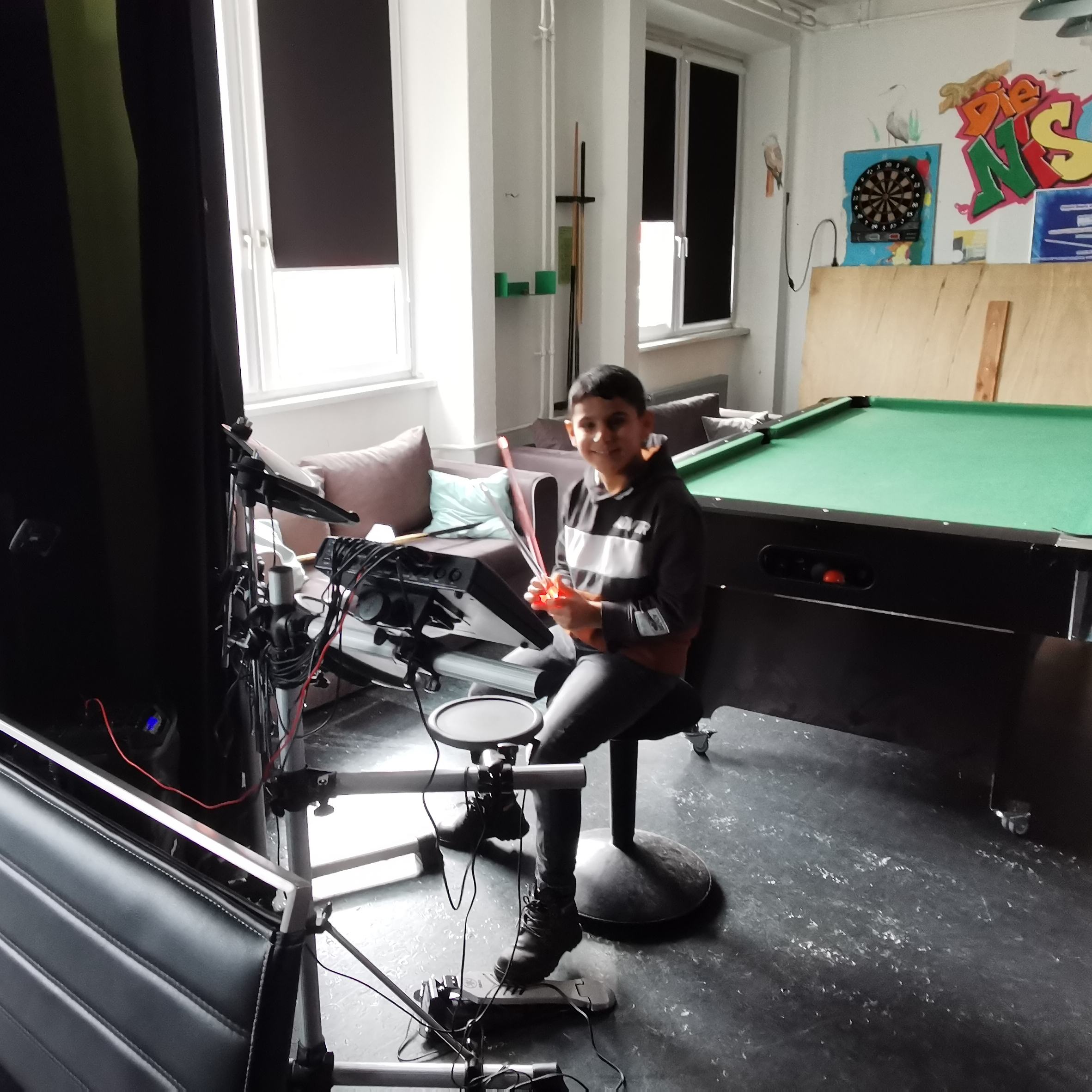 Mario und Luigi haben auch nach 40 Jahren noch immer viele begeisterte Freunde, manche kommen deswegen fast täglich in die Nische und auch die Tür zum Spieleparadies wurde entsprechend gestaltet. Und wenn man dann schon mal da ist, muss auch das E-Drum ausprobiert werden.