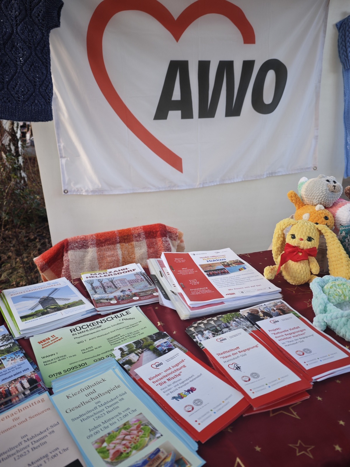 Zum ersten Mal hat die AWO STT Mahlsdorf‑Süd Begegnungsstätte am 20. Dezember beim 🎄Weihnachtsmarkt auf dem Vereinsgelände des BSV-Eintracht Mahlsdorf e.V. teilgenommen – und die Premiere war ein voller Erfolg. Trotz der kurzfristigen Organisation, erst am Vorabend kam eine Information, wurde ein Stand aufgebaut, der viel Interesse fand, es gab keine Besucher*innen, die einfach vorbeigelaufen wären und nicht stehen blieben. Sogar RBB hat gefilmt 😊.