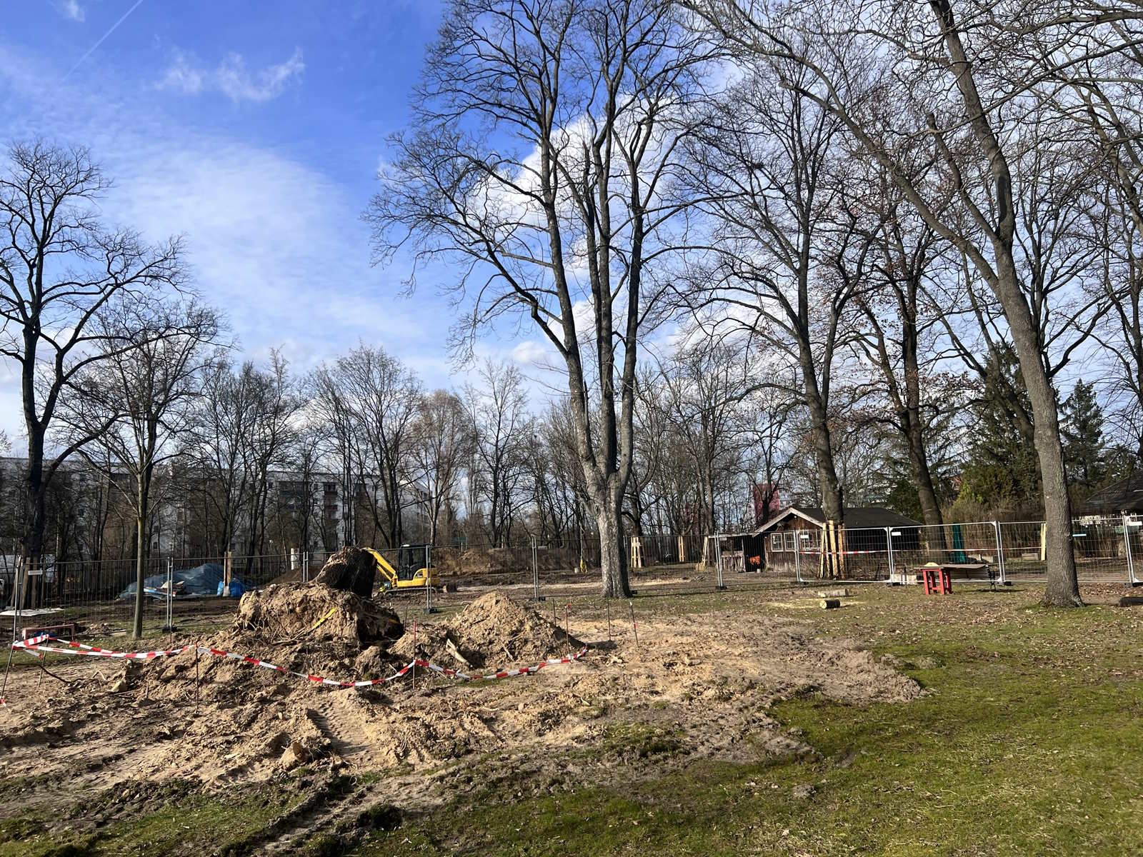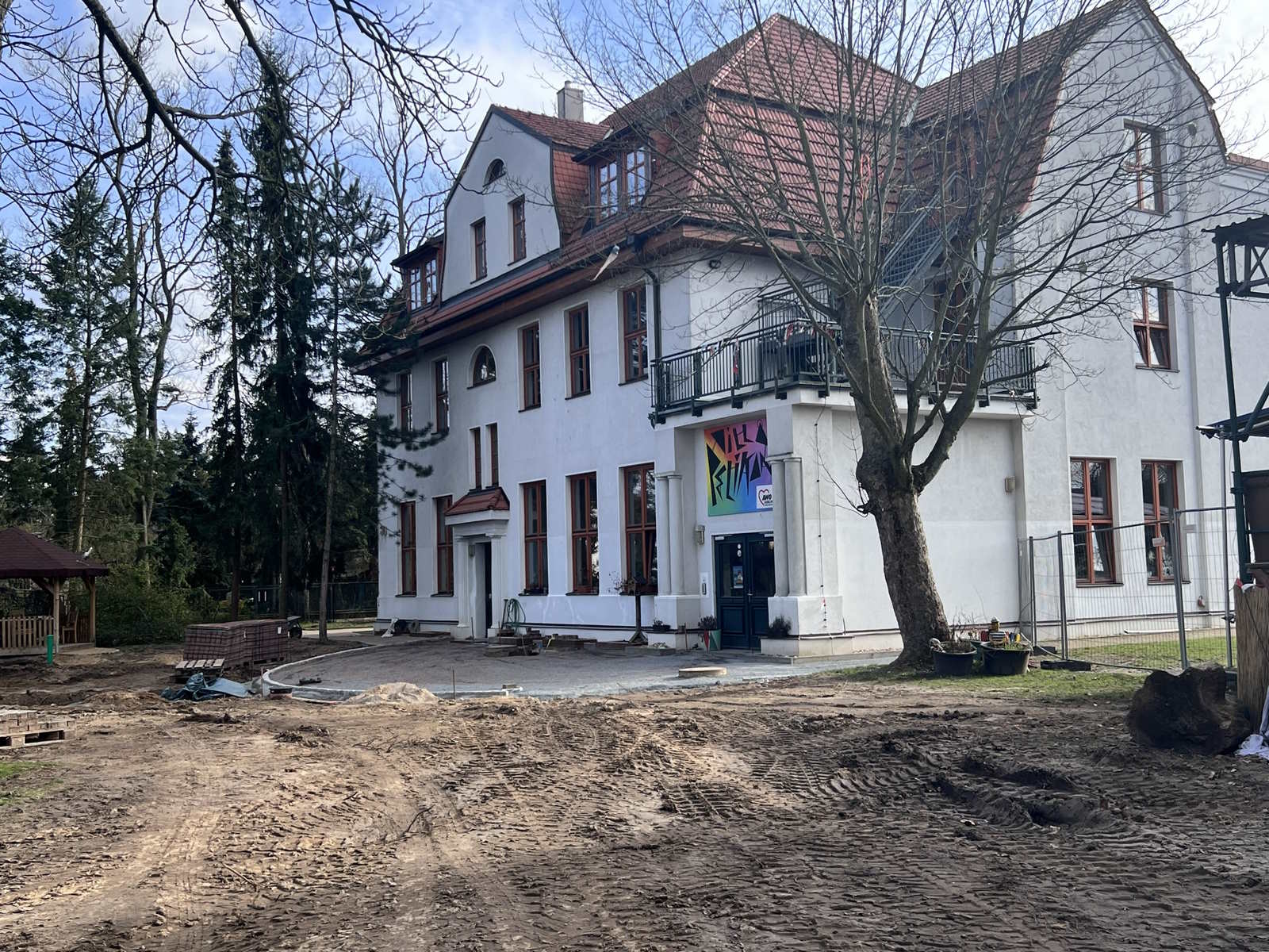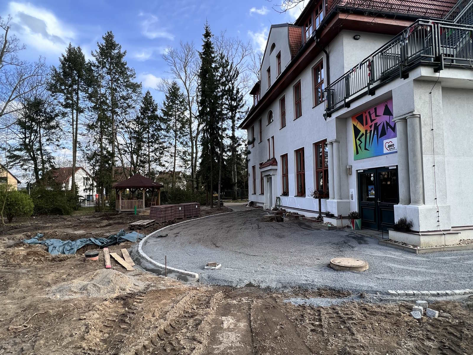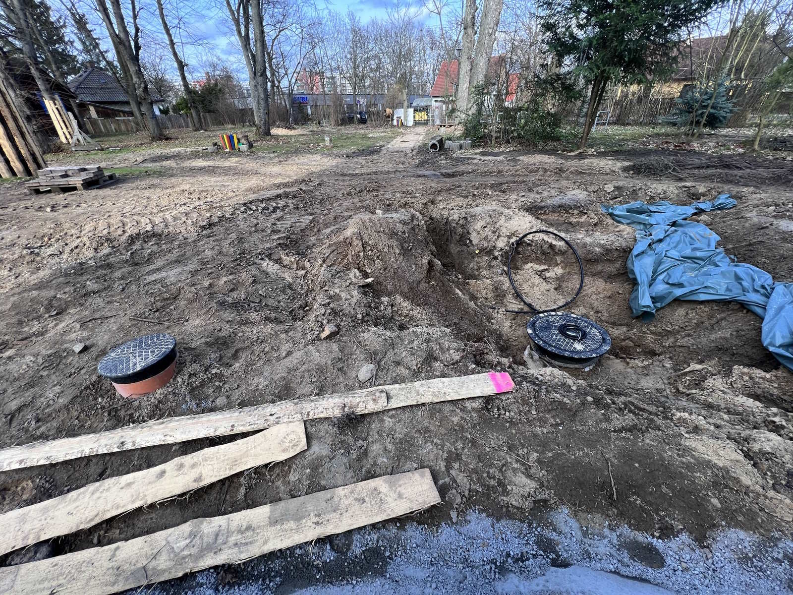 Auf der Baustelle findet noch immer vor allem Tiefbau statt, der Platz und Grundlage für die kreative Neugestaltung schafft. Von der Hausterrasse wird der neue, dann repräsentative Hauptweg zum Eingangstor verlegt werden, das an der Hellersdorfer Straße ein paar Meter Richtung Straßenkreuzung wandert.