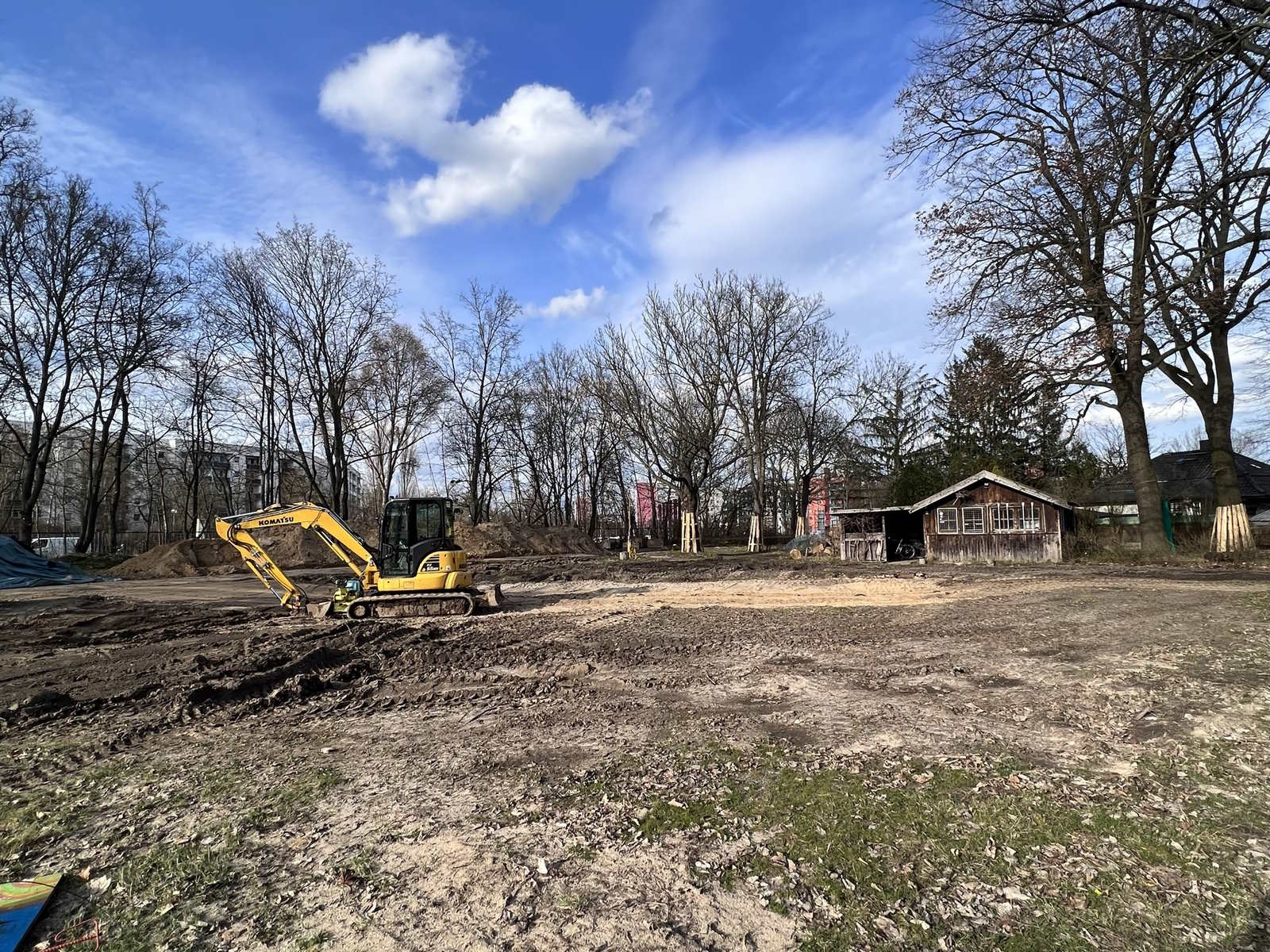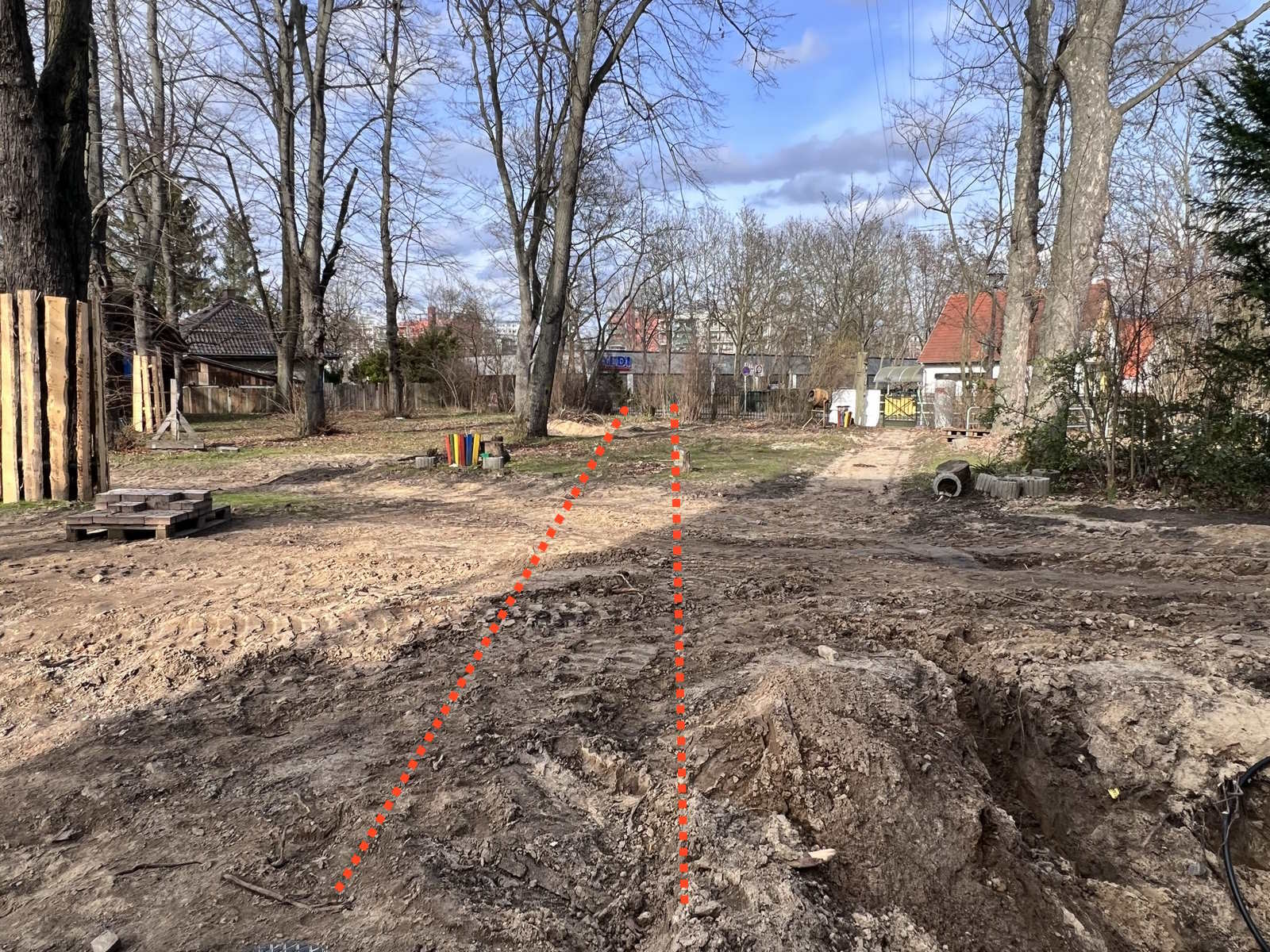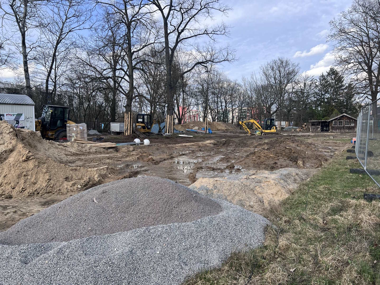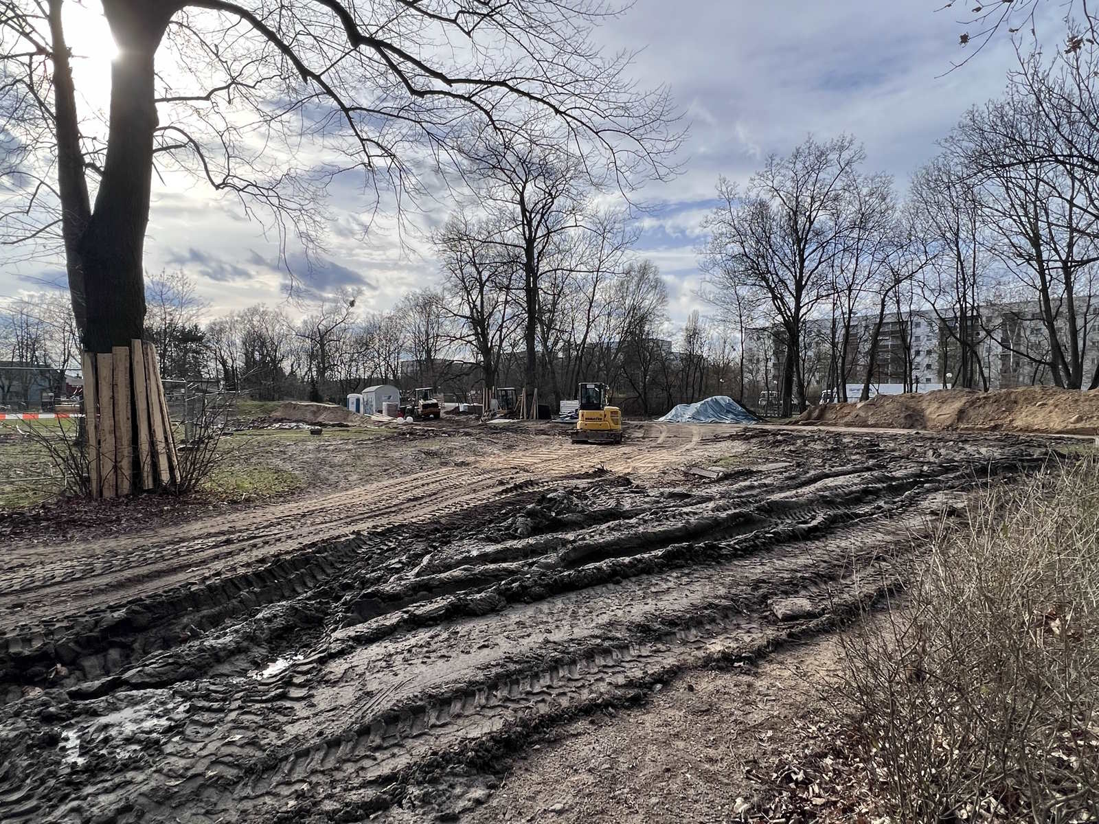 Auf der Baustelle findet noch immer vor allem Tiefbau statt, der Platz und Grundlage für die kreative Neugestaltung schafft. Von der Hausterrasse wird der neue, dann repräsentative Hauptweg zum Eingangstor verlegt werden, das an der Hellersdorfer Straße ein paar Meter Richtung Straßenkreuzung wandert.
