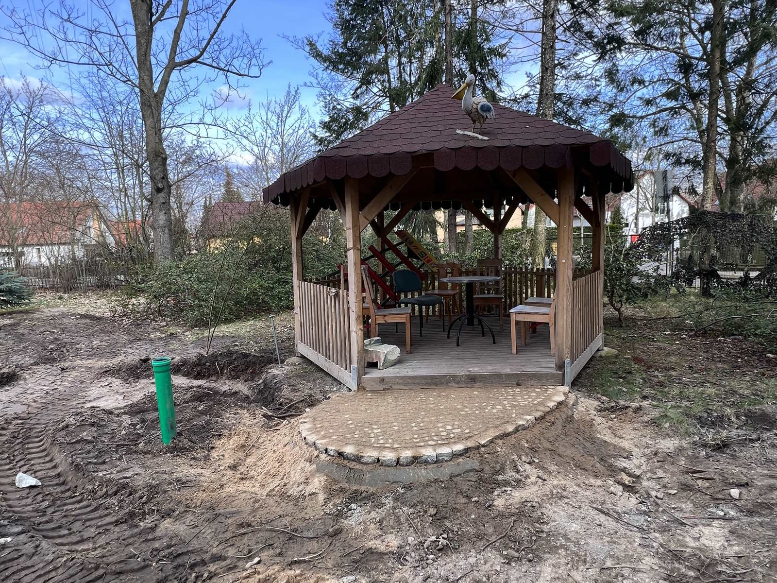 Die „Mehrgenerationengerechte Aufwertung Außenraum Villa Pelikan“ schreitet weiter voran. Da wo vor einem Monat noch eine große Grube war, in die die Zisterne für die Sammlung des Regenwassers versenkt wurde, ist der Boden schon wieder weitgehend geschlossen. Vor dem Haupteingang der Villa zeichnet sich das Rund der zukünftigen Terrasse ab. Am Raucherpavillon sieht man wie bei der zukünftigen Gartengestaltung Vorhandenes und Neues fusionieren werden, wenn der Boden wieder aufgefüllt ist.