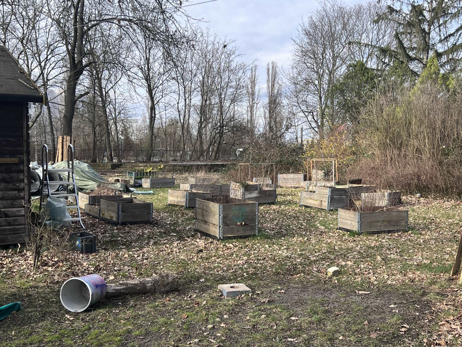 Die Hochbeete, die zukünftig im Nachbarschaftsgarten Platz finden werden, ziehen erst einmal auf die Terrasse, denn die Vegetationsperiode wartet nicht auf den Abschluss der Bauarbeiten.