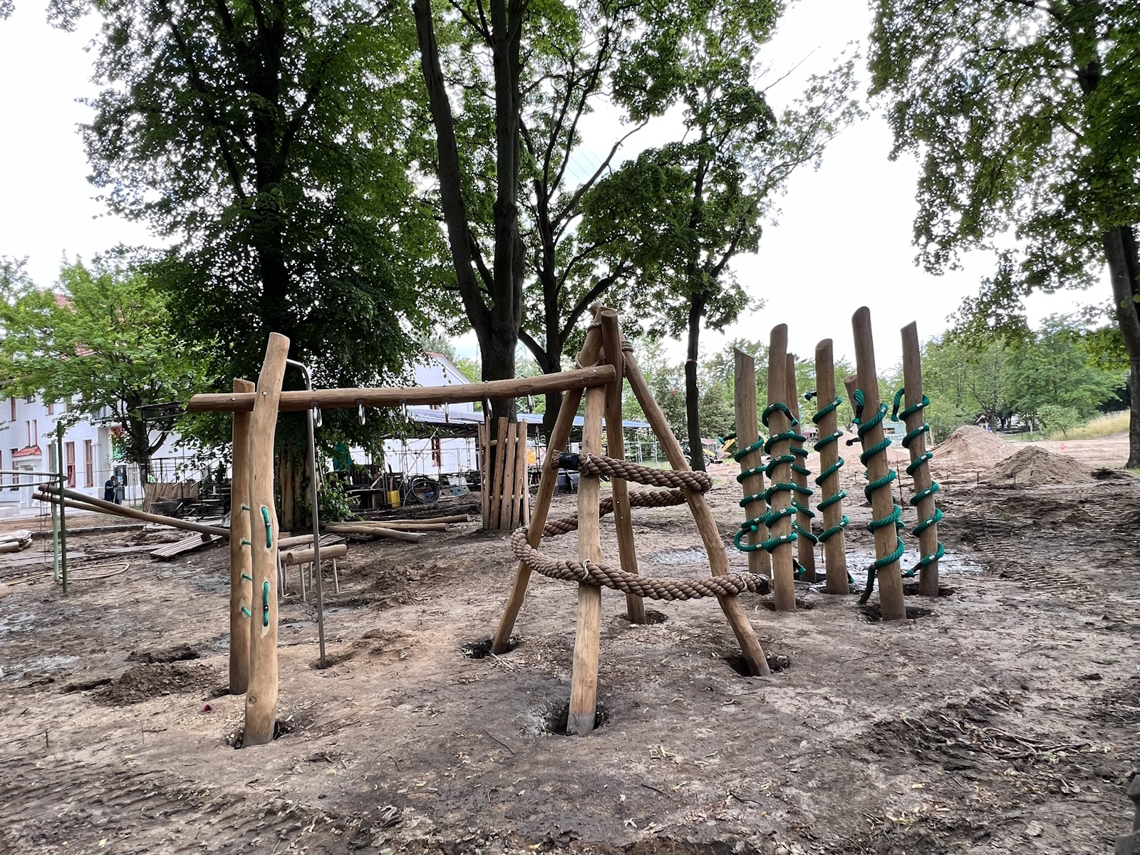 Folgt man dem Weg zur Fahrradwerkstatt eröffnet sich das nächste Puzzleteil der ganzen Anlage, der Klettergarten nimmt Gestalt an, viele Geräte sind schon errichtet, in einer Grube die später mit Rindenmulch oder Sand gefüllt sein wird, damit ein Sturz vom „Kratzbaum“ nicht weh tut. „Kratzbaum“ war häufig zu hören beim Rundgang übers Gelände, der Kletterpark scheint schon getauft, ein wenig erinnern die neuen Geräte, mit bunten Seilen umwickelt, auch an einen solchen. Ob die späteren Nutzer*innen des Geländes katzengleich über den Kletterpark streifen werden? Die Neugier und die Vorfreude sind jedenfalls groß.
