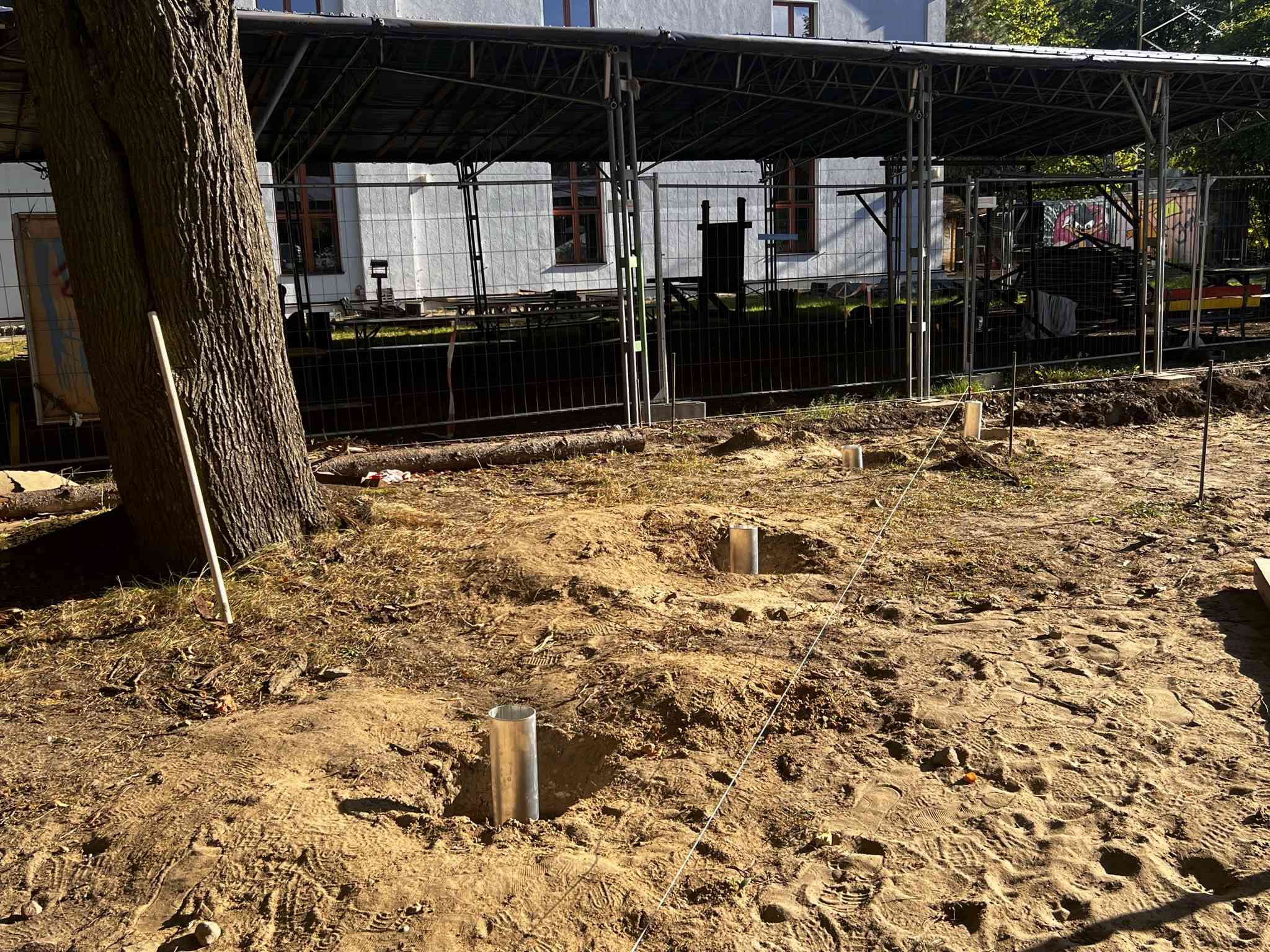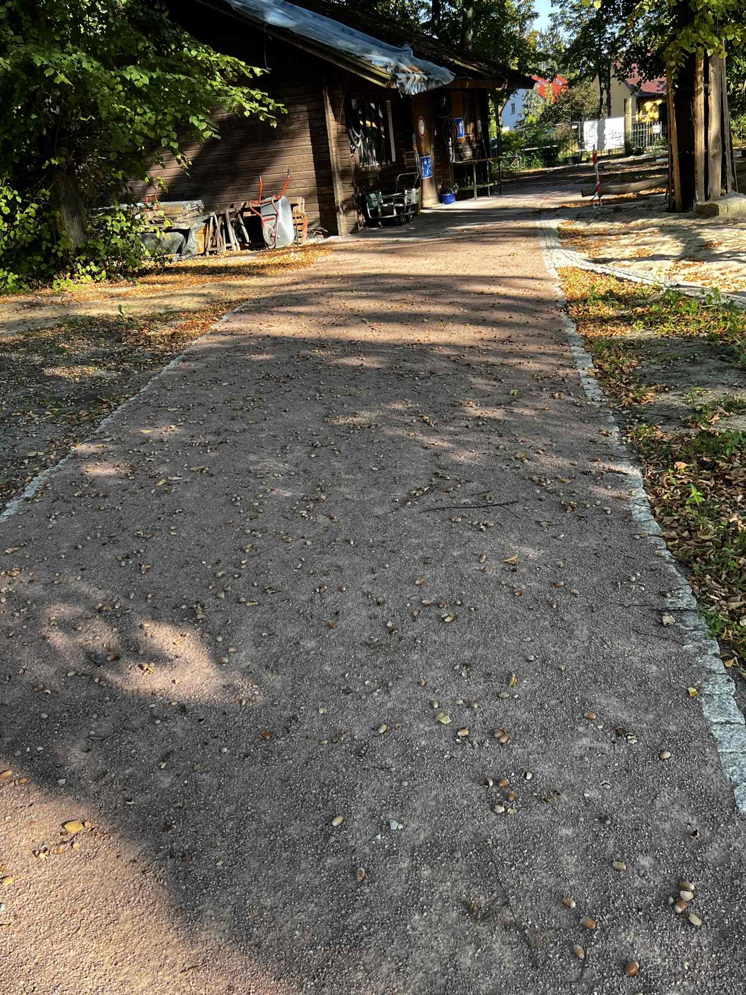 Der 21. September war ein wunderbarer Spätsommertag, obwohl der Herbstanfang im Garten der Villa Pelikan schon deutlich zu sehen und zu hören war. Eicheln und Kastanien fielen auf die Wege und die Dächer von Fahrradwerkstatt und Outdoorküche. Es war ein wunderbarer Tag für einen Besuch, um wieder einmal den Baufortschritt bei der „Mehrgenerationengerechten Aufwertung Außenraum Villa Pelikan“ zu dokumentieren.