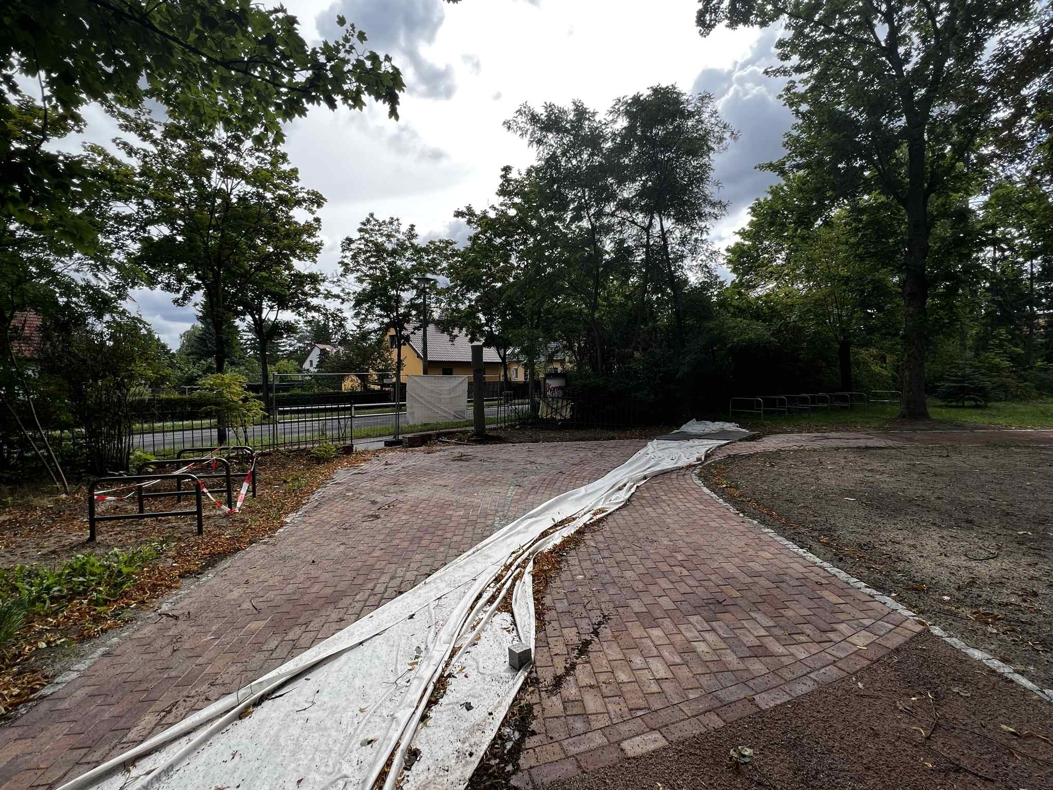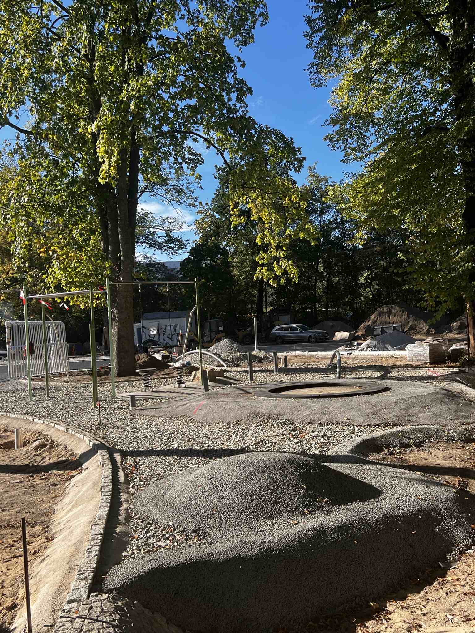 Auf der zentralen Fläche des Gartens ist in den letzten 6 Wochen mächtig was passiert. Sah es hier Anfang August noch eher nach Beachvolleyball aus, wurde jetzt gerade der Kunststoffbelag für das Sportfeld verlegt. Die Tore für zwei kleinere und ein größeres Fußballfeld und die Basketballkörbe sind errichtet und werden wie die Boulderwand (2), der Calisthenics Park und die Trampoline (9) auf einer blauen Fläche stehen. In der nächsten Woche soll es so weit sein, dann ist da alles blau …