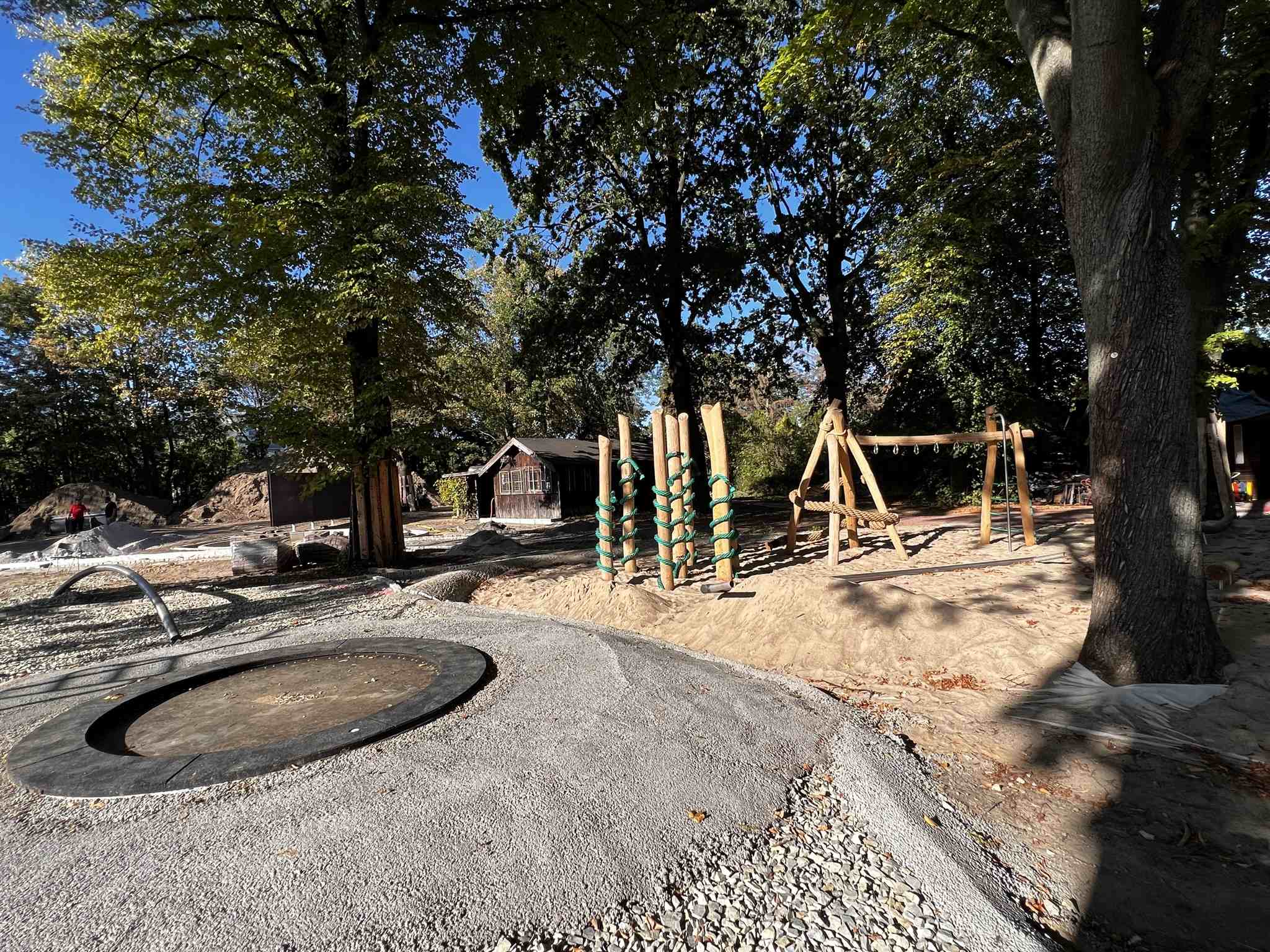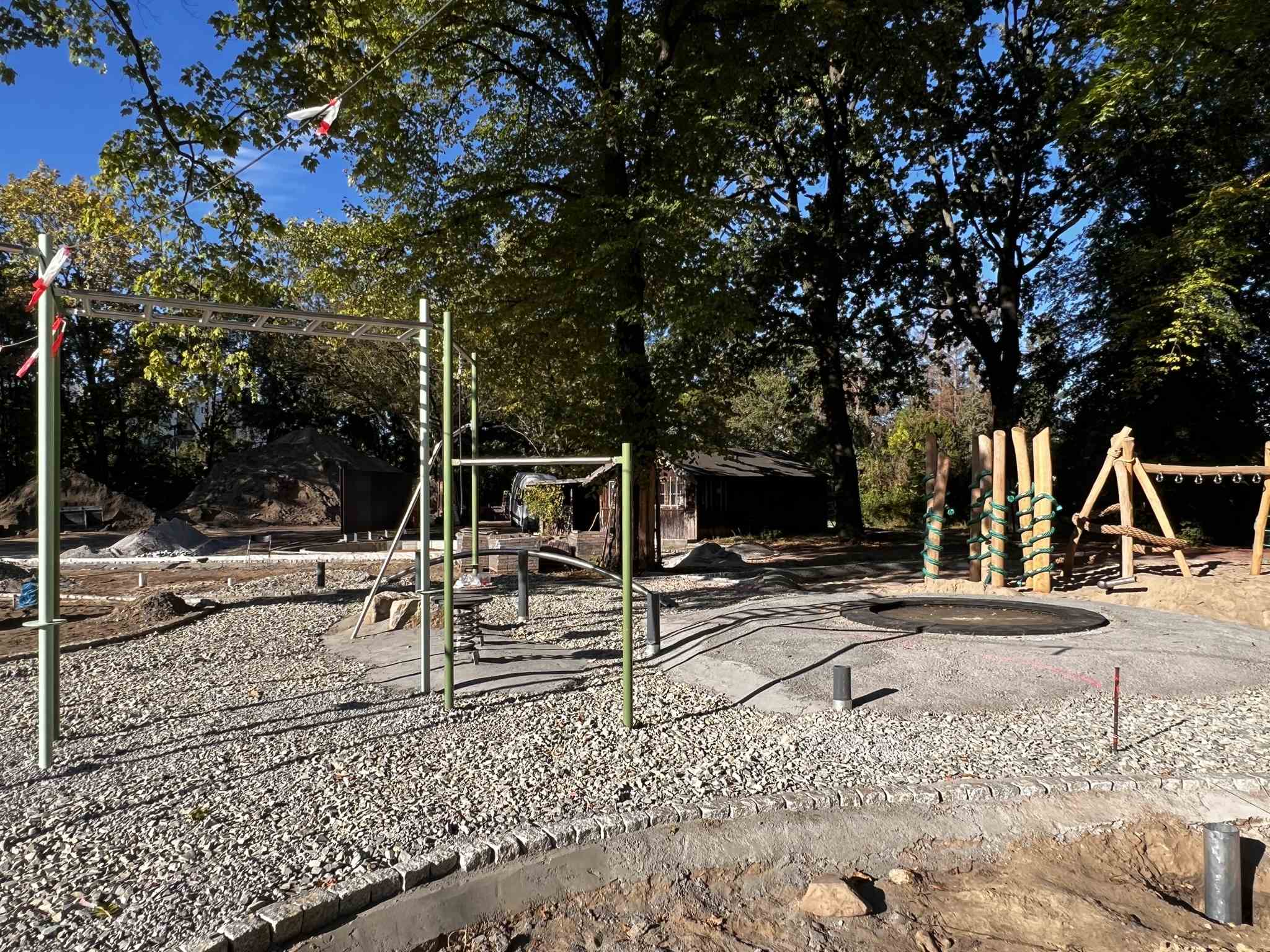 Der Kletterparcours (8), ein Ring verschiedener Spiel- und Klettergeräte für spielerisches oder auch anspruchsvolleres Klettern, ist nun fast vollendet. Es schließen sich der Calisthenics Park und Trampolinflächen (9) an. Dahinter werden demnächst die Ballfangzäune errichtet werden.
