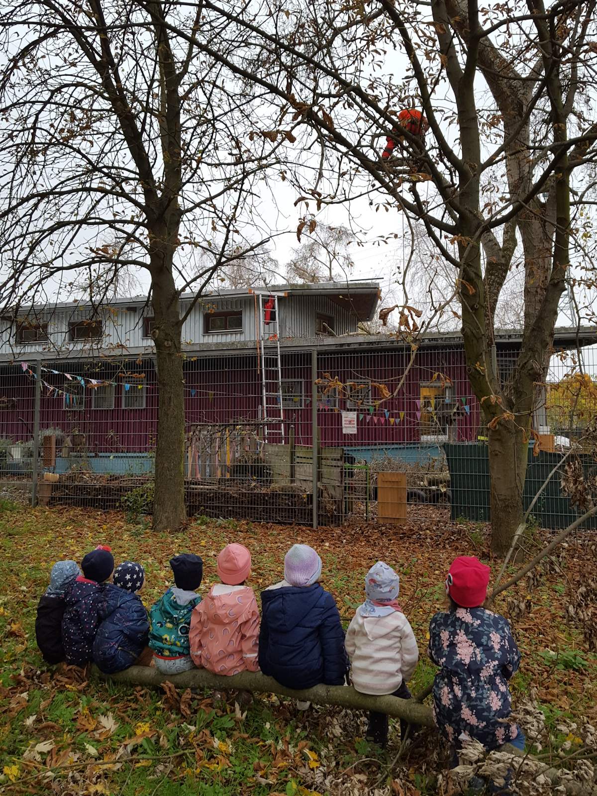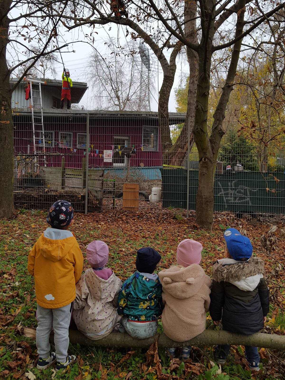 Die Wuhlehopser hatten aus dem Fenster im großen Raum einen prima Ausblick auf die Baumarbeiten. Außerdem sind einige Kinder mit zwei Erzieher*innen um die Kita gelaufen und konnten so die Arbeiten von außen, aus nächster Nähe, aber mit einem sicheren Abstand bestaunen.