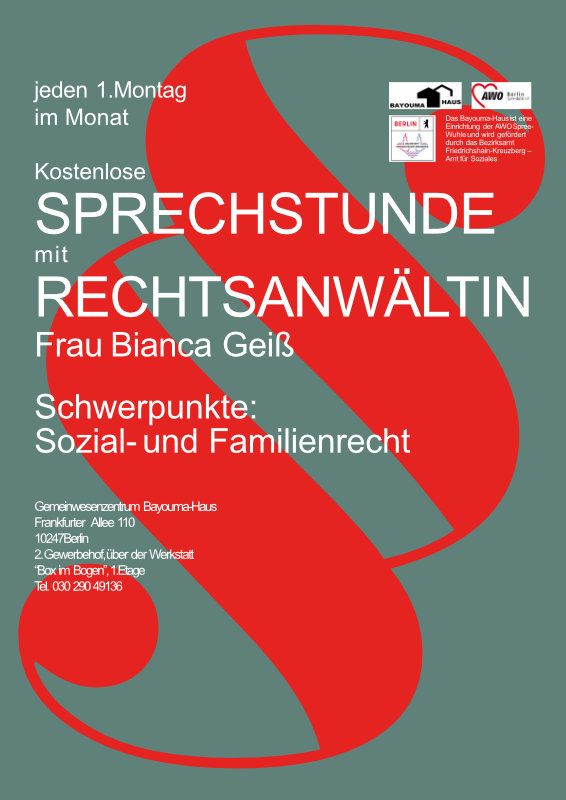 - Kostenfreie Sprechstunden mit Rechtsanwälten zu Sozial- und Familienrecht