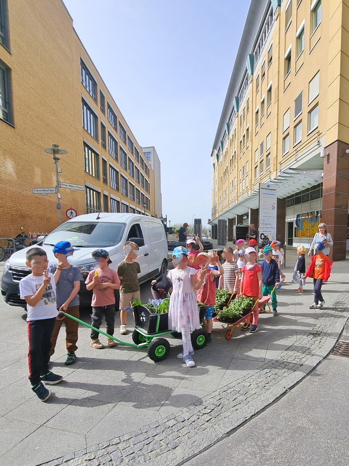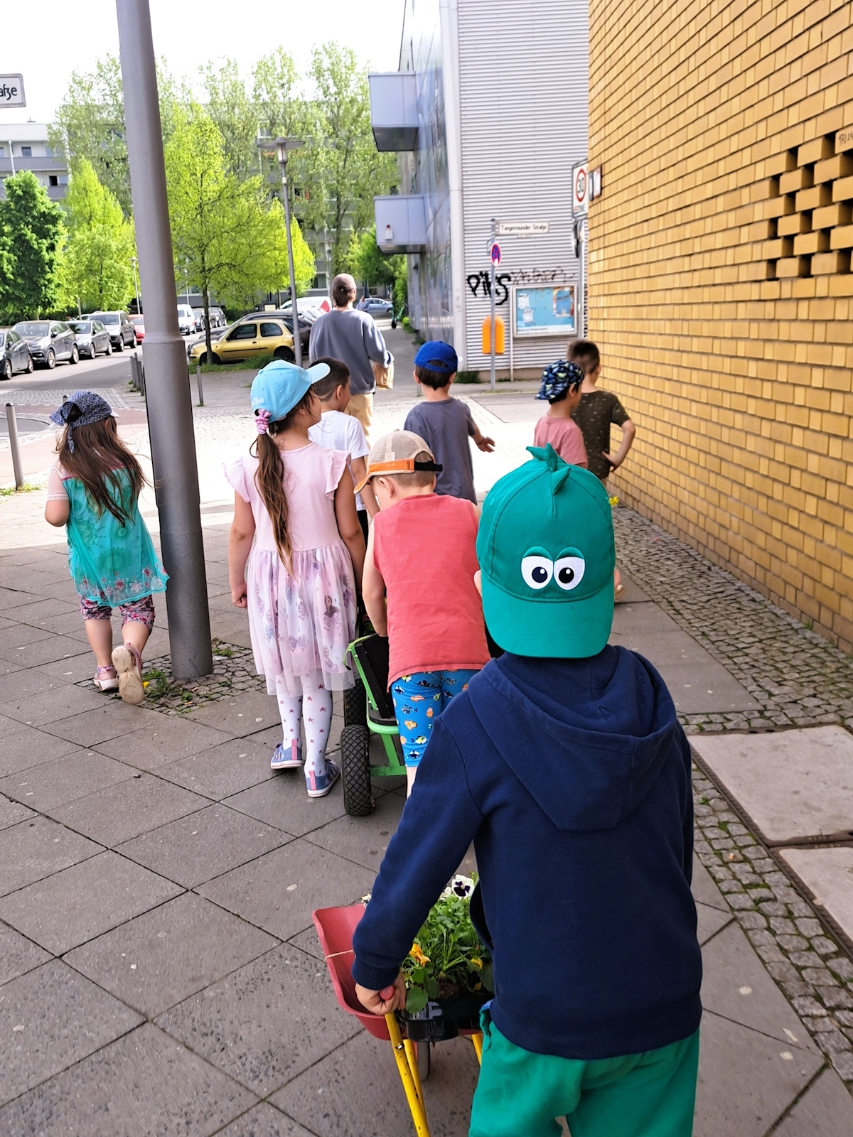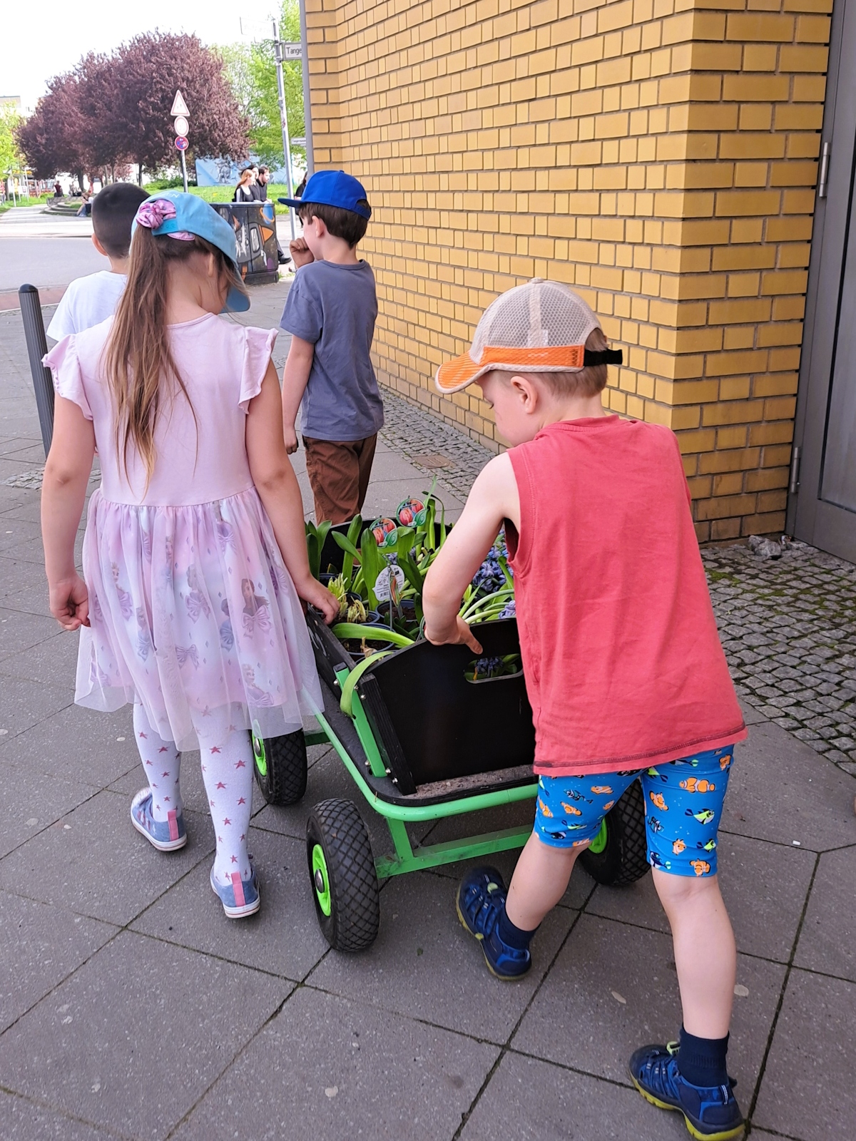 Nach Ende der Ostersaison hat das Marktplatz Center Hellersdorf am 10. April die Pflanzen und Blumenzwiebeln seiner Oster-/Frühlingsdekoration an soziale Einrichtungen verschenkt. Das hat sich die Kita Galileo natürlich nicht nehmen lassen und ist mit Schubkarren und Bollerwagen bei strahlendem Sonnenschein zum Marktplatz Center spaziert. Im Center angekommen haben die Kinder die schönen Pflanzen in Empfang genommen.