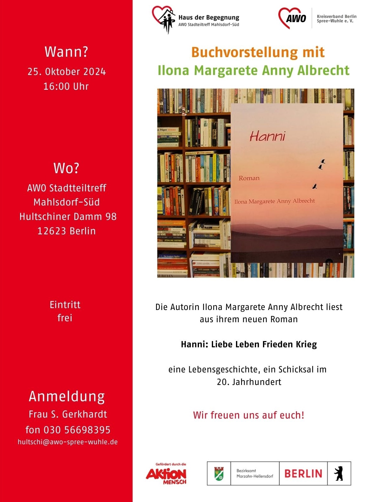 Am 25.10.24 wurde im Haus der Begegnung AWO Stadtteiltreff Mahlsdorf-Süd das zweite Buch der Autorin Ilona Margarete Anny Albrecht „Hanni“ vorgestellt. Vor Literaturfreunden las die Autorin aus der bewegenden Erzählung um das Schicksal einer jungen Frau beginnend im Kaiserreich zu Beginn des letzten Jahrhunderts. Besonders beeindruckend war die ehrliche Auseinandersetzung der Autorin mit den Herausforderungen, denen Frauen damals gegenüberstanden, und wie aktuell diese Themen auch heute noch sind.