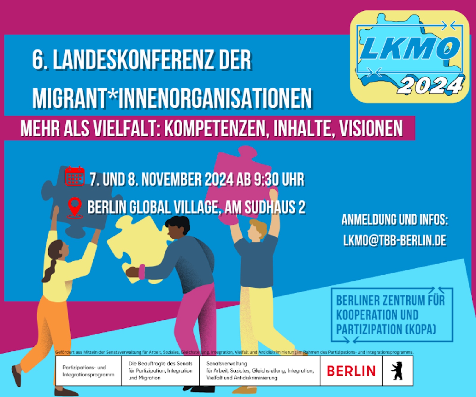 Die 6. Berliner Landeskonferenz der Migrant*innenorganisationen (LKMO 2024) fand unter dem Titel „Mehr als Vielfalt: Kompetenzen – Inhalte – Visionen“ am 7. und 8. November 2024 im Berlin Global Village Neukölln statt. Ziel war die Stärkung der Migrant*innenorganisationen in Berlin, diskutiert wurden politische und gesellschaftliche Herausforderungen und Strategien zur Verbesserung der Partizipation.