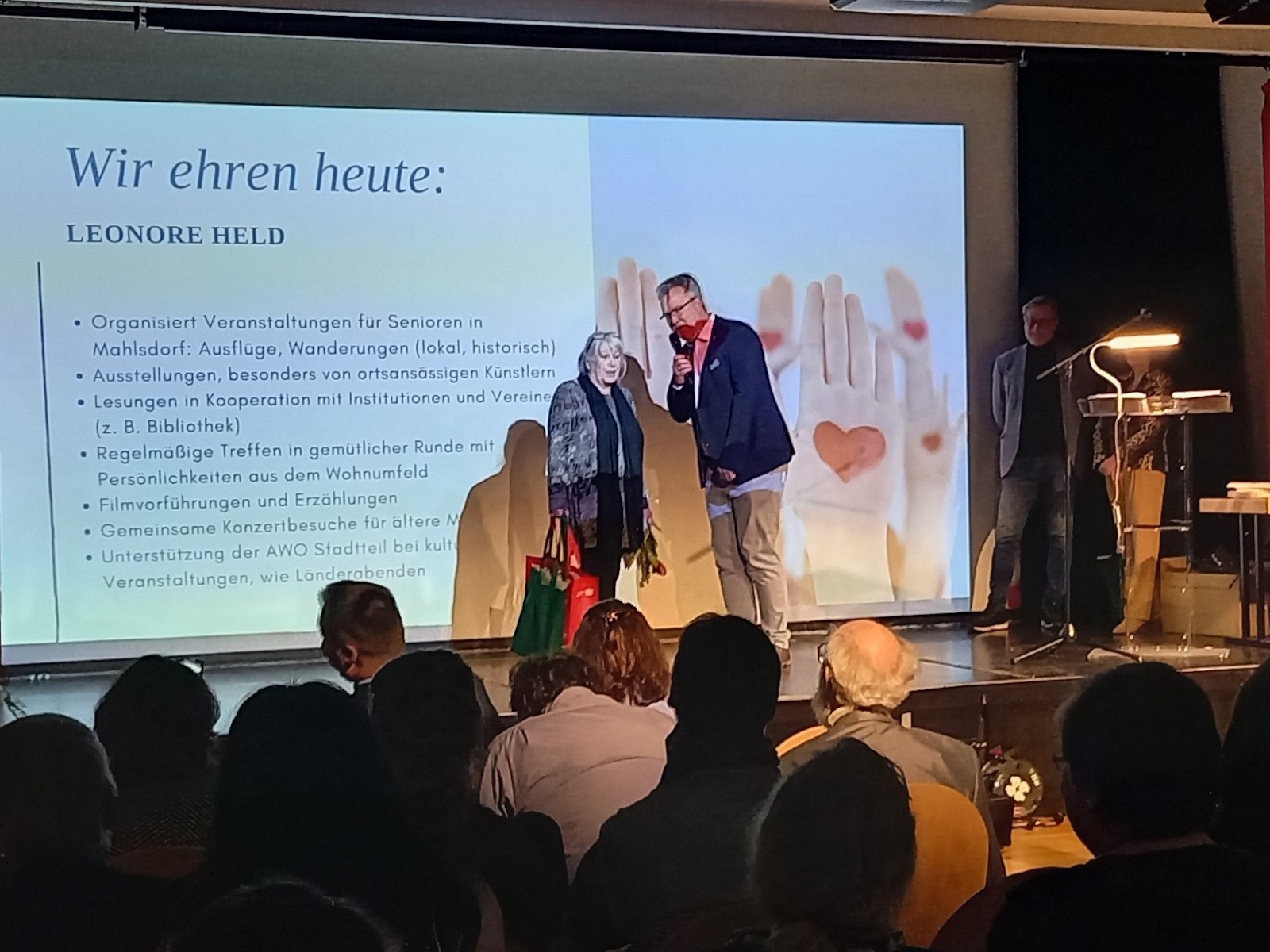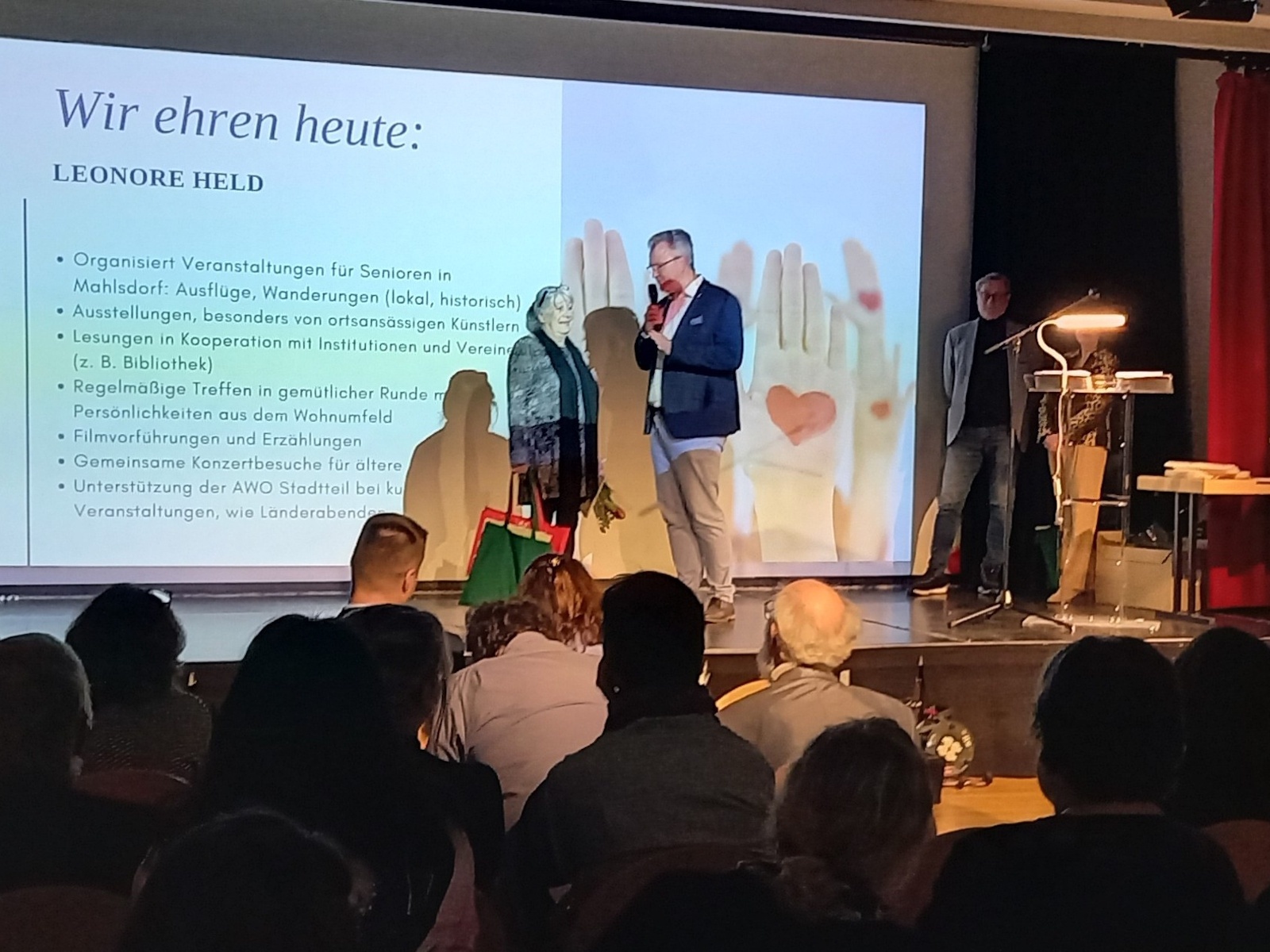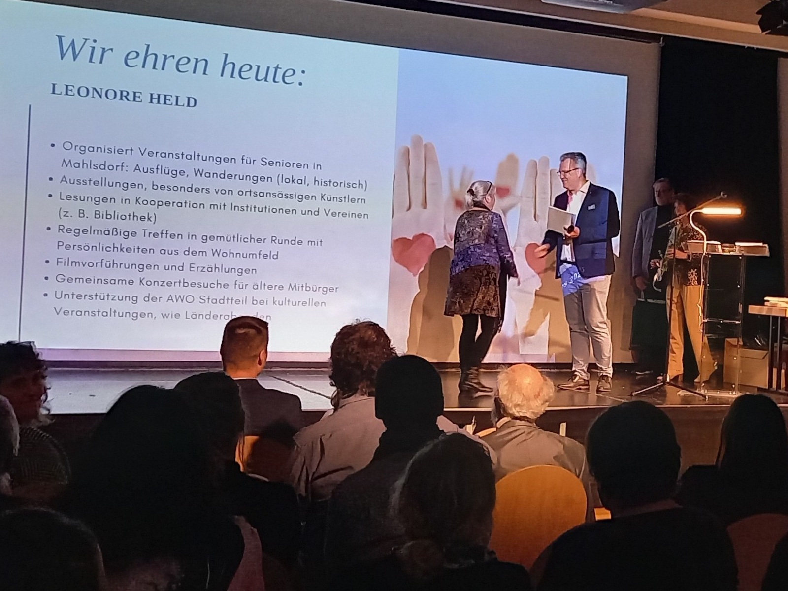 Frau Leonore Held wurde dafür geehrt, dass sie seit vielen Jahren in Mahlsdorf für ältere Menschen Veranstaltungen, Wanderungen, Konzertbesuche, Ausstellungen, regelmäßige Treffen in gemütlicher Runde organisiert.
