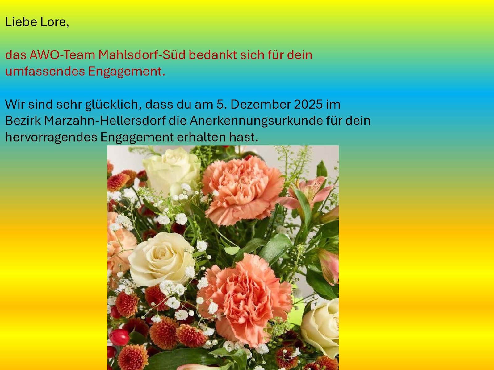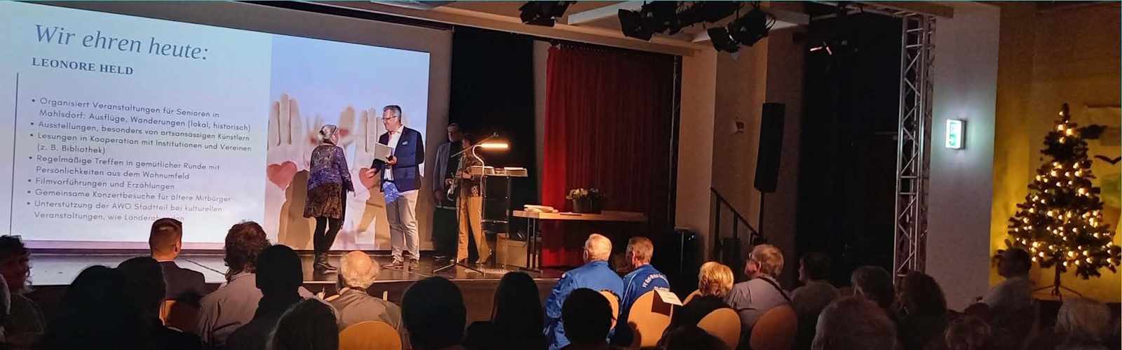 Am 5. Dezember 2025 konnten Vertreter*innen des AWO Stadtteiltreffs Mahlsdorf-Süd Frau Leonore Held zur diesjährigen Ehrenamtsfeier begleiten.