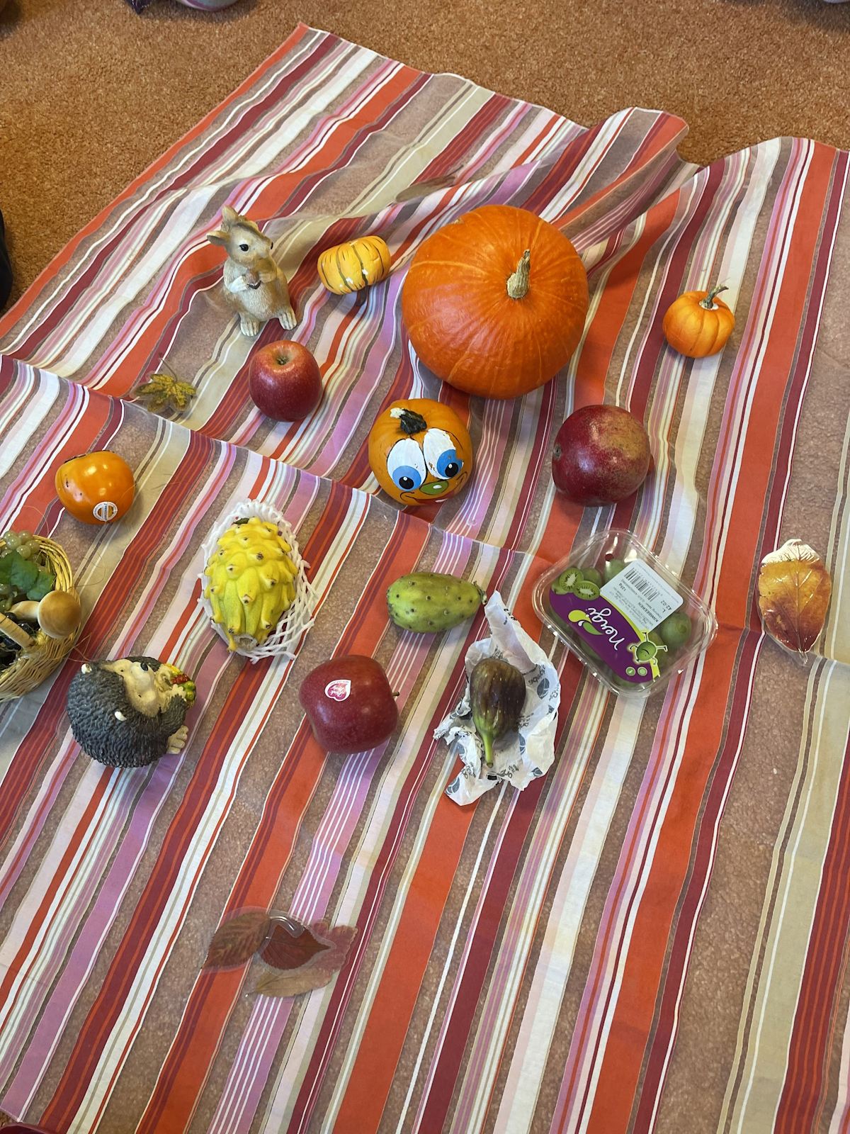 Wir haben gemeinsam gesungen und darüber gesprochen, was die Jahreszeit „Herbst“ so besonders bunt und farbenfroh und einzigartig macht. Wir haben uns bei der Natur „bedankt“ für das frische Obst und Gemüse, was sie uns in jedem Jahr wieder „neu schenkt“.