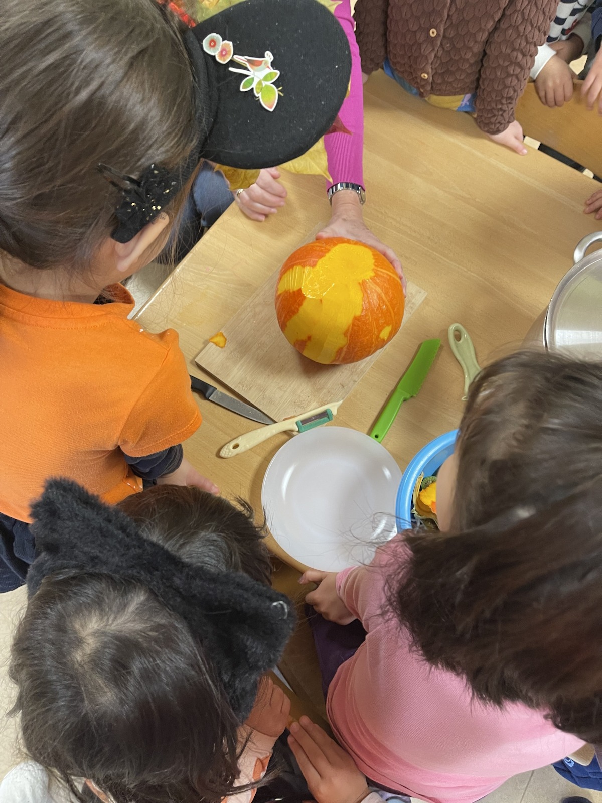 Gemeinsam haben wir eine Kürbissuppe gekocht. Zuerst haben die Kinder geholfen, den Kürbis zu schälen und dann wurde er nach und nach in kleine Stücke geschnitten. Es wurde darüber gesprochen, welche Zutaten noch notwendig sind, damit die Suppe besonders gut schmeckt. Fleißig haben wir zusammen gerührt und gespannt gewartet, bis die Kürbissuppe endlich fertiggekocht war. Wir hatten alle gemeinsam viel Spaß beim kochen und wir konnten dann beobachten, mit welchem Genuss die Kinder ihre selbst gekochte Suppe gegessen haben. Einige haben sogar noch einen „Nachschlag“ gegessen.