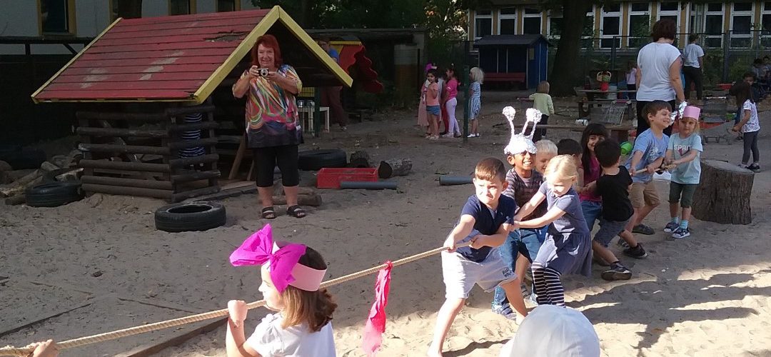 Bei schönstem Spätsommerwetter mit viel Sonnenschein, guter Laune und sehr viel Freude wurde das Kinderfest eingeläutet. Mit kreativen Angeboten, wie zum Beispiel das Kinderschminken, waren einige Erzieherinnen in ihrer Fantasie und Ausdauer sehr gefordert. Später konnte man kreativ geschminkte Kindergesichter bewundern – kein Wunsch der Kinder blieb unerfüllt – ganz nach dem Motto „geht nicht, gibt‘s nicht“. Kleine Schmetterlinge, Tiger, Katzen, Piraten, Spidermans und Prinzessinnen sowie andere fantasievolle Gestalten rannten, tanzten, kletterten und spielten dann ausgiebig im Garten. Andere Bewegungsangebote, wie das Tauziehen, Hüpfball und Dosenwerfen wurden ebenso von den Kindern begeistert angenommen. Beim Tauziehen wurden gemeinsam die Kräfte gemessen und beim Dosenwerfen schafften es einige Kinder sogar sämtliche Dosen umzuwerfen. Bei der Vielzahl von kreativen- sowie Bewegungsangeboten zeigten die Kinder sehr viel Interesse und waren begeistert. Das Tanzen machte unseren Jüngsten besonders viel Spaß und auch so manche Erzieherin schwang mal wieder ihr Tanzbein. Doch jedes Fest geht einmal zu Ende, nun freuen wir uns auf den Weltkindertag im nächsten Jahr.
