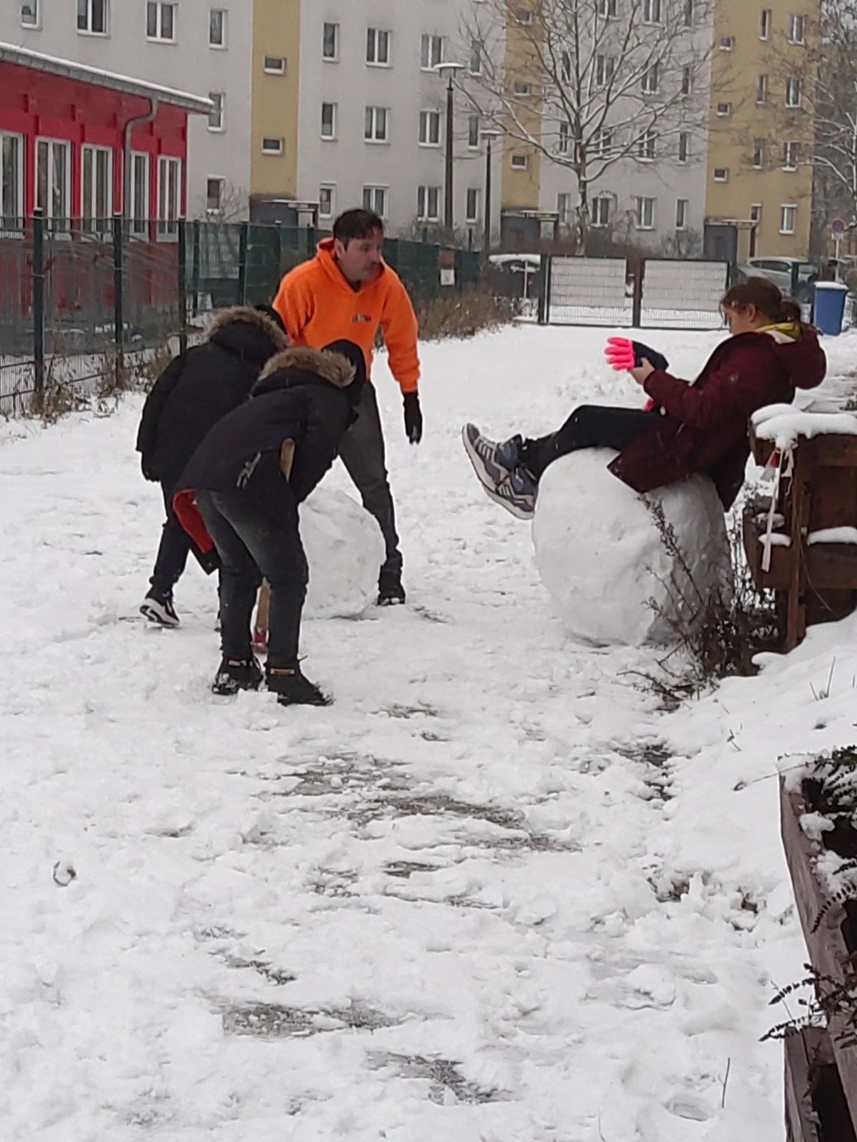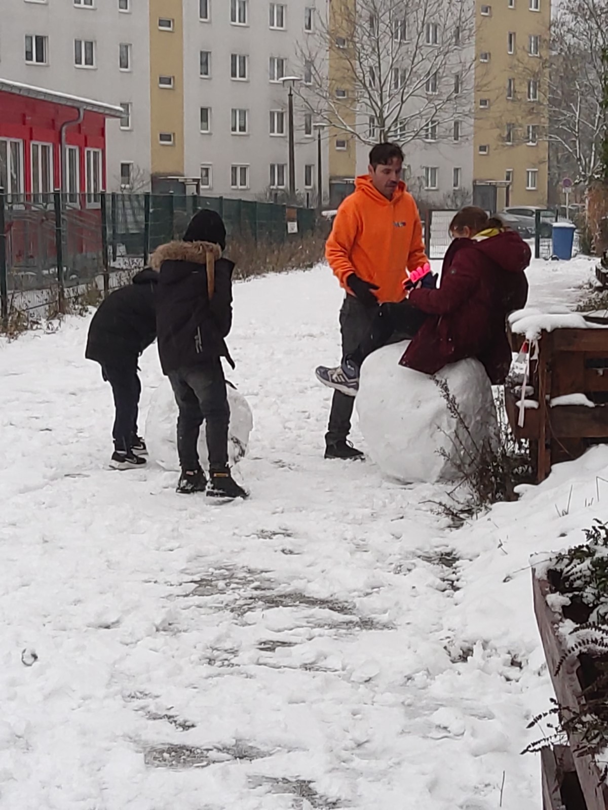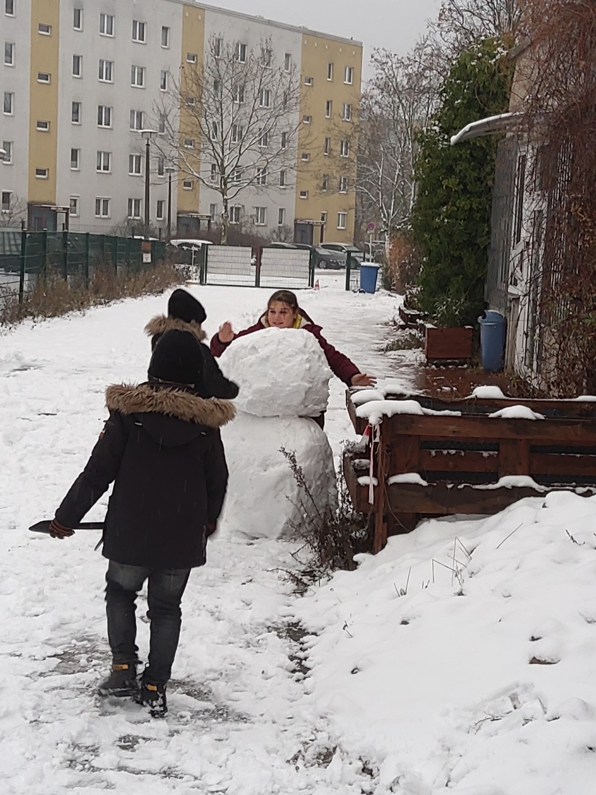 Etwas überraschend begann der Dezember in Hellersdorf wie in ganz Berlin mit einem ersten Wintereinbruch und Schneefall. Das war eine willkommen Einladung, im Hof Schneekugeln zu rollen.