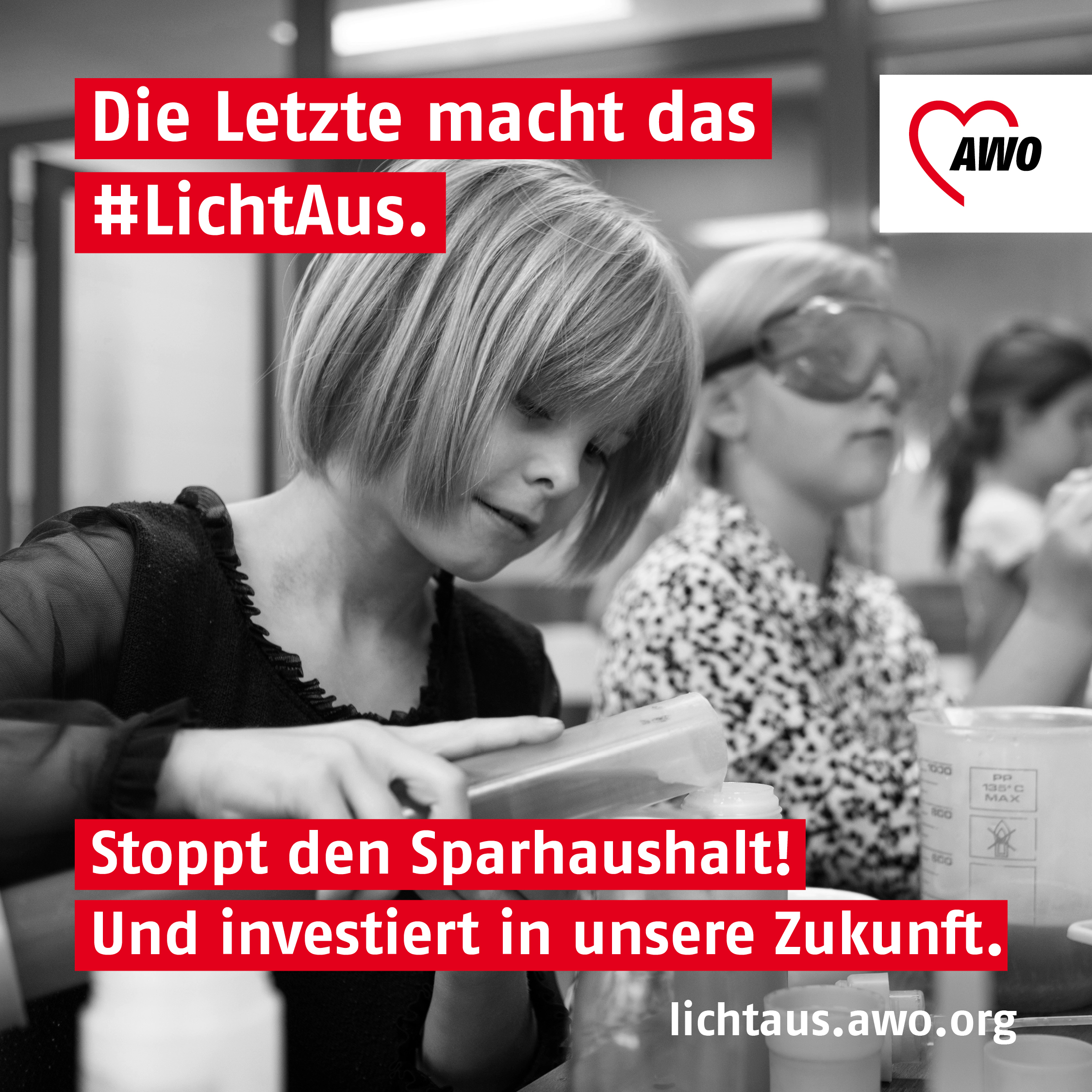Deshalb hat der AWO Bundesverband am 4. September die Kampagne „Die Letzte macht das Licht aus. Stoppt den Sparhaushalt!“ gestartet. Bis zur Bereinigungssitzung Mitte November will die AWO laut und mutig ihre Stimme erheben.