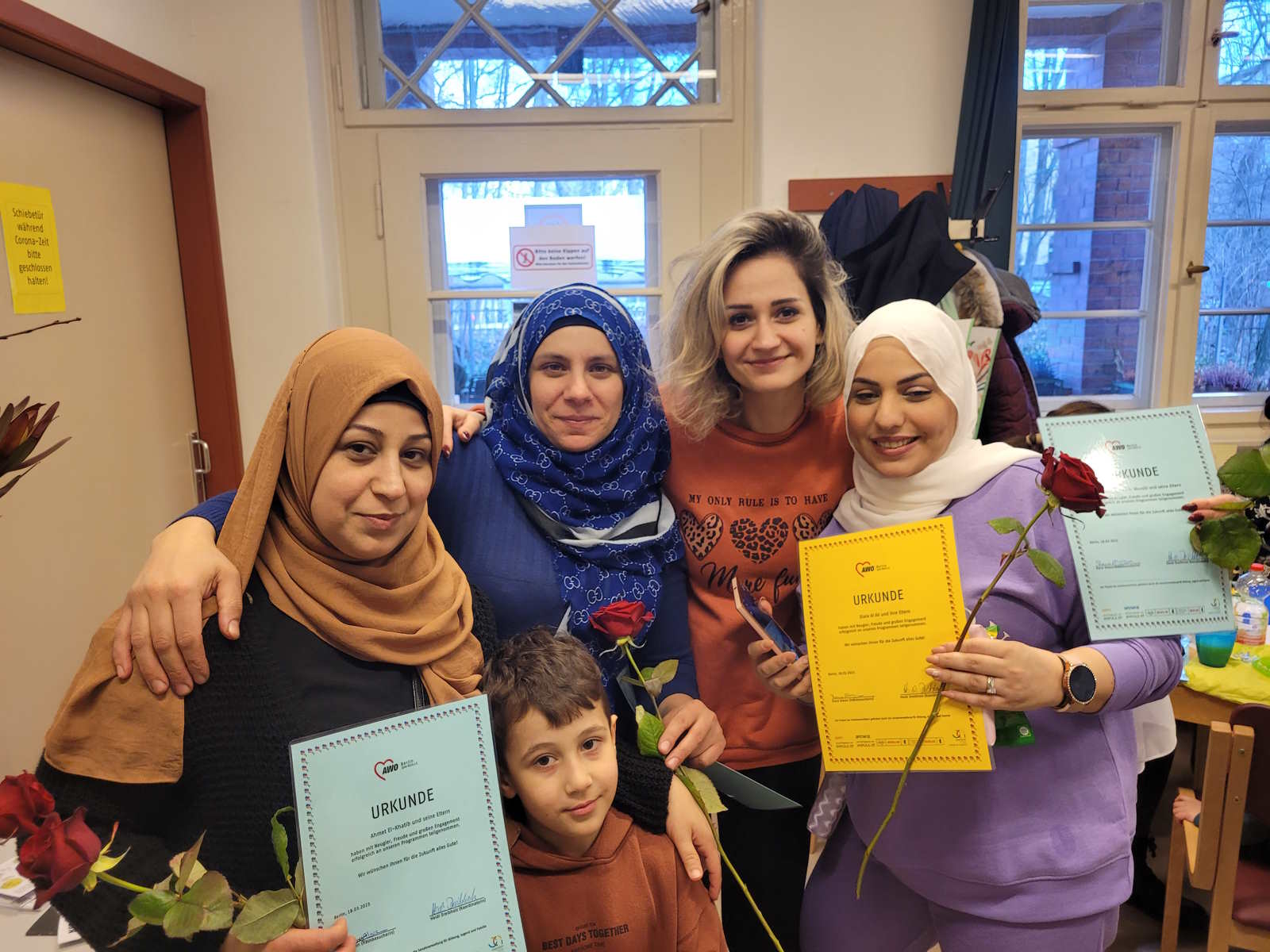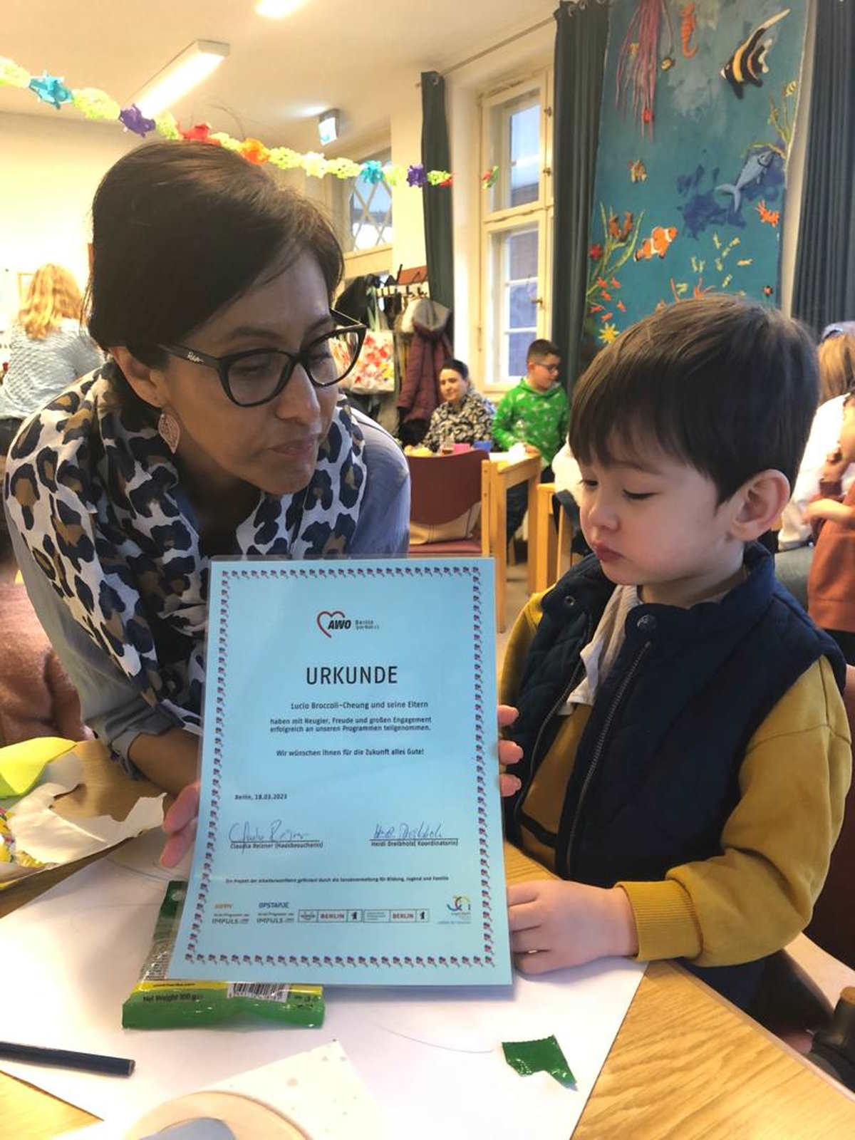 Anschließend gab es für die Kinder und die Eltern ein gemeinsames Diplom, das ihnen bescheinigt, mit Freude, Neugier und großem Engagement erfolgreich an den Programmen teilgenommen zu haben. Natürlich gab es für Alle auch Blumen und kleine Geschenke.