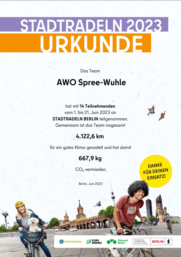 Mit dem Team AWO Spree-Wuhle sind 2023 14 aktiv Radelnde in den drei Wochen des Stadtradelns insgesamt 4.123 km gefahren. Besonders bemerkenswert ist dabei, dass die gefahrene Strecke gegenüber dem Vorjahr fast verdoppelt wurde.