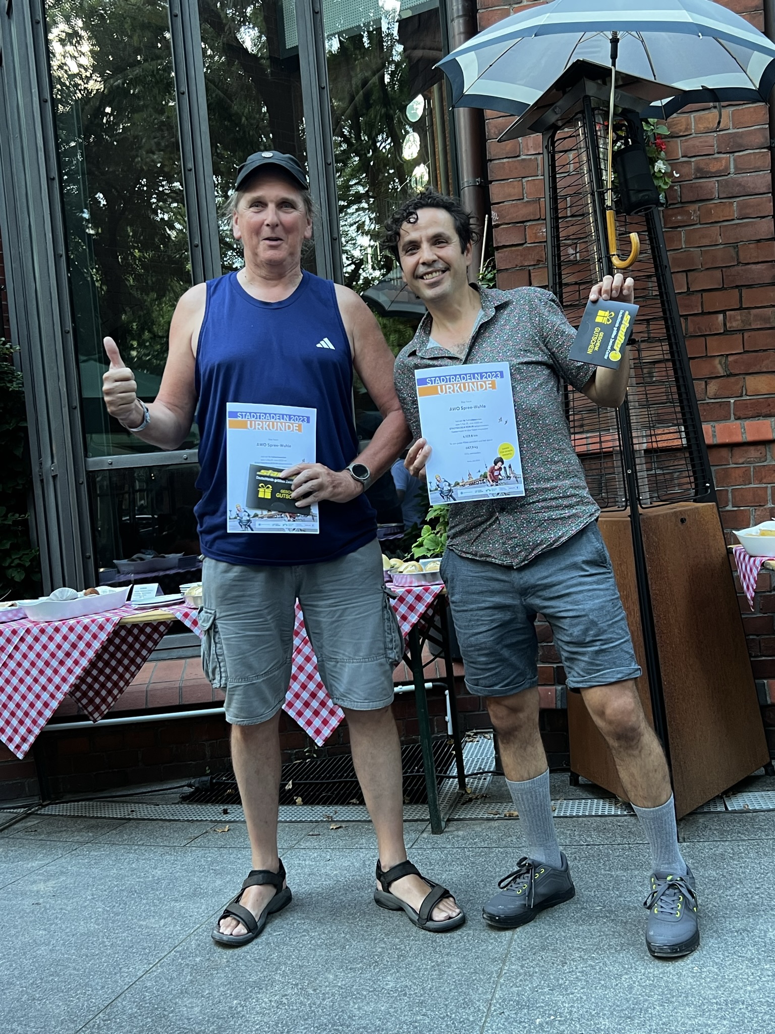 Bei Stadtradeln geht es ums Mitmachen und ums dabei sein, der Teamgedanke überwiegt und der Wettbewerbsgedanke steht hintenan. Deshalb gibt es auch „nur“ eine Teamurkunde und Einzelergebnisse werden nicht explizit gewürdigt. Das gesamte Team AWO Spree-Wuhle erhielt vom Kreisvorsitzenden und vom Geschäftsführer je ein Exemplar der Teamurkunde. Und weil ein Fahrrad auch mal ein Ersatzteil oder eine Wartung braucht gab es einen Gutschein dazu.