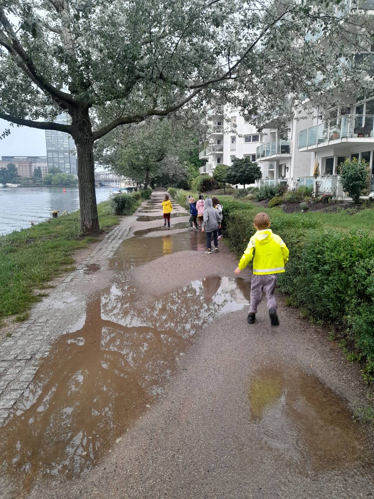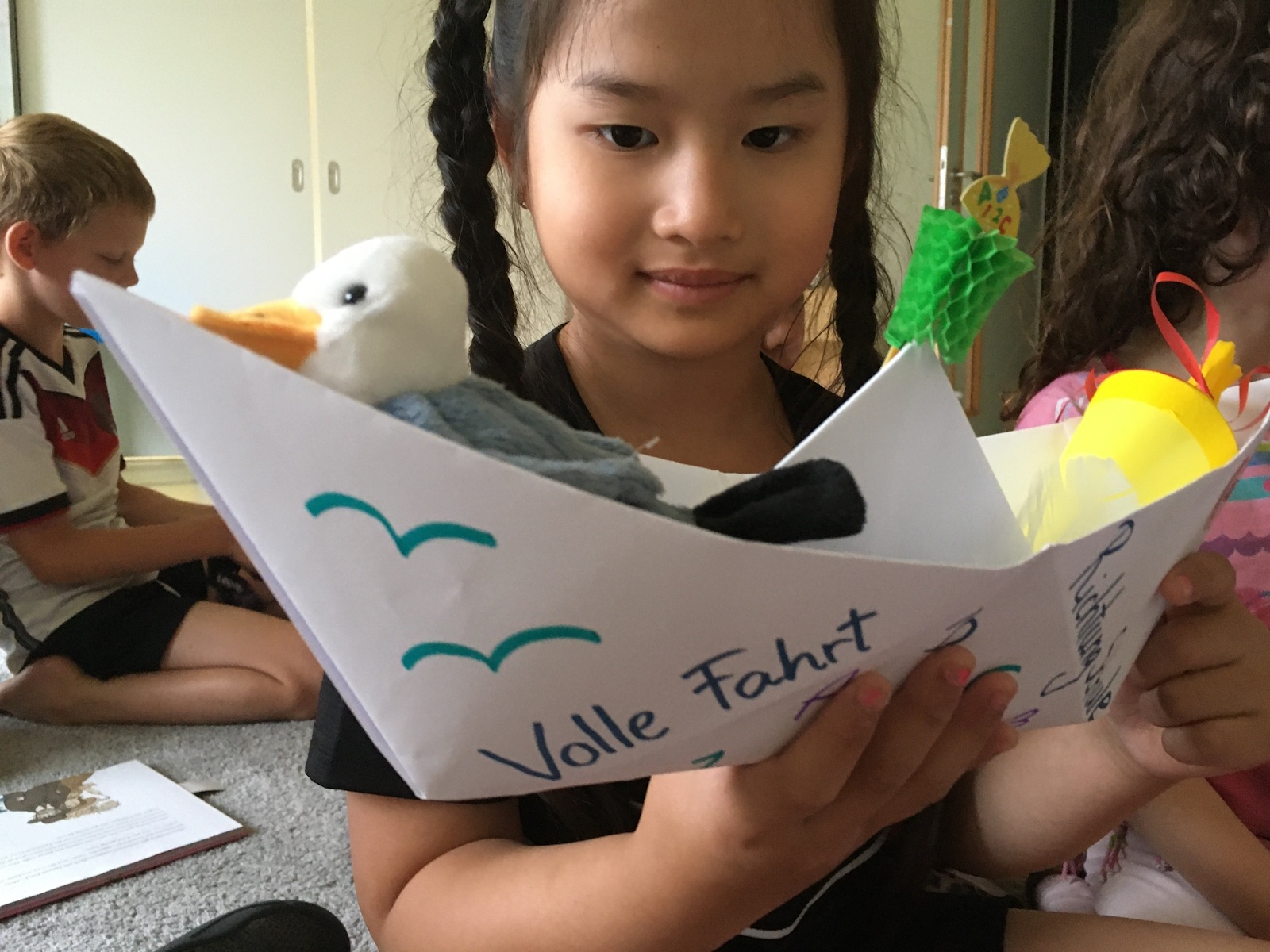 Gemeinsam wurden die Matratzenlager hergerichtet, Pizza gegessen, wild getanzt, Kissenschlachten gemacht und Prüfungen bestanden, die ihnen die kleine Spreemöwe aufgetragen hat. Beim Abendspaziergang entlang der Spree zeigten die Kinder der Möwe stolz den Weg zur Schule. Unterwegs warteten zwei Erzieherinnen mit kleinen Aufgaben auf sie. Zur Belohnung gab es natürlich auch Wegzehrung und einen Schlummertrunk, bevor alle symbolisch kleine Papierboote auf die Spree setzten – als Zeichen dafür, dass sie nun selbst volle Fahrt Richtung Schule aufnehmen.