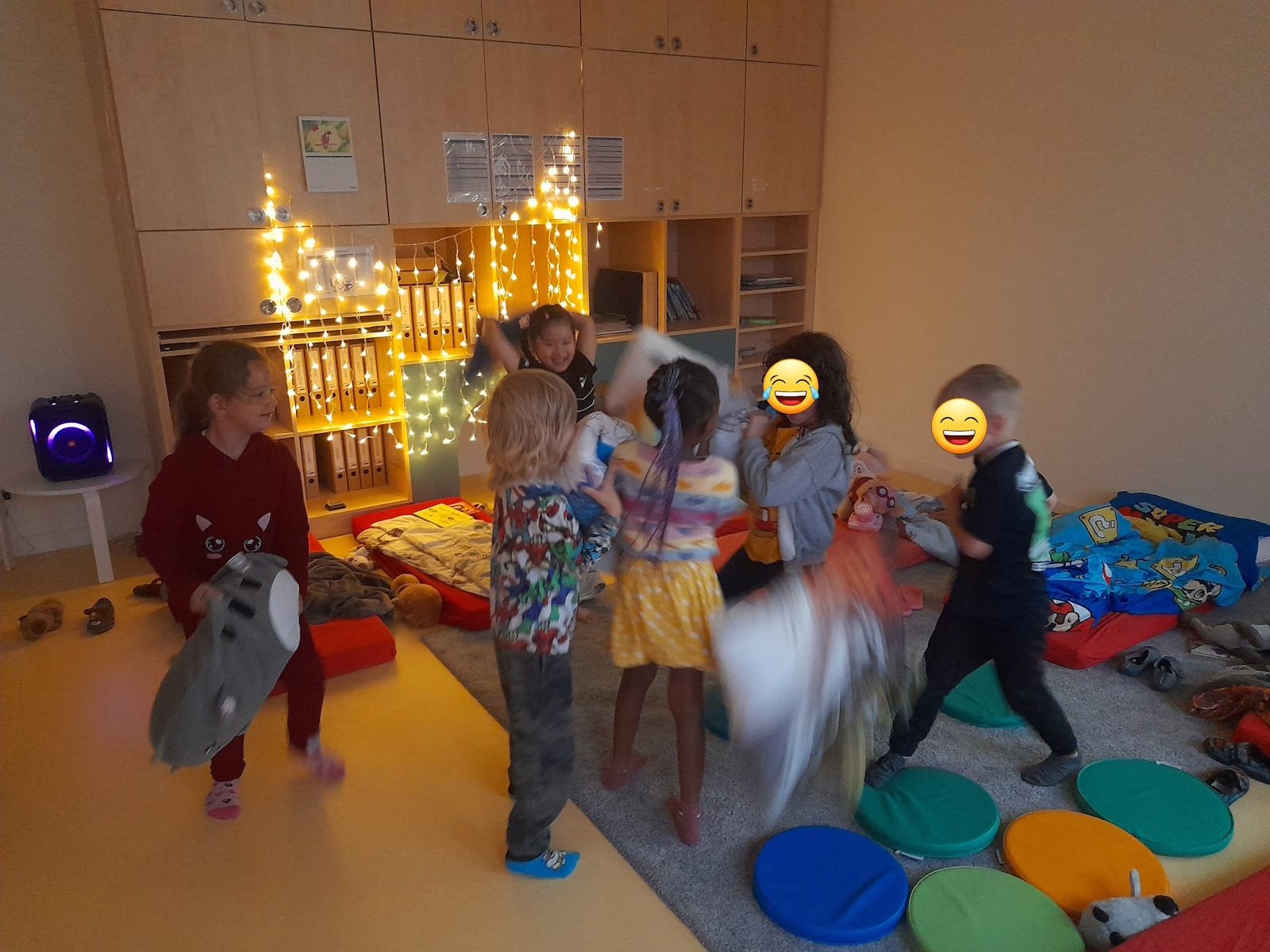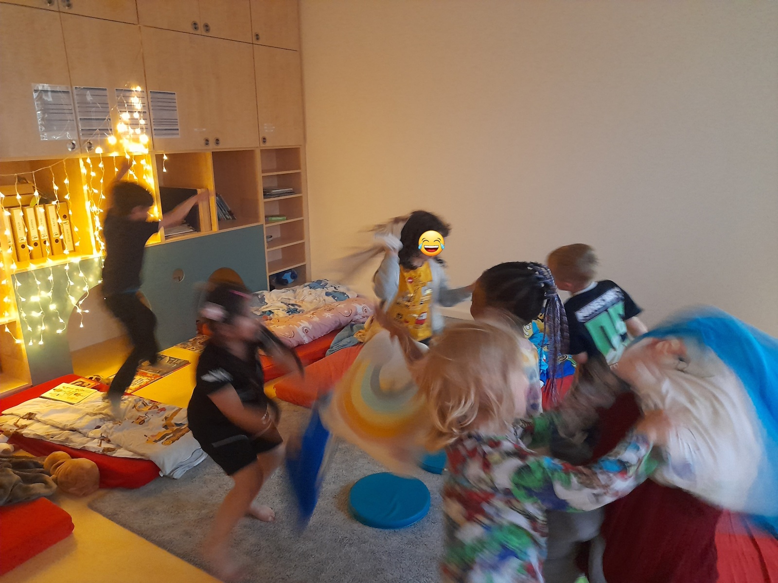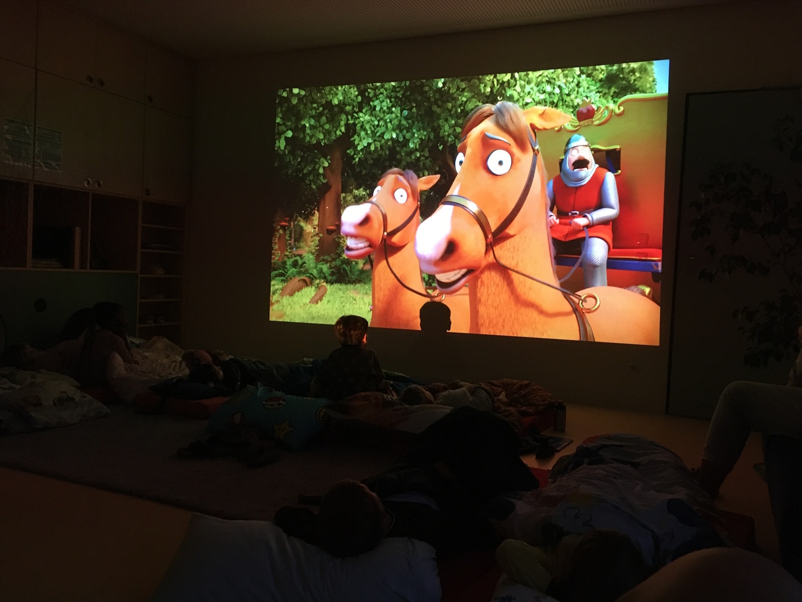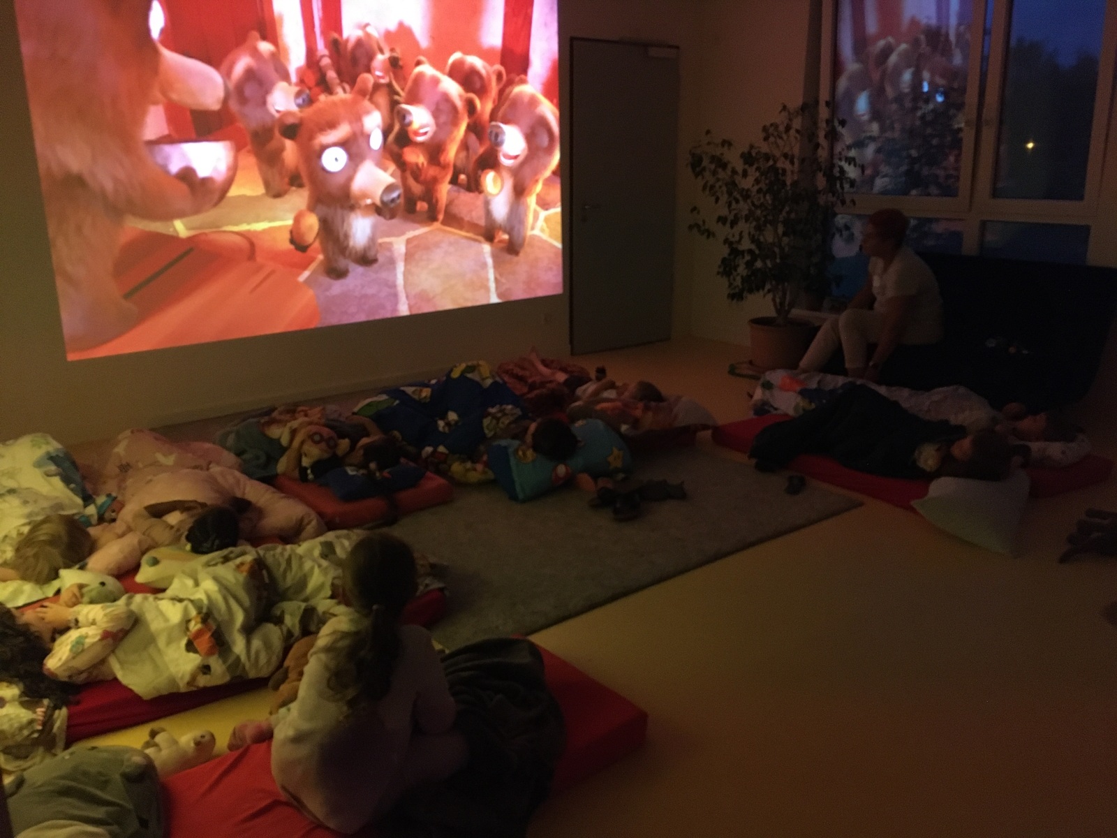 Zurück in der Kita wurde es dann gemütlich: Zähne putzen, Schlafanzug an, Bücher anschauen, Taschenlampenspiele spielen, eine kleine Runde „Wahrheit oder Pflicht“ und schließlich ein Film wie im echten Kino – bevor alle zufrieden und ohne Heimweh einschliefen.