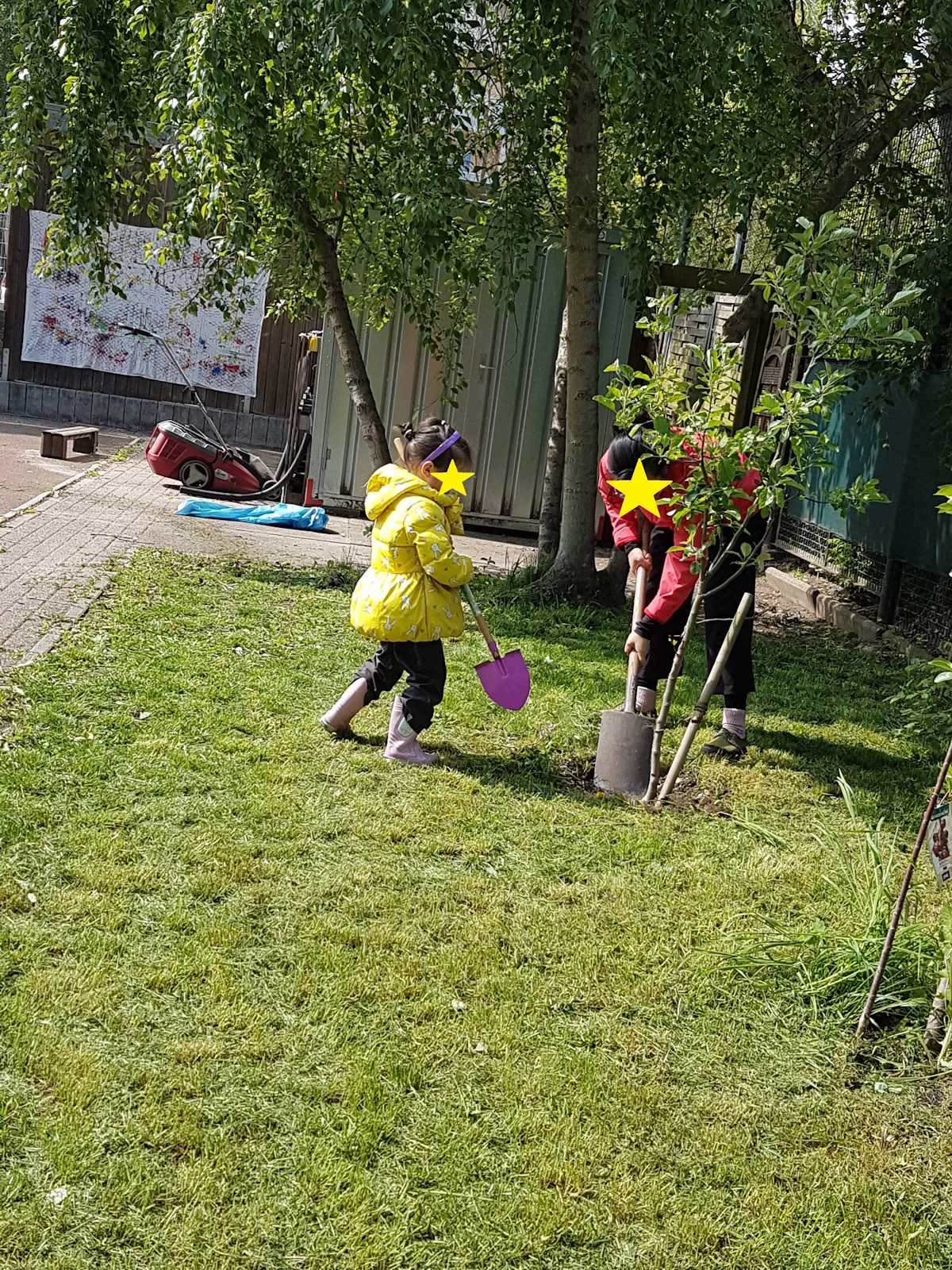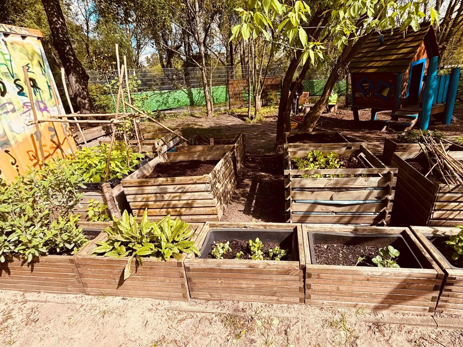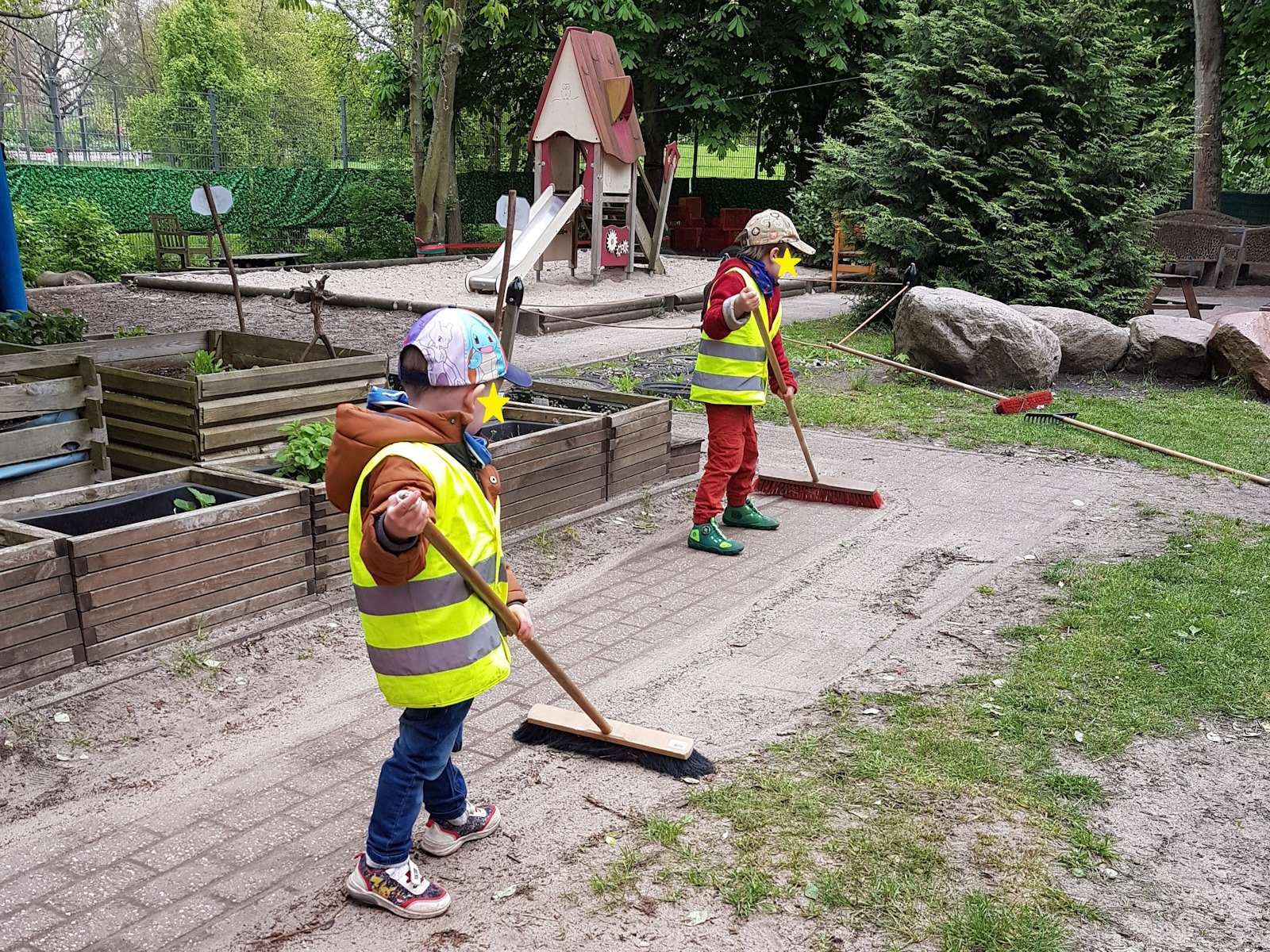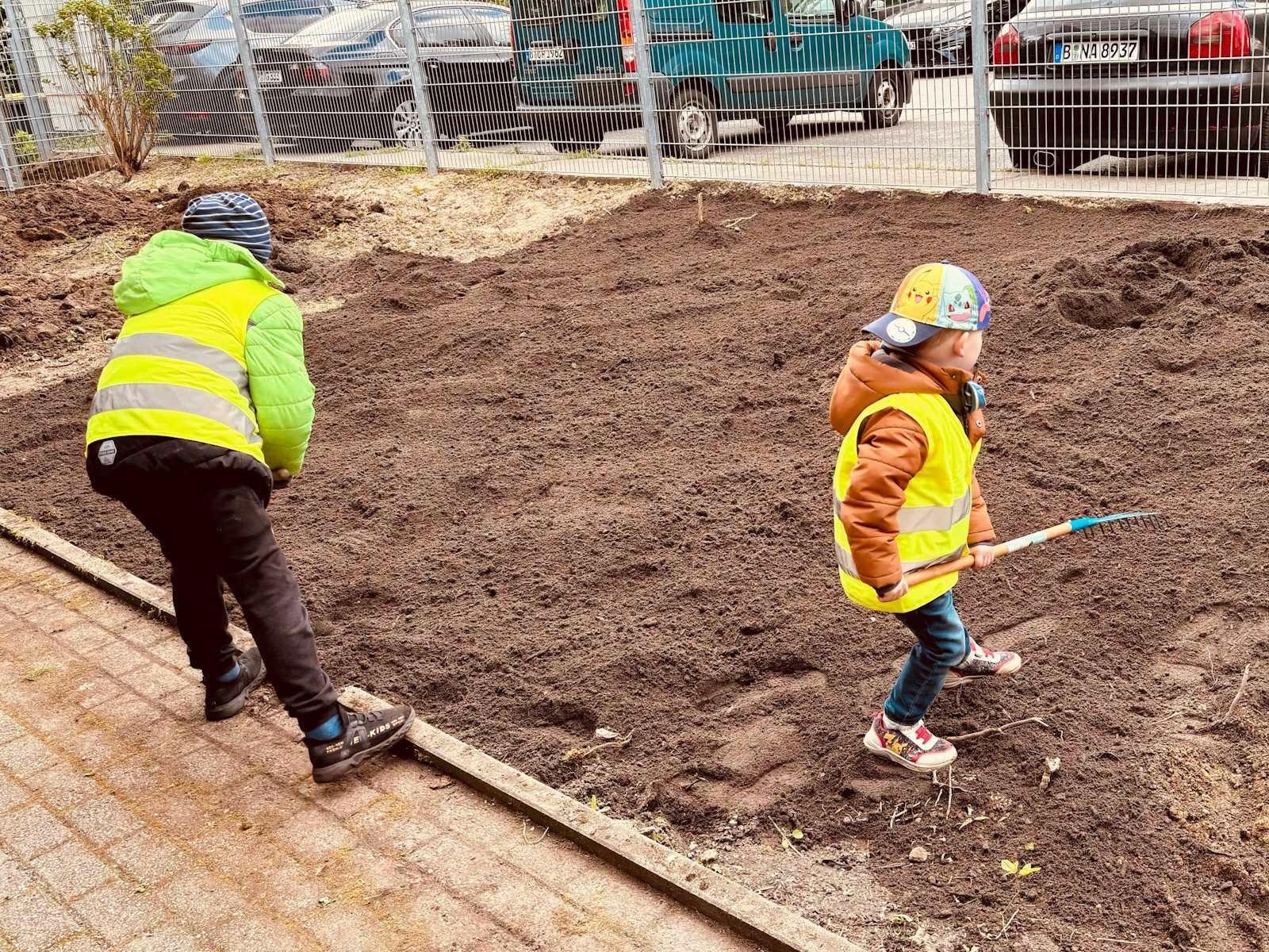 Deshalb wurde Mutterboden angefahren und am 25.04.2024 fand ein Garteneinsatz mit Eltern und Kindern statt. Der Mutterboden wurde verteilt. Hier werden die Kinder Kartoffeln anbauen, Kräuter setzen und Sträucher pflanzen. Es sind auch neue Hochbeete geplant. Mit der Hilfe der fleißigen Hände wurde der Garten und vieles drum herum gesäubert und neu bepflanzt. Die Kinder hatten viel Freude am Harken, Fegen, Kompostieren, Pflanzen, Gießen und vielem mehr.