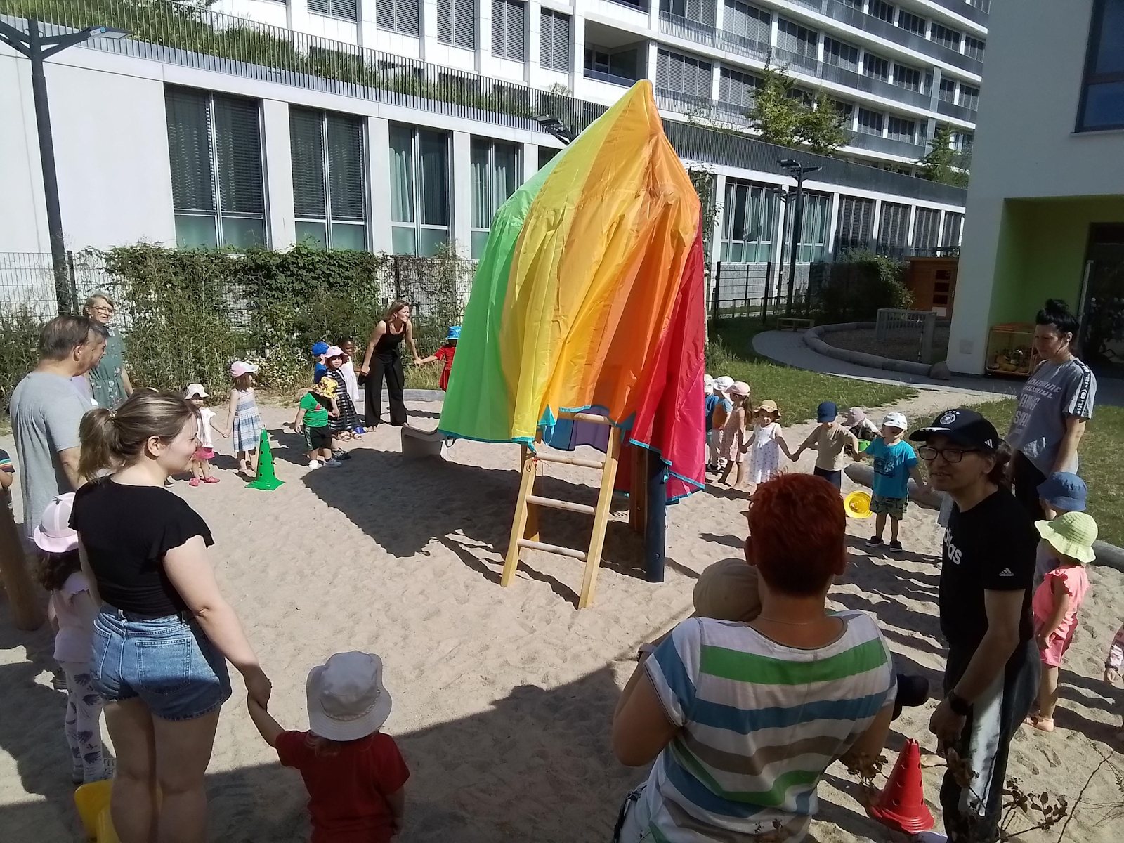 Geschmückt mit Luftballons und verhüllt von einem riesigen Schwungtuch haben sich alle Kinder und Fachkräfte in einem Morgenkreis um den Rutschenturm versammelt. Mit Seifenblasen, einem Countdown, Applaus und Bonbonregen wurde das Gerät schließlich freigegeben. Leonardo durfte selbstverständlich als erstes Kind die Rutsche ausprobieren…