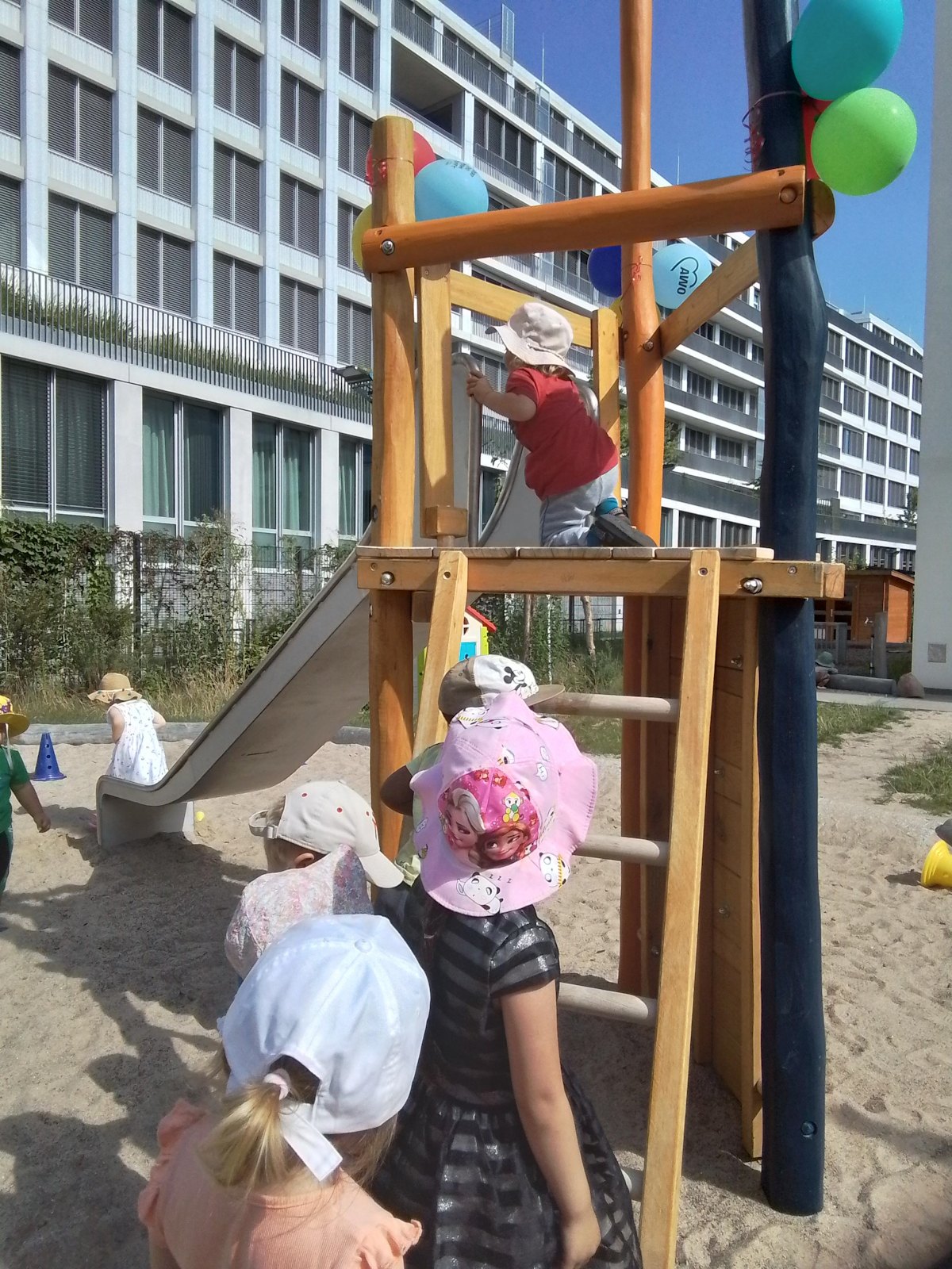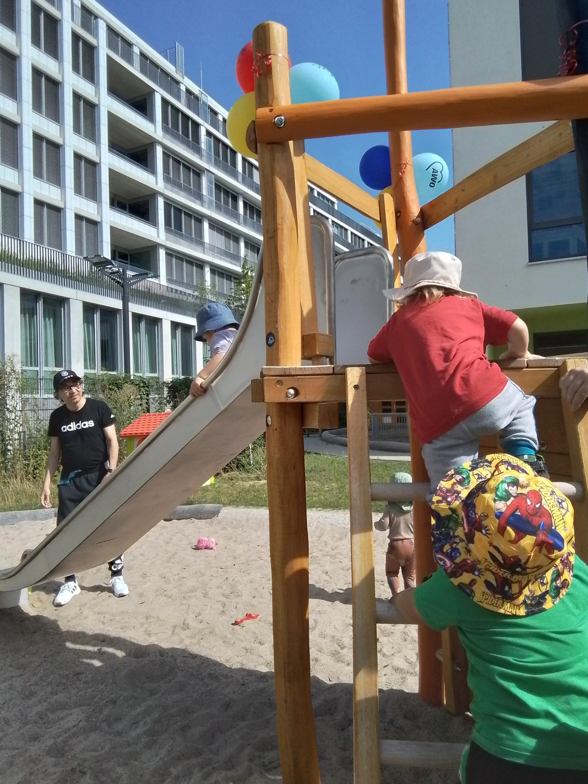 Bereits auf der Eröffnungsfeier unserer neuen Kita am 31. August 2023 hat Leonardo, eines unserer ersten Kinder, gefragt: „And where is the slide?“ (Und wo ist die Rutsche?). Rechtzeitig vor Ende des ersten Kita-Jahres können wir nun feierlich verkünden: „Here it is!“ (Hier ist sie!)