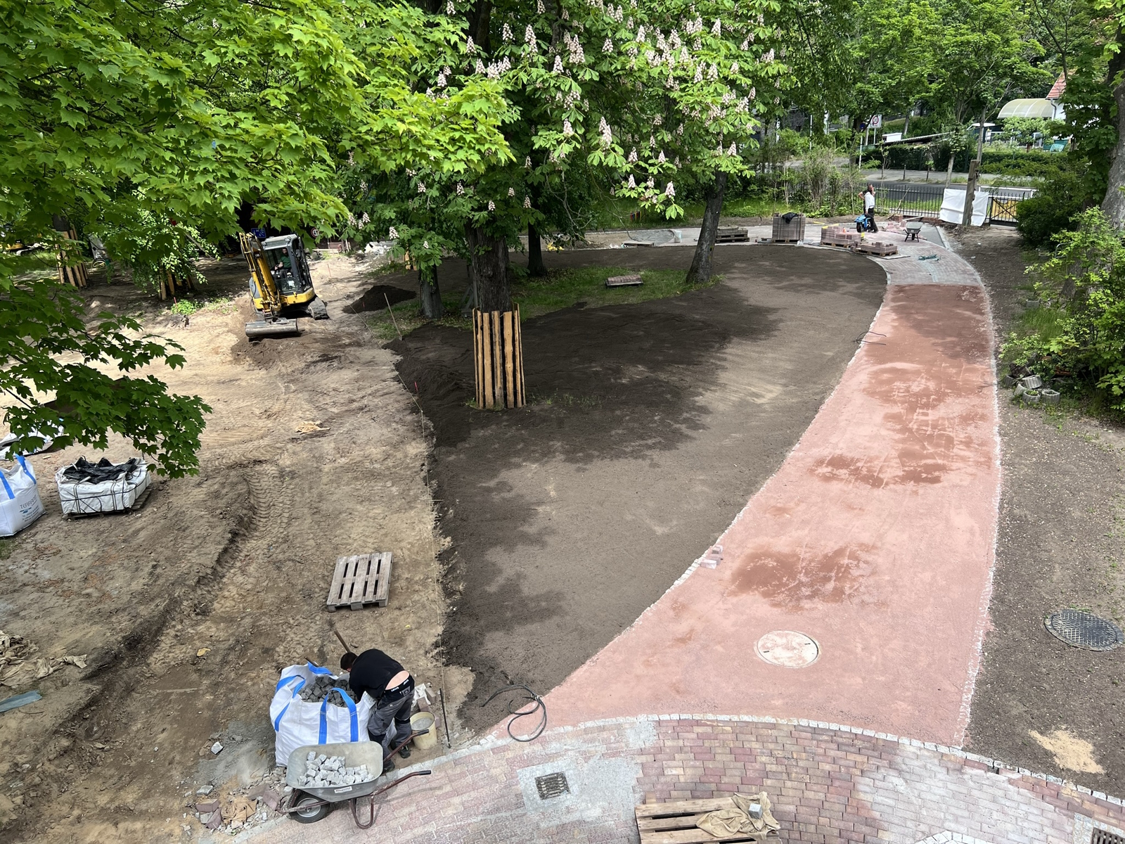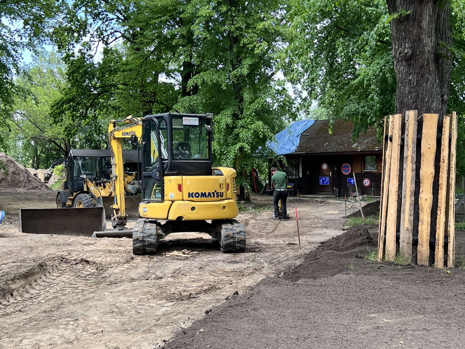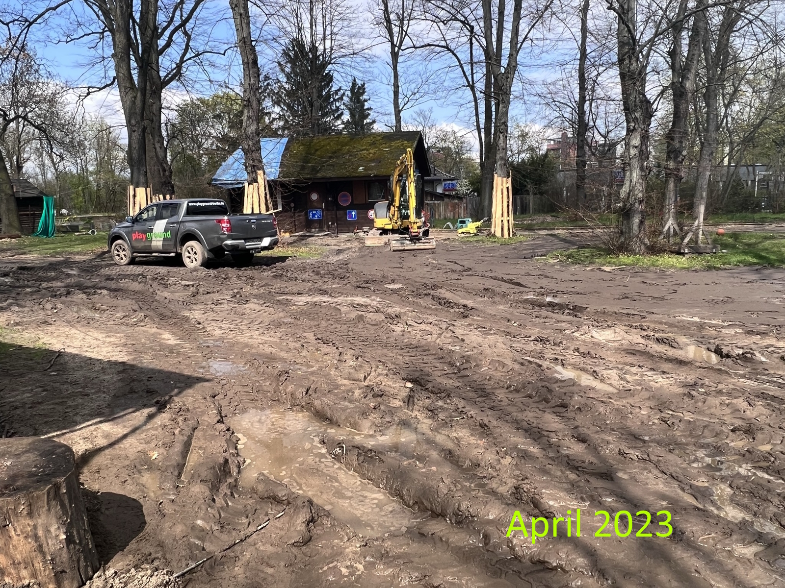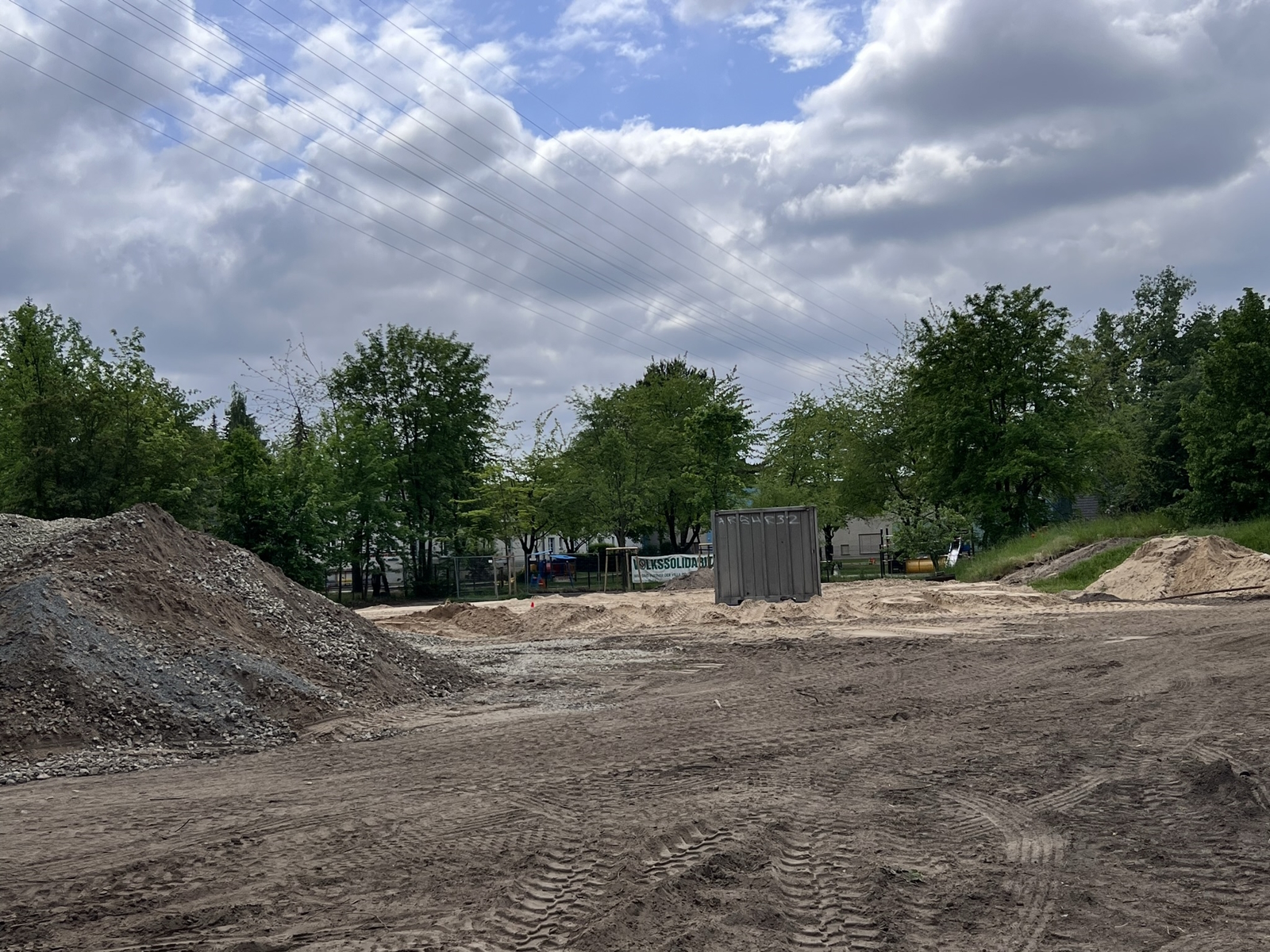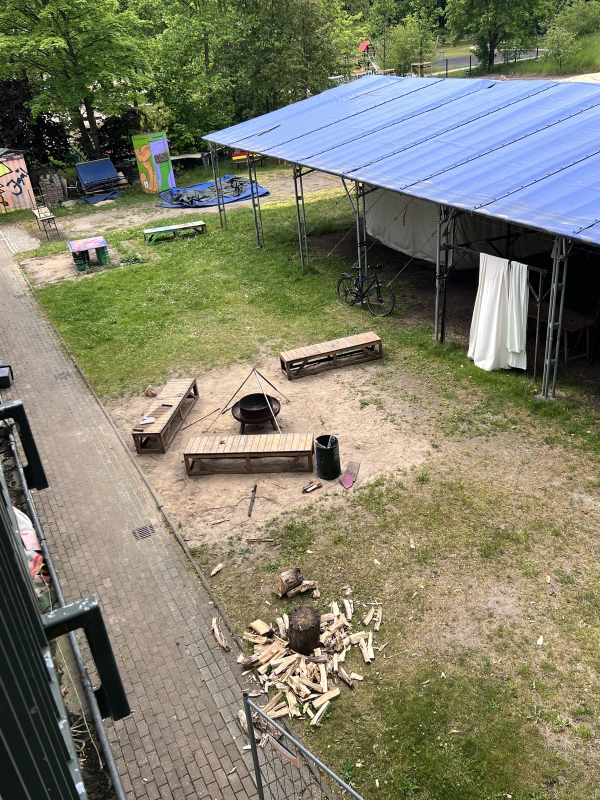 Weiterhin bestimmt der Tiefbau das Geschehen, inzwischen werden die Wege zur Fahrradwerkstatt und weiter ins Gelände gebaut (14). Wo im April noch Schlamm war, ist es inzwischen staubig. Weil Flächen für den Bau geplanter Nutzungen vorbereitet werden (16), ist die Fläche des derzeit nutzbaren Außenbereichs für die Jugendarbeit auf die Fläche des blauen Zeltdachs verkleinert worden. Die gelbe Sandfläche dahinter wird einmal die Sportfläche sein (17). Weil sich am Platz der geplanten Outdoor-Küche gegenwärtig Berge von Erdreich türmen gibt es ein kleines Provisorium am Zelt (18).