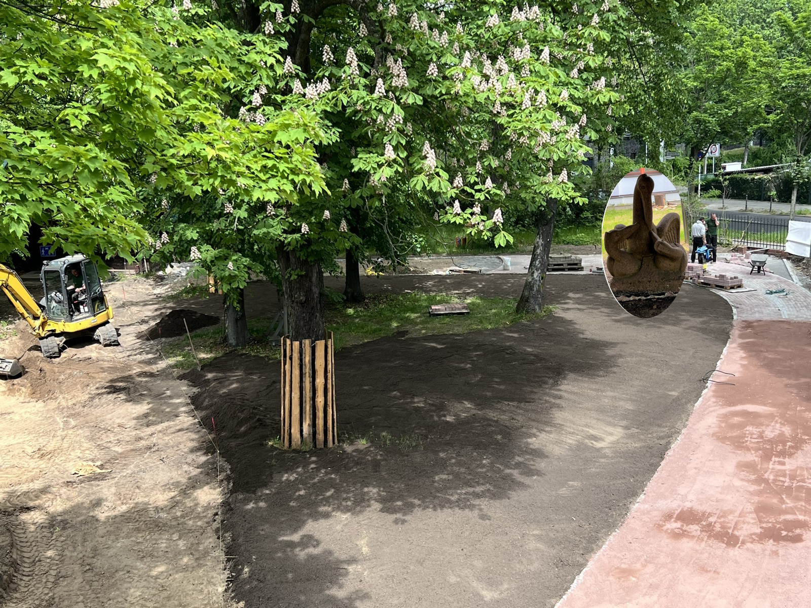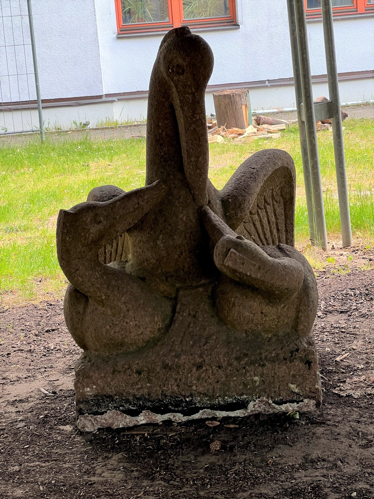 Jetzt ist schon die Bauminsel mit den drei Linden erkennbar, auf der demnächst das Baumhaus errichtet werden wird und wo der Pelikan gegenüber dem Eingangs seinen Platz finden wird. Noch steht er etwas einsam und vergessen unterm Zeltdach neben der Villa. (11, 12)