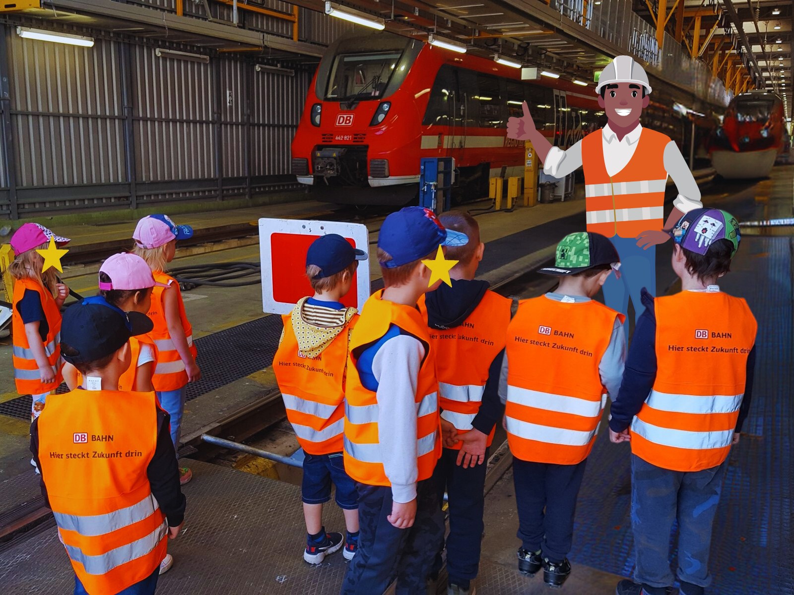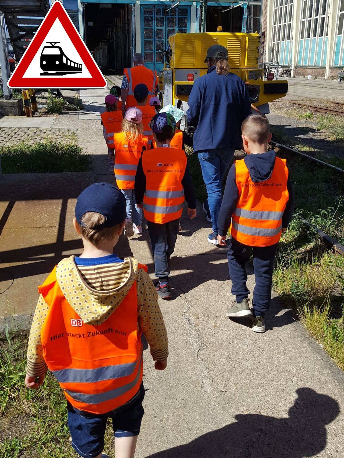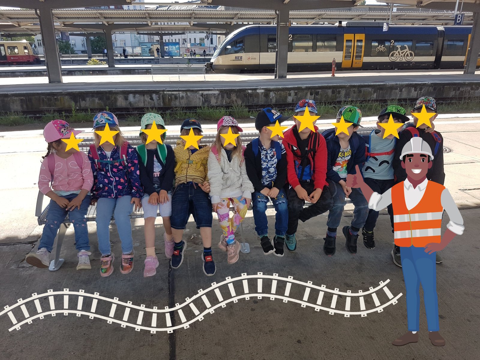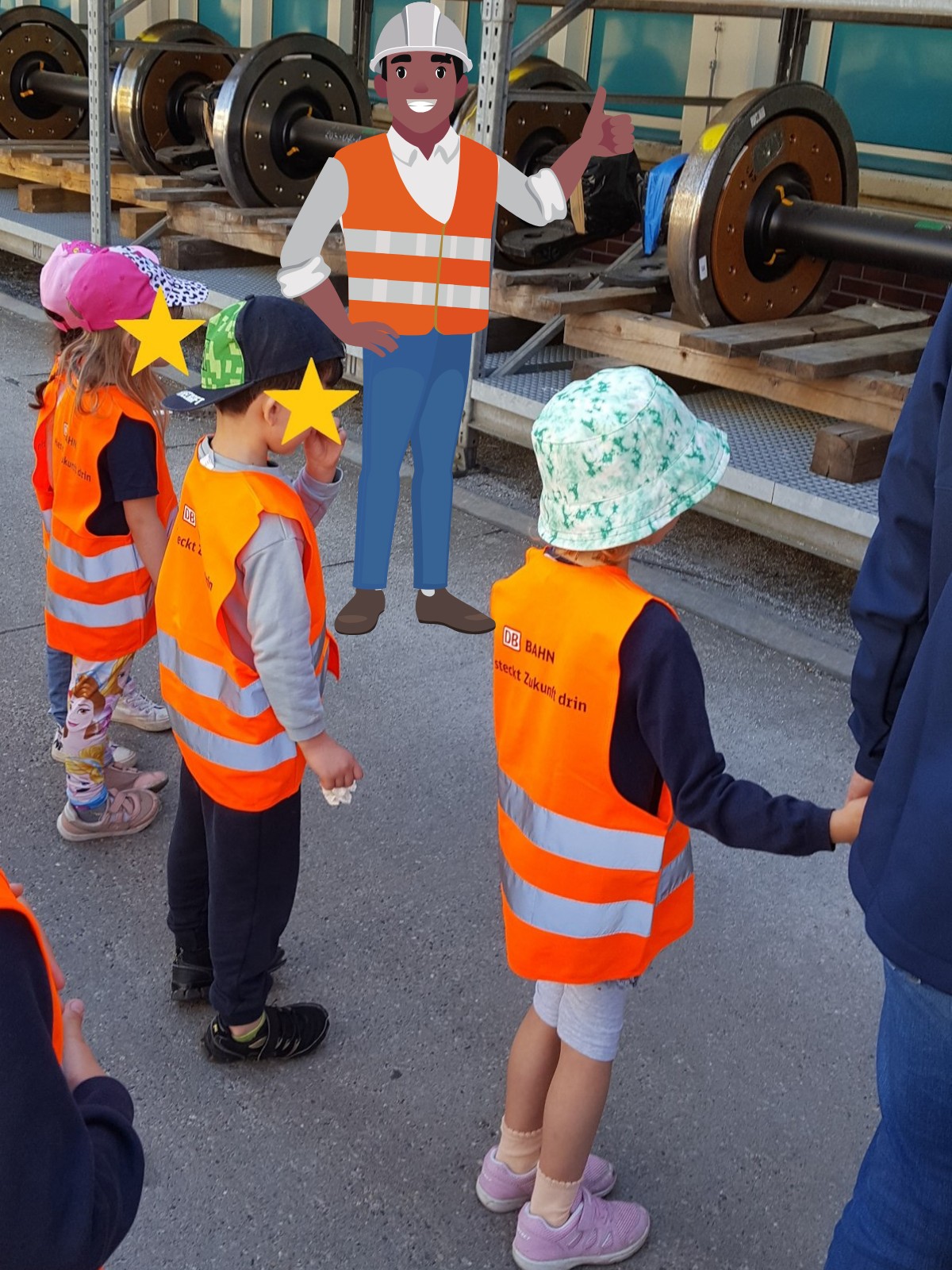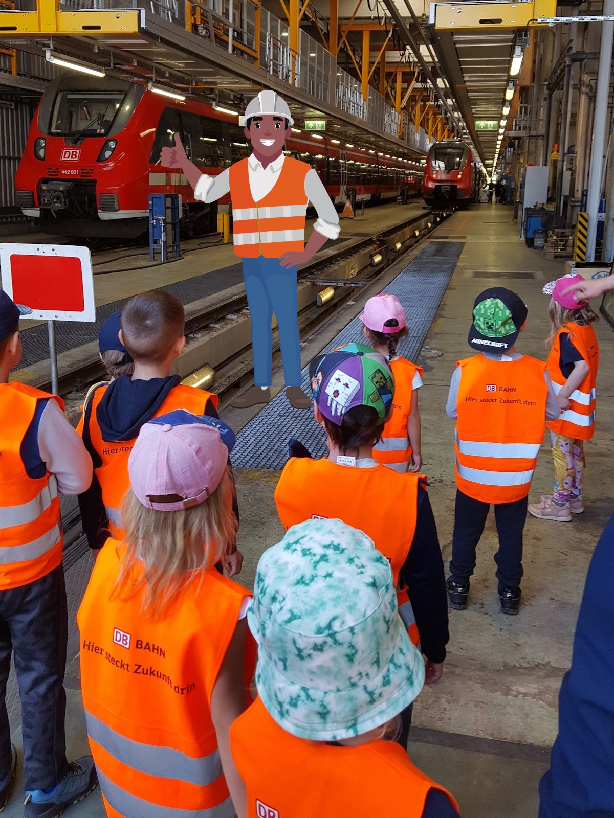 Eine Exkursion der besonderen Art führte die Wuhlehopser Mitte Mai auf das Betriebsgelände der Deutschen Bahn in Lichtenberg. Für die Kinder gab es viel zu entdecken und zu bestaunen – die Werkstatt, den Führerstand eines Zuges oder riesengroße Ersatzräder. Der Tag hielt noch besondere Überraschungen bereit, eine Fahrt im Zug durch die Waschstraße und zum Mittagessen ein Picknick in der ersten Klasse. Als Andenken an diesen aufregenden Tag gab es noch einen kleinen Rucksack, eine Warnweste, ein kleines Spiel und ein Kuscheltier.