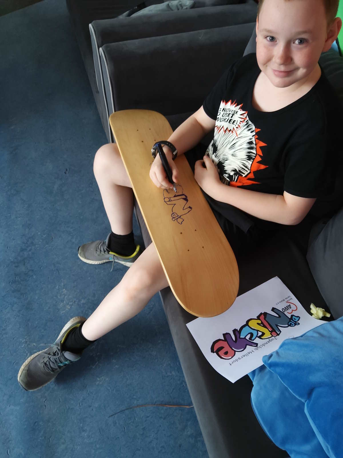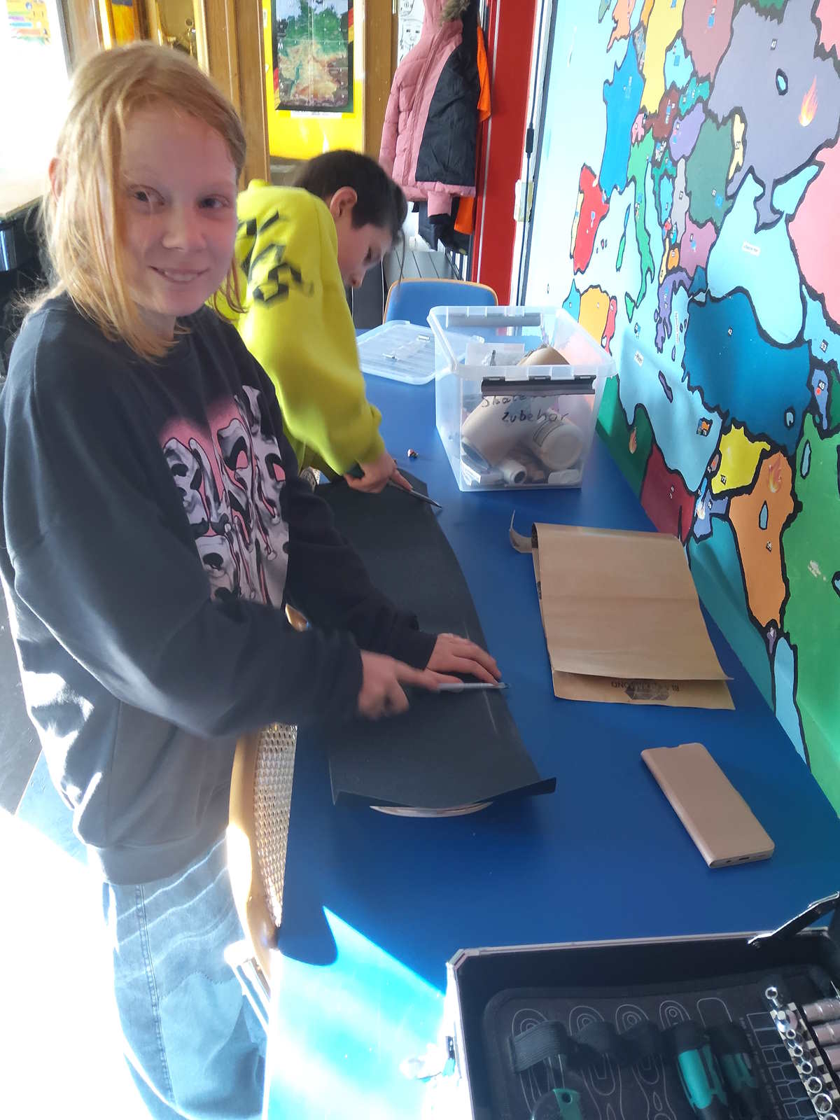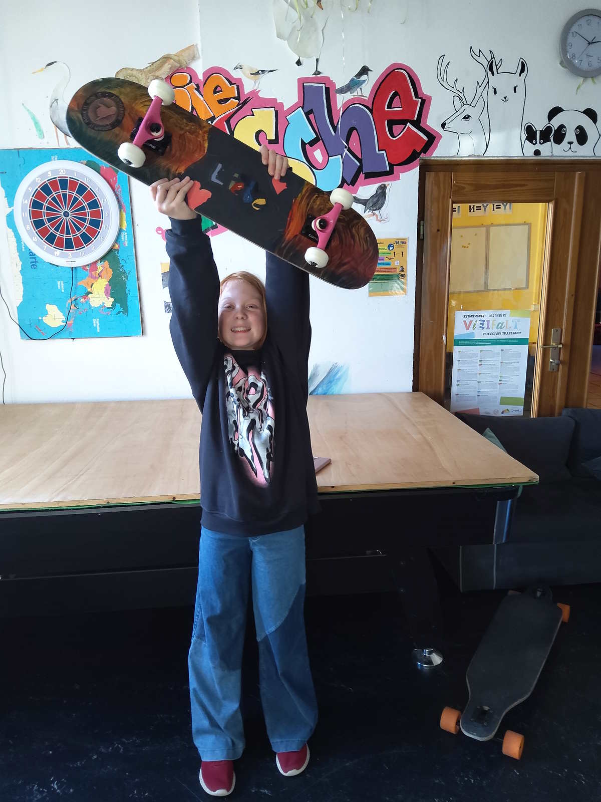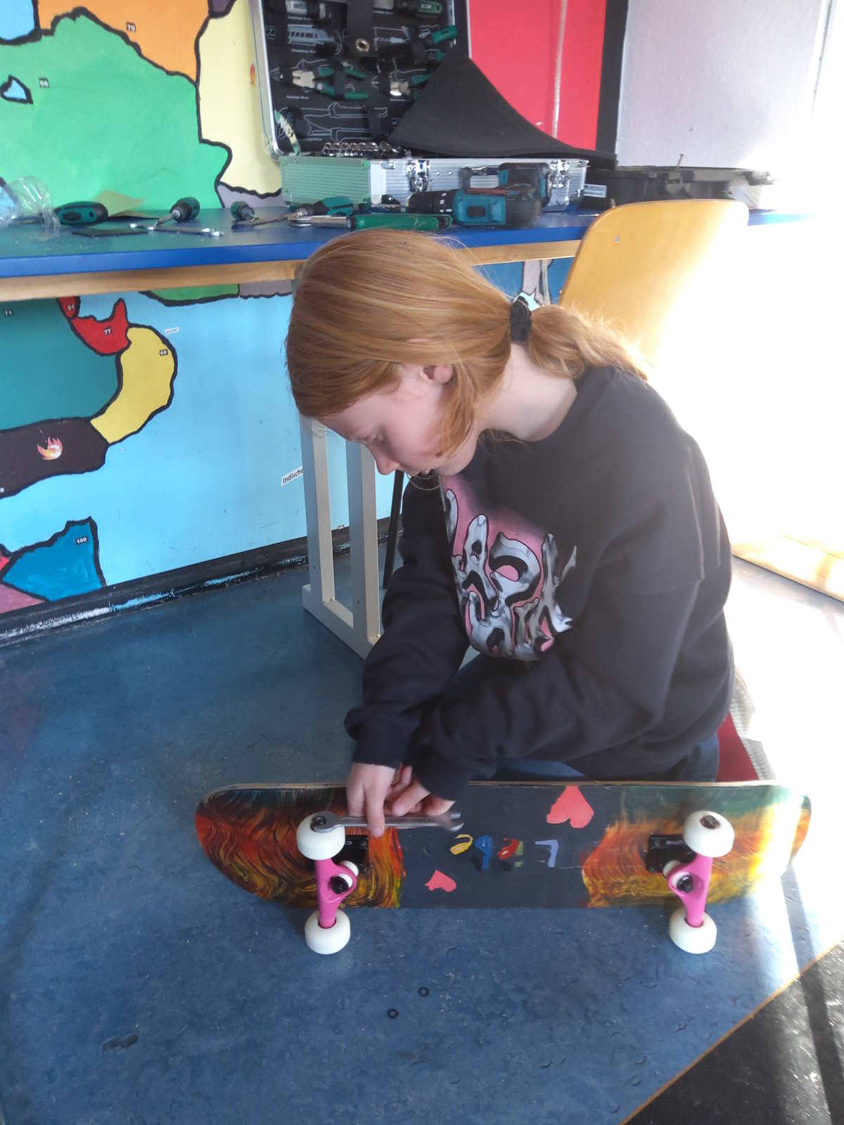 Mittlerweile wurden in der Nische schon zwei Skateboards gebaut. Alles wird selbst gemacht – das Leimen der Furniere, das Schleifen, die Grundierung und die Bemalung. Danach werden die Achsen und Rollen geschraubt und zum Schluss das Griptape aufgeklebt. Ein Board selbstgemacht ist schon etwas Besonderes.