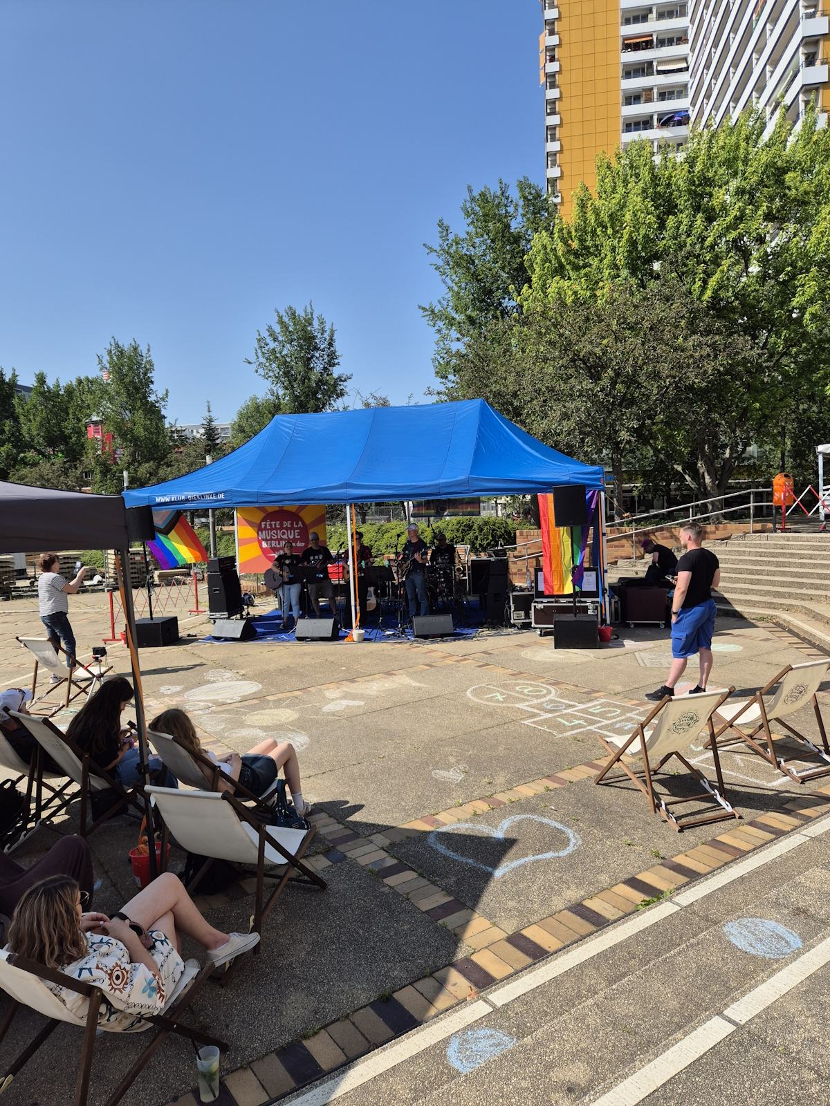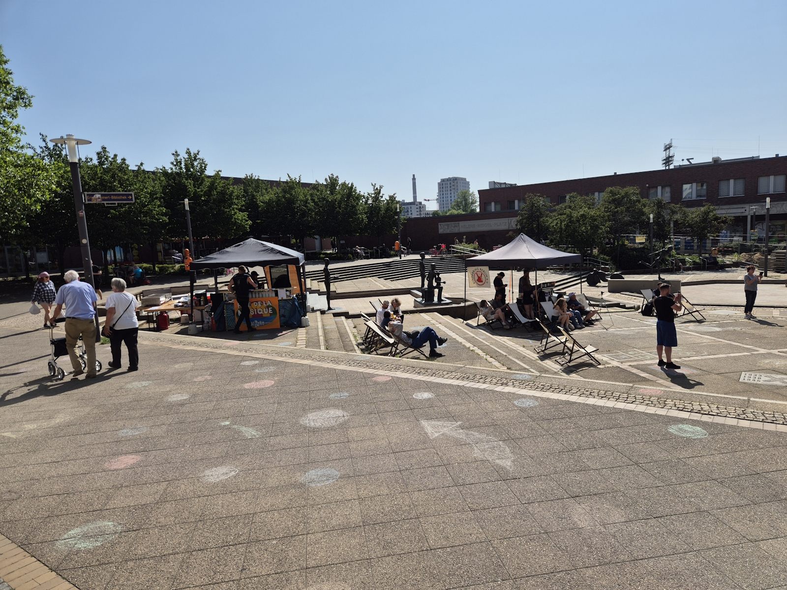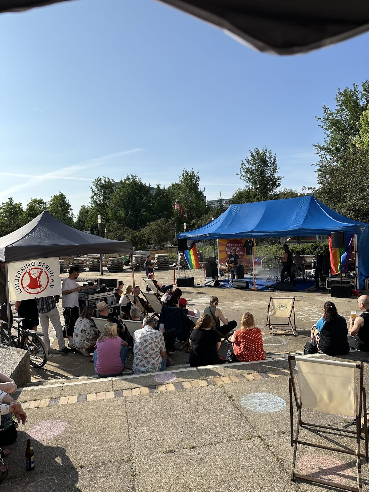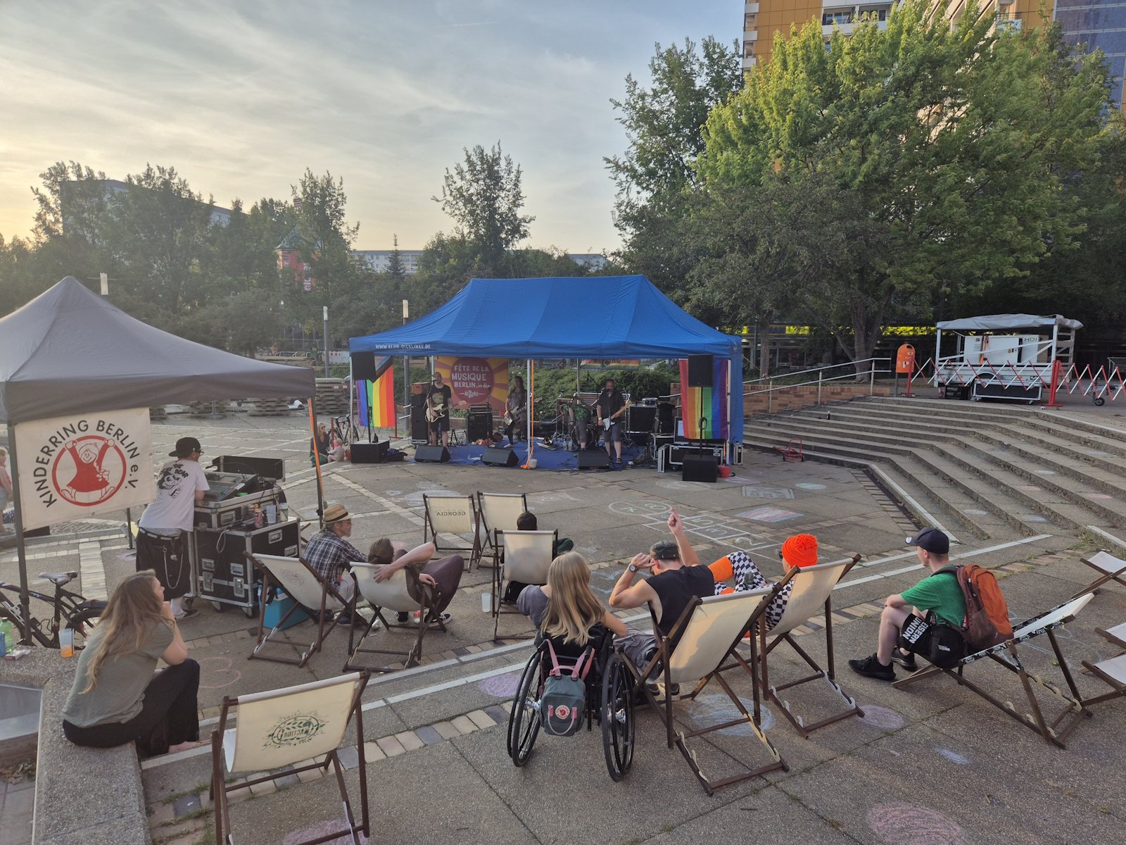 Die JFE Balzerplatz ist schon traditionell dabei, wenn es zum Sommeranfang bei der Fête de la Musique heißt, heute gibt es Musik umsonst und draußen und Bands und Clubs zum Musizieren, Tanzen und Singen einladen. In diesem Jahr wurde ein neuer Weg begangen – gemeinsam mit dem Jugendkulturzentrum „Die Klinke“ des Kinderring Berlin e.V. wurde von 16 bis 21 Uhr den Helene-Weigel-Platz mit 4 Bands bespielt. Der Sommeranfang zeigte sich gleich hochsommerlich und der heiße Betonplatz mit wenig Schatten verlangte von allen – von Organisator*innen, Bands und Publikum – eine ganze Menge. Doch die Musik, das Essen und vor allem das Trinken bewegten die Passant*innen zum meist kurzen Verweilen und Lauschen.