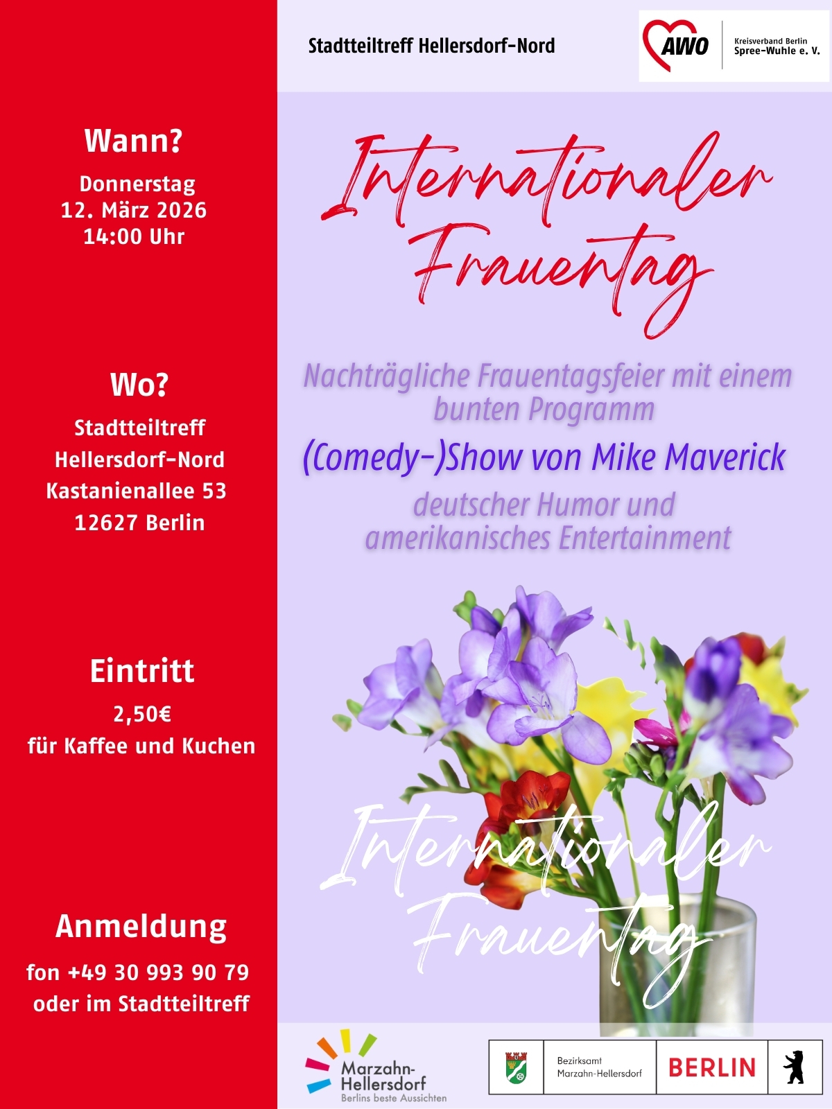 Am 12. März 2026 gab es im AWO Stadtteiltreff eine (Nach)Frauentagsfeier. Mike Maverik, Bauchredner und Entertainer, sorgte für viele Lacher und brachte die Besucher*innen sogar zum Mitsingen. Die Stimmung im Raum war bei Kaffee und Kuchen fröhlich und ausgelassen.