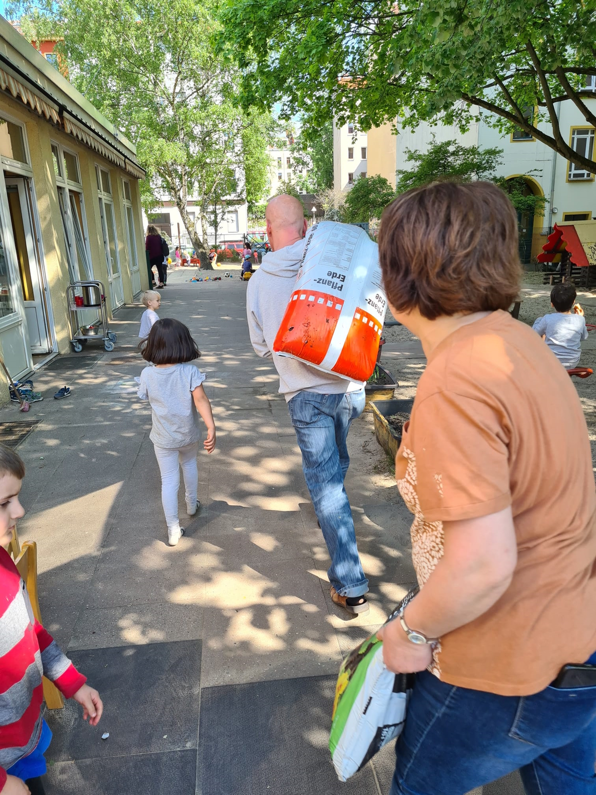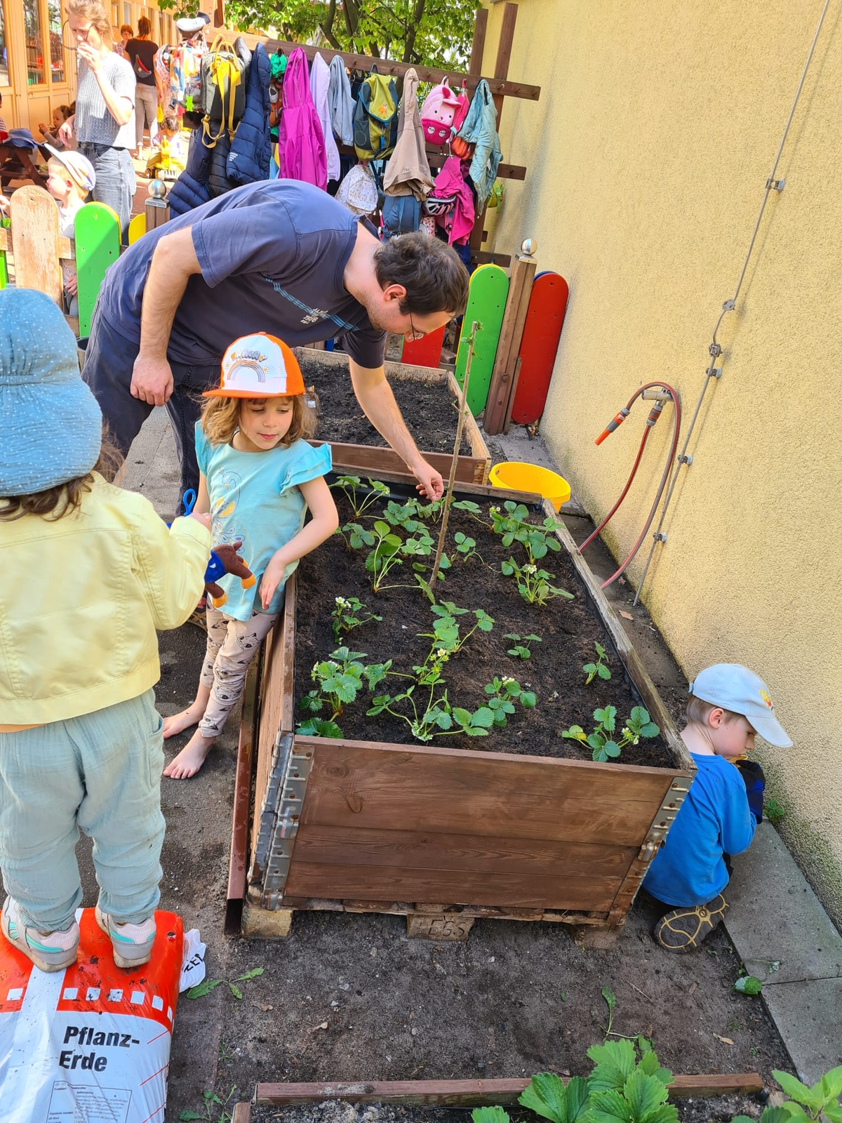 Eltern brachten Pflanzerde und Blumen und Pflanzen mit. Es wurden Hochbeete bepflanzt, es wurde gefegt und geputzt.