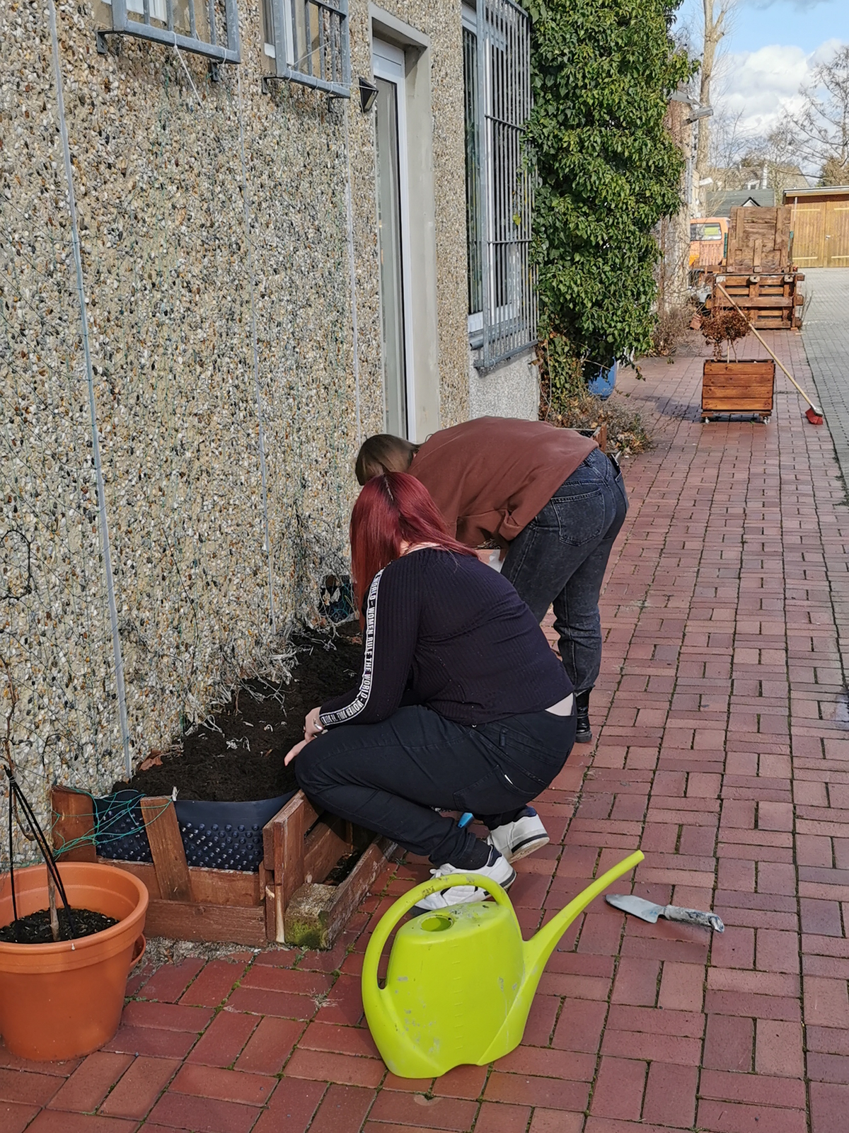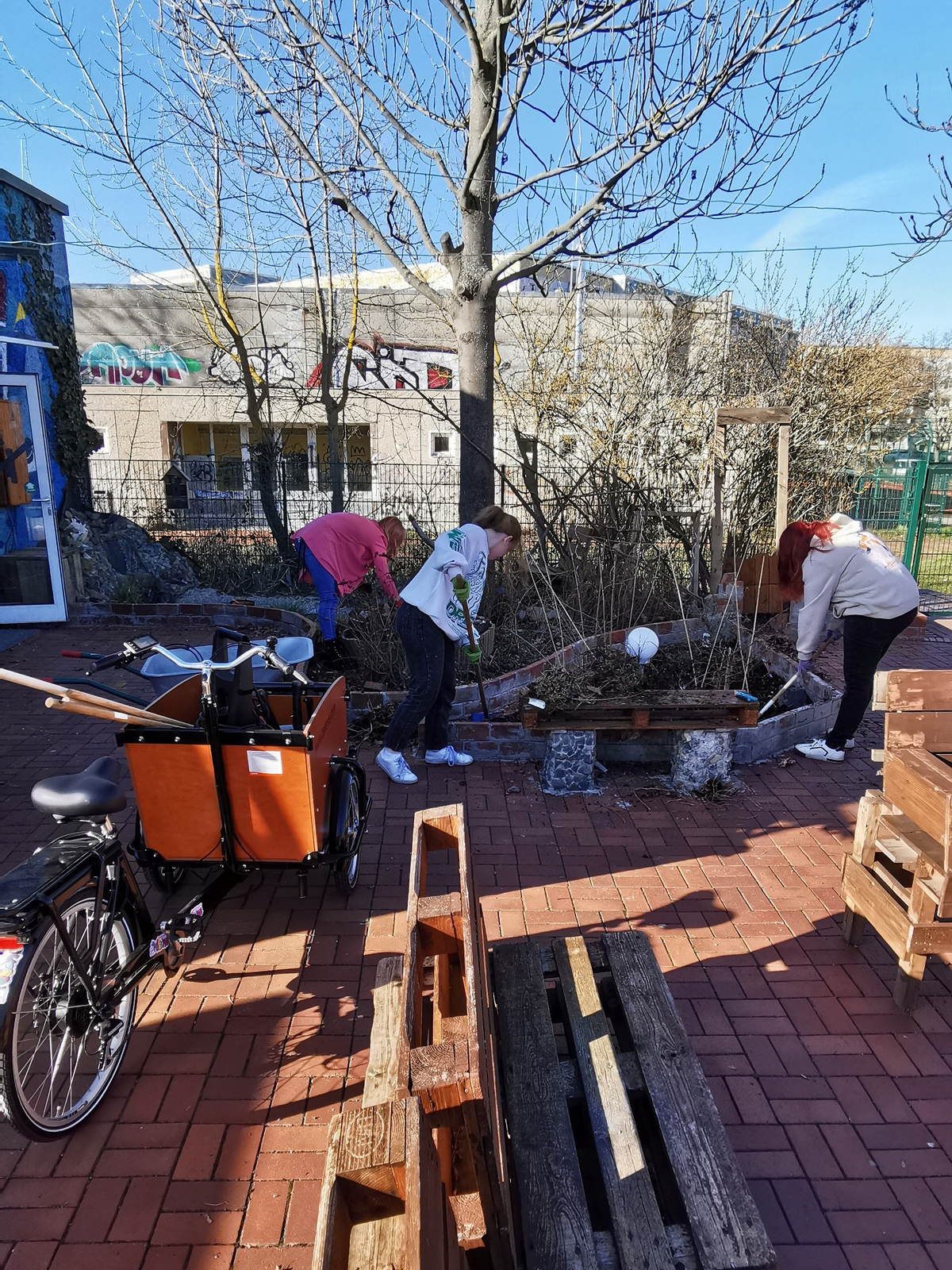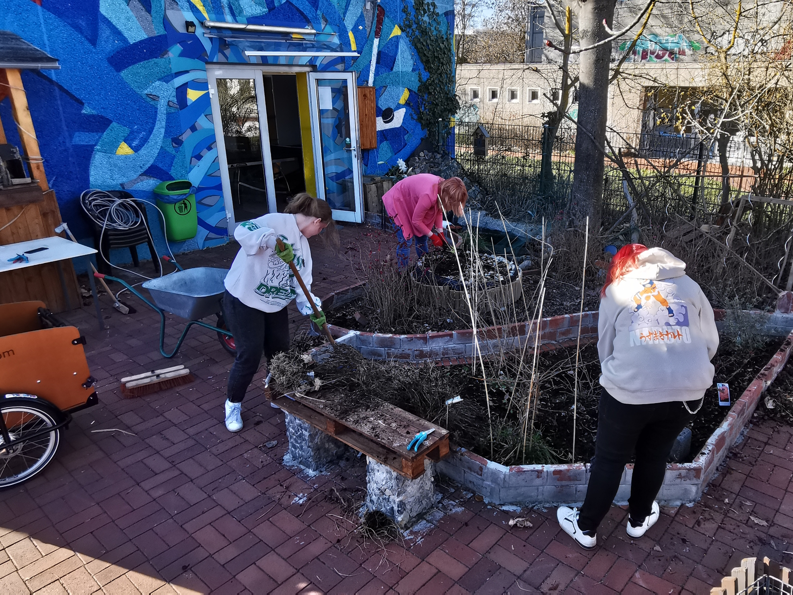 Die ersten sonnigen Tage wurden genutzt, um die Außenfläche aufzuhübschen. Mit dem Nische-Lastenrad wurden aus der Villa Pelikan Gartengeräte abgeholt und dann wurde losgelegt. Pflanzenreste wurden entfernt, Laub weggefegt. Die Teichpumpe gestartet und Gemüse eingepflanzt. Zugleich wurde durch den Ehrenamtler Marco Platz für das neue Gewächshaus geschaffen. Das Gewächshaus, eine Spende von Freiwilligen, wird bald aufgebaut werden. Dazu später mehr.