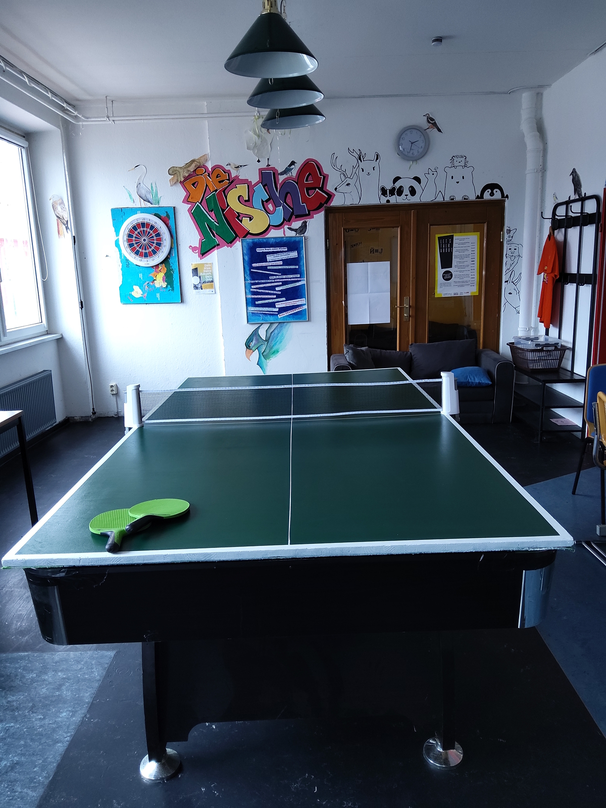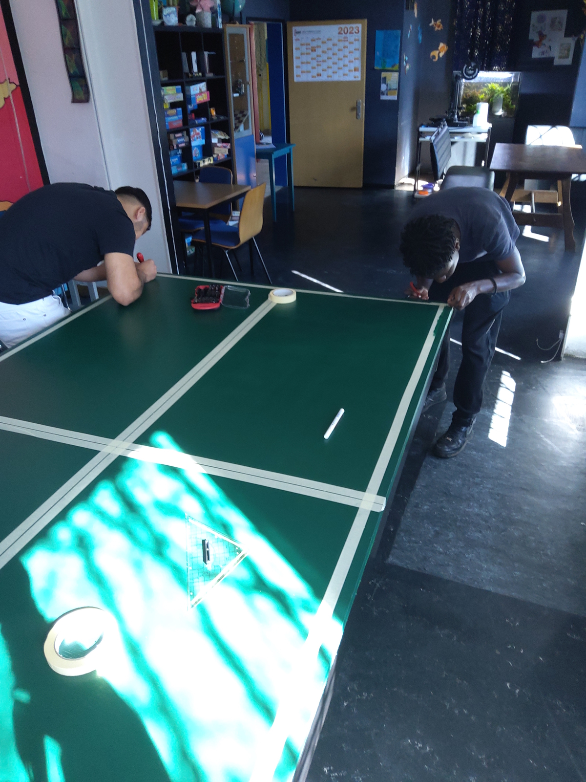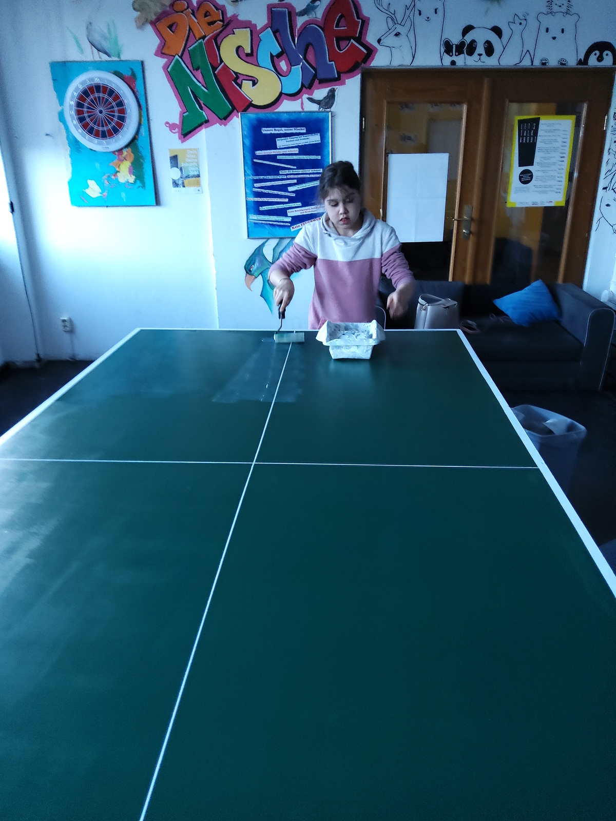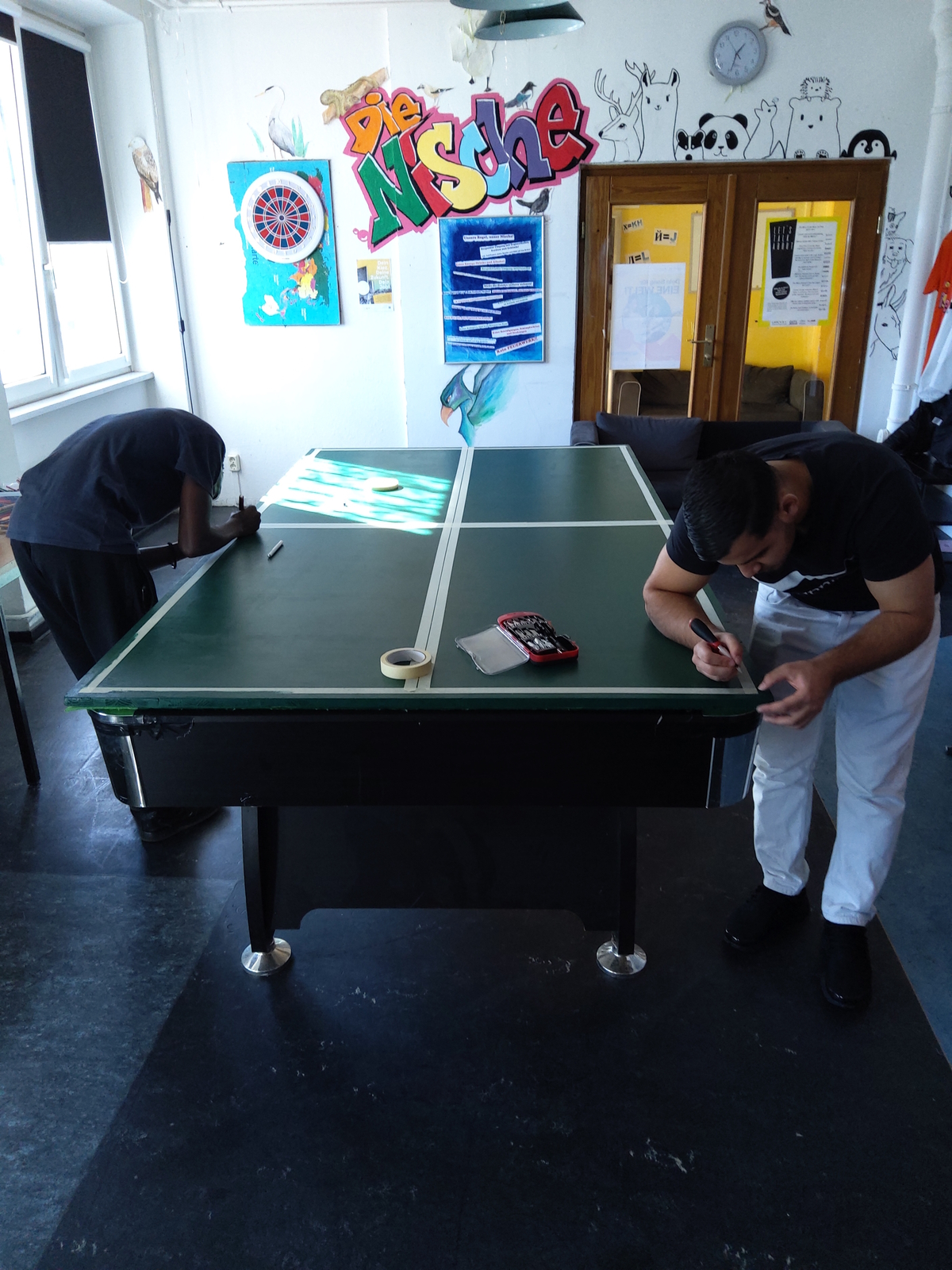 In den Innenräumen haben Schülerpraktikanten und einige andere Jugendliche die Holzabdeckung vom Billardtisch in eine Tischtennisplatte umgewandelt. Hier können nun zwei Sportarten ausgeübt werden. Die Umgestaltung der Platte ist eine wahre Meisterleistung, man beachte die geraden Linien! Einfach großartig!