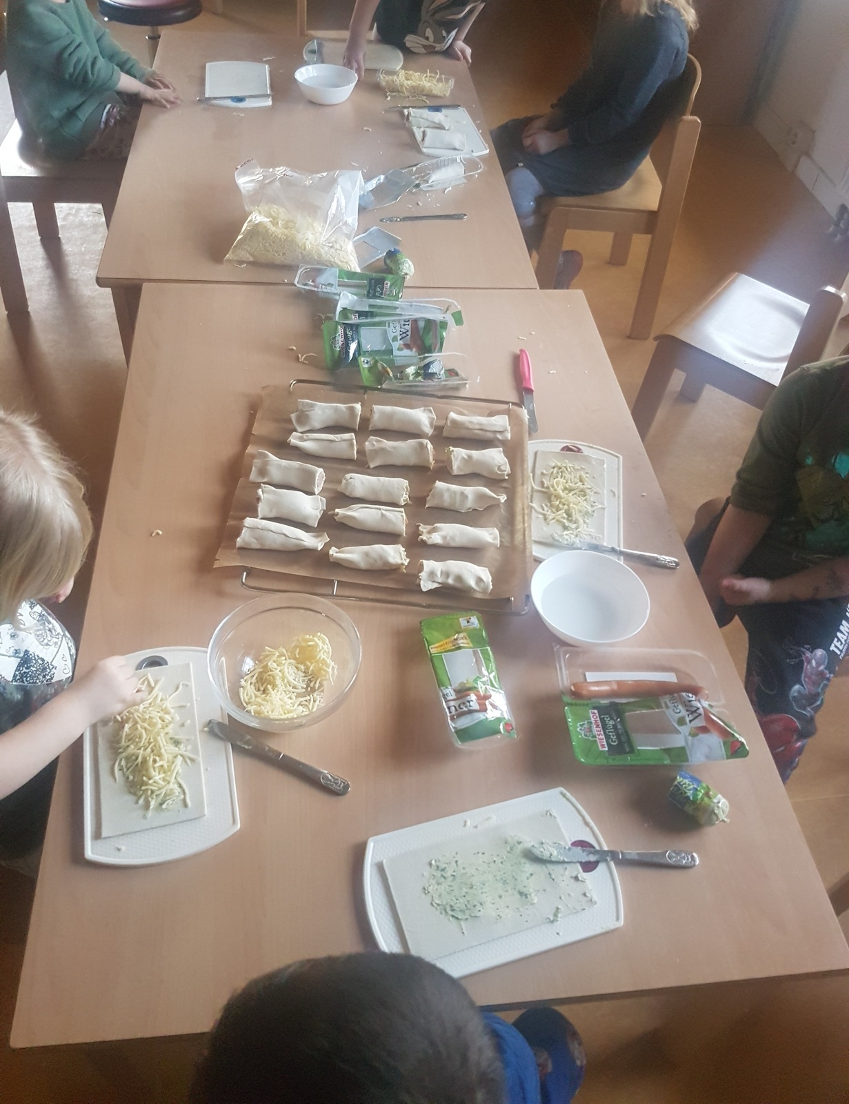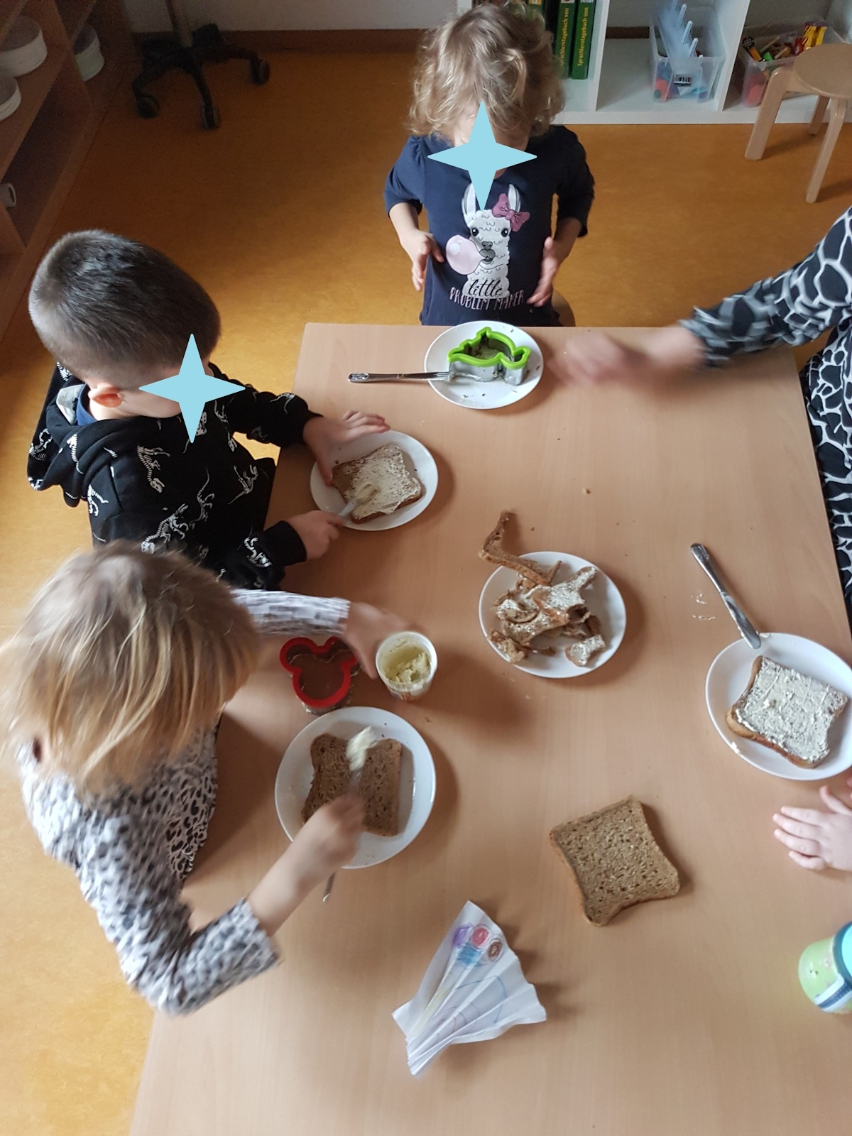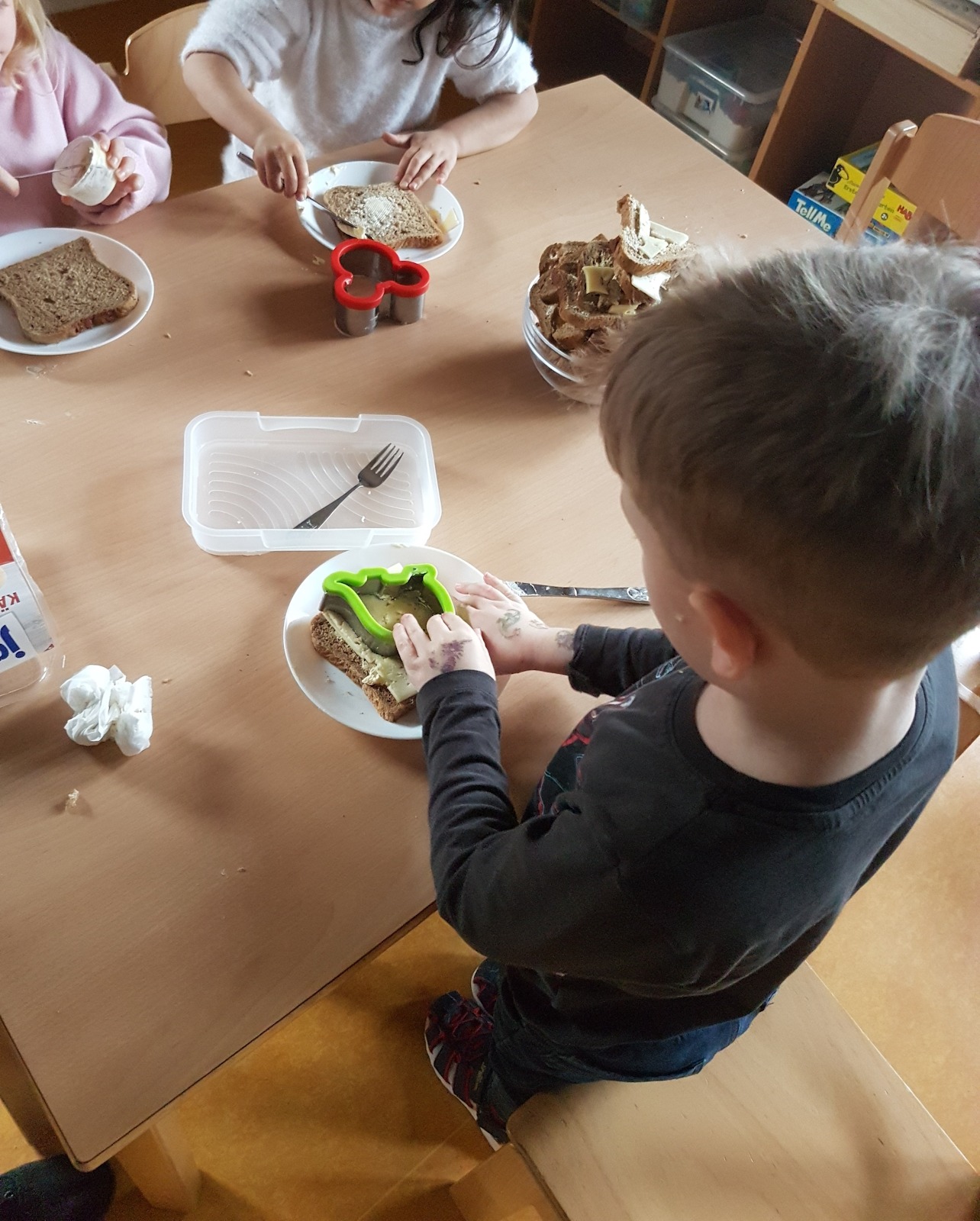 Die Vorbereitung für Frühstück und Vesper wird fleißig von vielen Wuhlehopsern unterstützt, das macht ihnen viel Freude und unterstützt sie zugleich spielerisch im Kompetenzerwerb