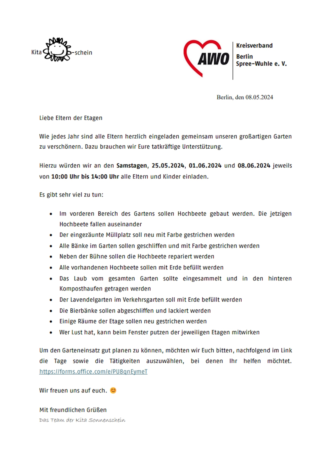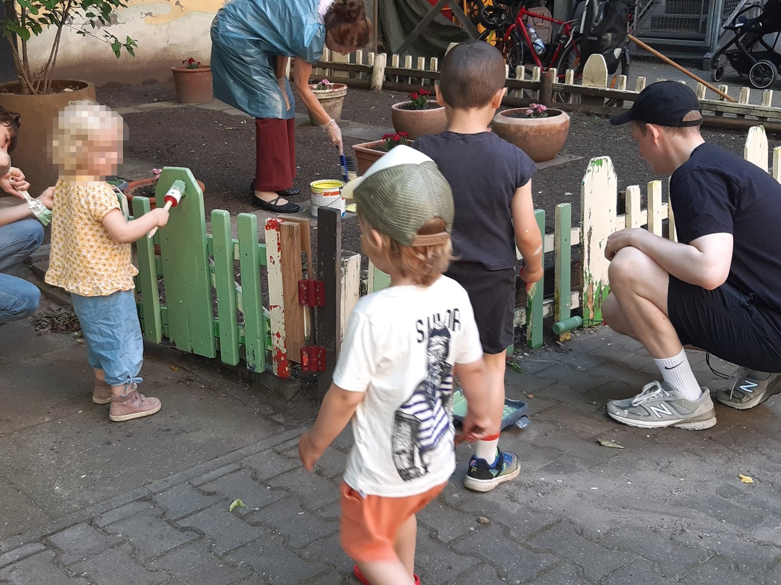 An drei Samstagen Ende Mai und im Juni jeweils von 10 bis 14 Uhr fanden in der Kita Sonnenschein Garteneinsätze mit den Eltern und Kindern statt. Die Kita Sonnenschein hat einen großen, wunderschönen Garten. In einem solchen Garten gibt es immer und besonders im Frühling viel zu tun. Da war es klug, gleich drei Termine zu nutzen. Und viele Eltern und Kinder packten tatkräftig mit an, um den Garten zu verschönern.
