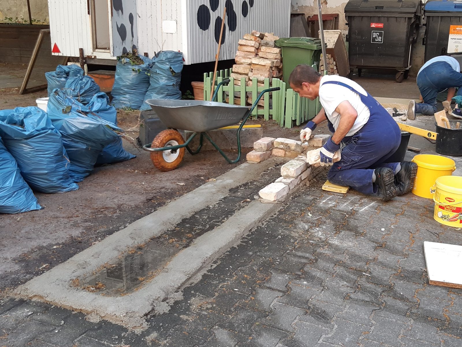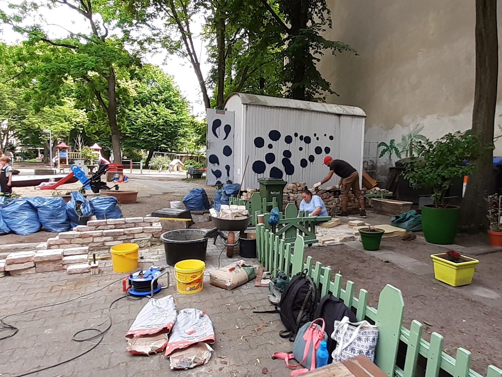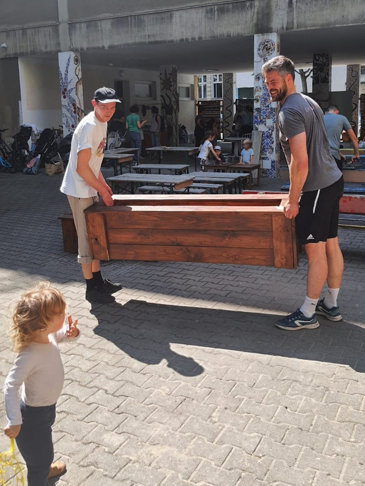 Es wurden neue Hochbeete gebaut, da die alten schon auseinanderfielen. Auch die Hochbeete neben der Bühne wurden repariert werden. Anschließend wurden alle Hochbeete mit Erde befüllt, um sie zu bepflanzen.